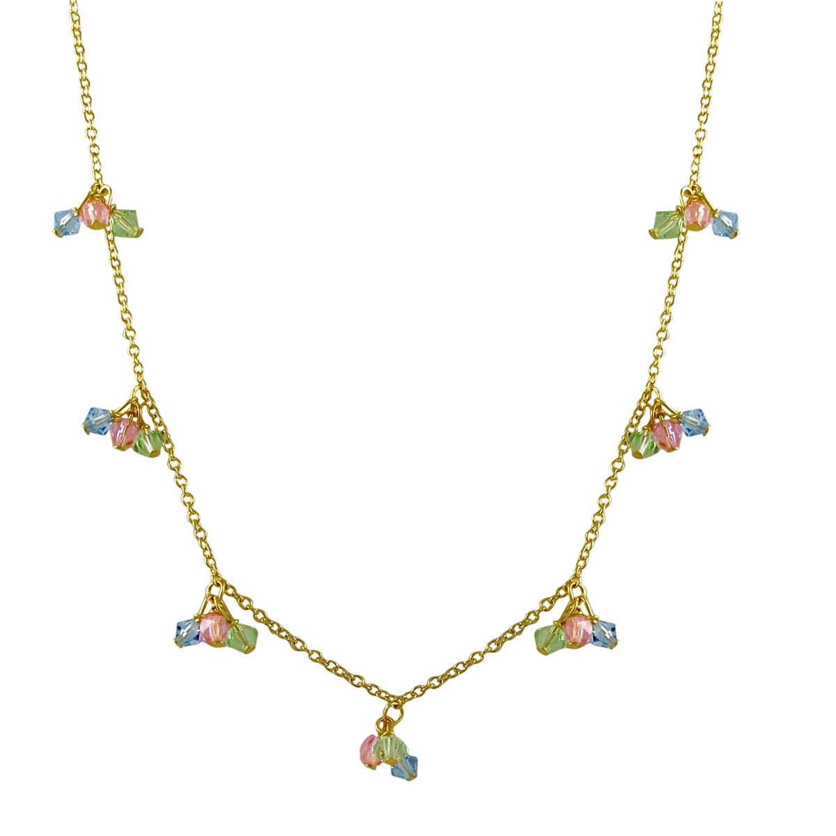 Assorted Lt. Colors Crystal Beads Dangling. Gold Tone Brass Necklace.