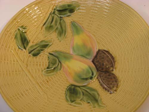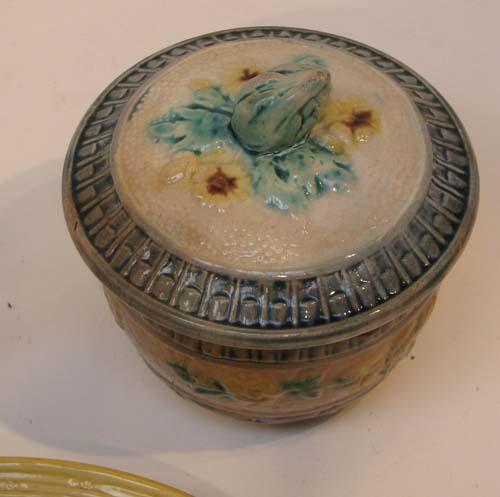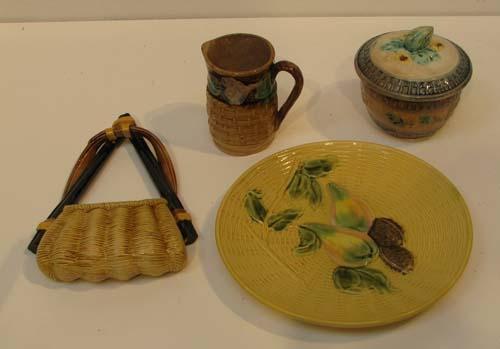 Title: Assorted Majolica including wall pocket, creamer, Zell handpainted 2230 plate, lidded acorn dish