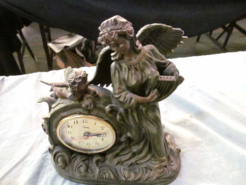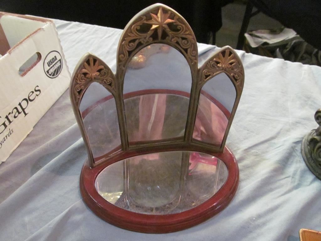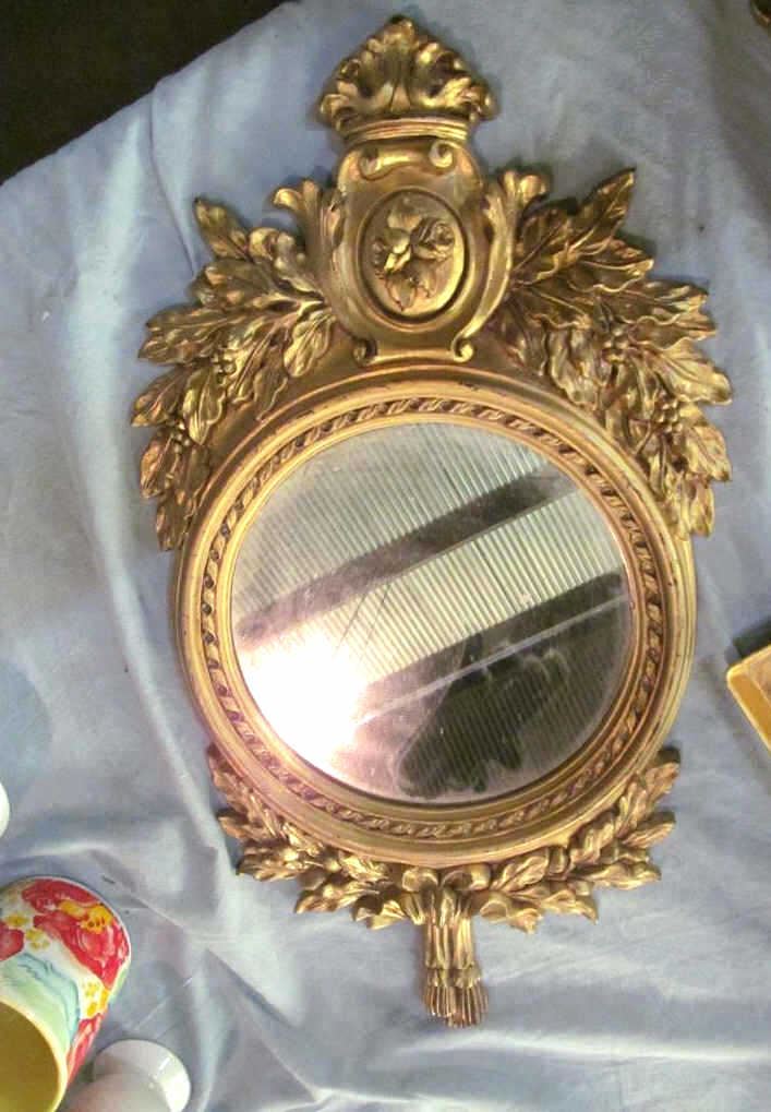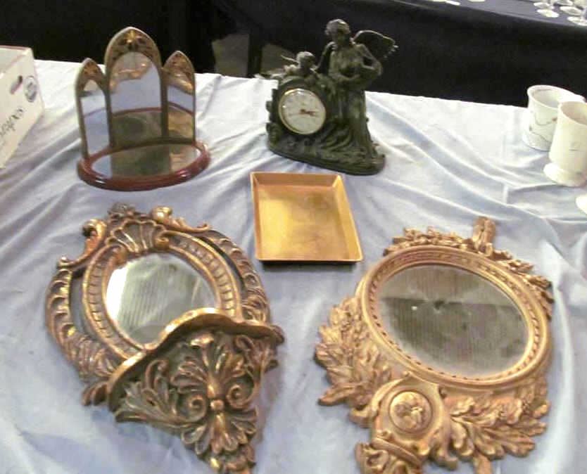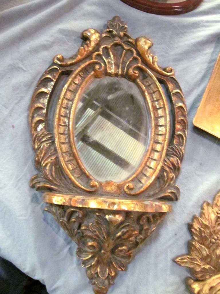 acanthus style mirror shelf approx 18" tall, acanthus style mirror approx 18". gold leave tray approx 9", angle clock has a couple chips but still is nice...