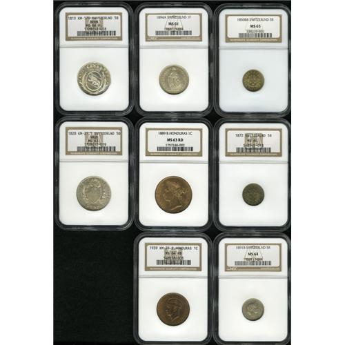 <B>Assorted NGC Certified Minors, </B></I>Switzerland-Bern 5 Batzen 1810 MS66 PL, Vaud 5 Batzen 1828 MS63, Confederation 5 Rappen 1850BB MS65, 5 Rappen 1872 MS64, 5 Rappen 1891 MS64 and Franc 1894 MS61, plus British Honduras Cent 1889 MS63 RED and Cent 1939 MS64 RB.