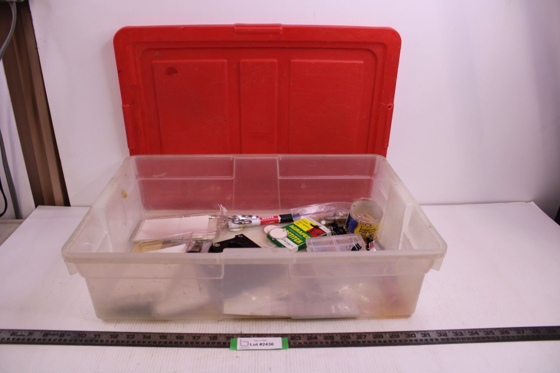 Assorted Office Supplies (Tape Measures, Staple Gun, Lapel Cards, Labels), Plastic Storage Bin 22.5"