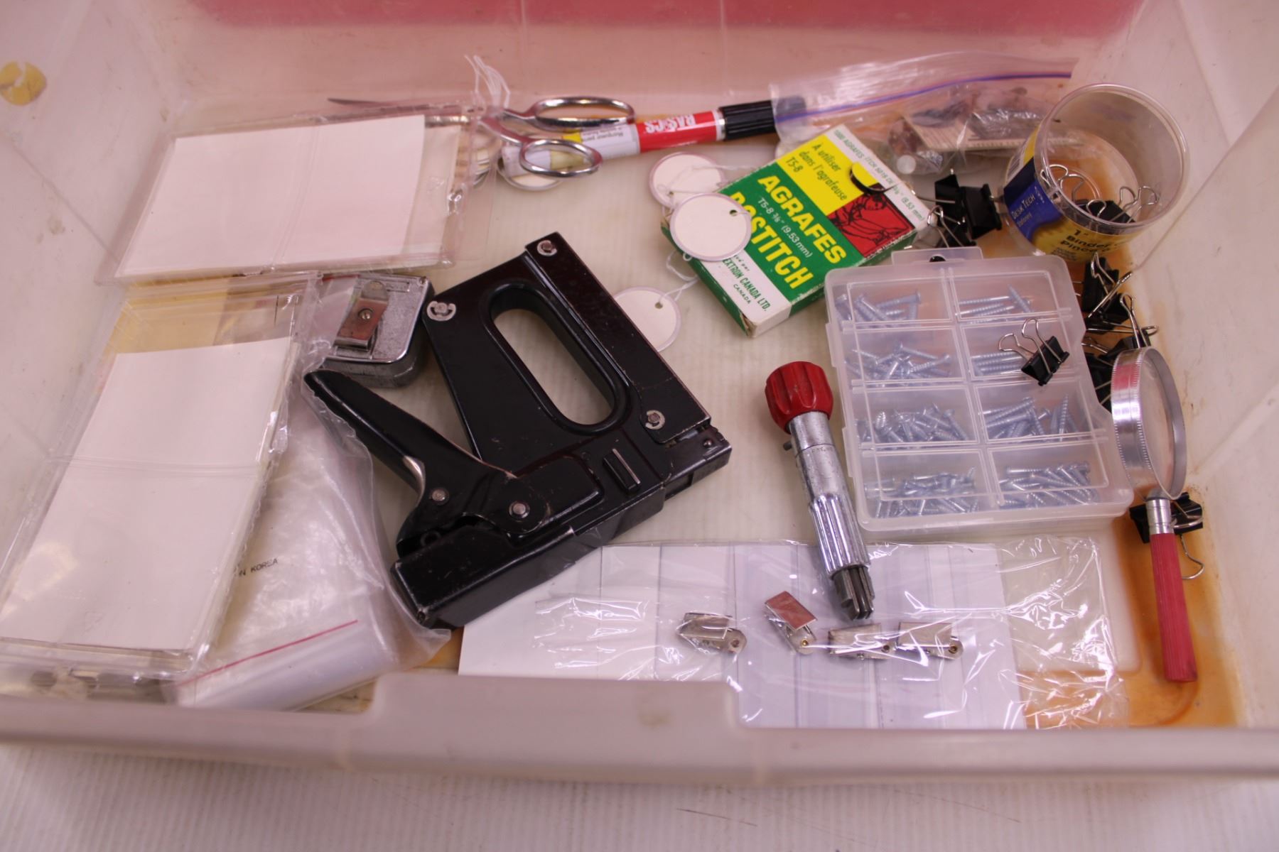 Assorted Office Supplies (Tape Measures, Staple Gun, Lapel Cards, Labels), Plastic Storage Bin 22.5" x 16.5" x 6"
