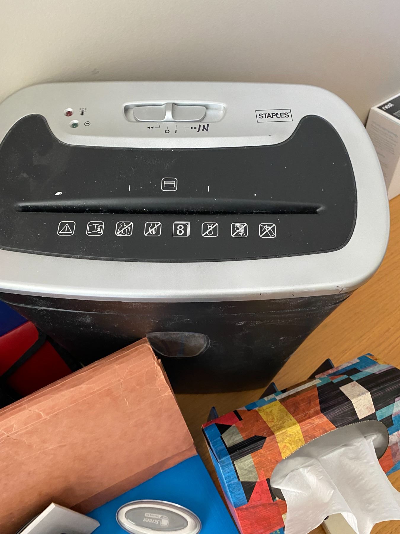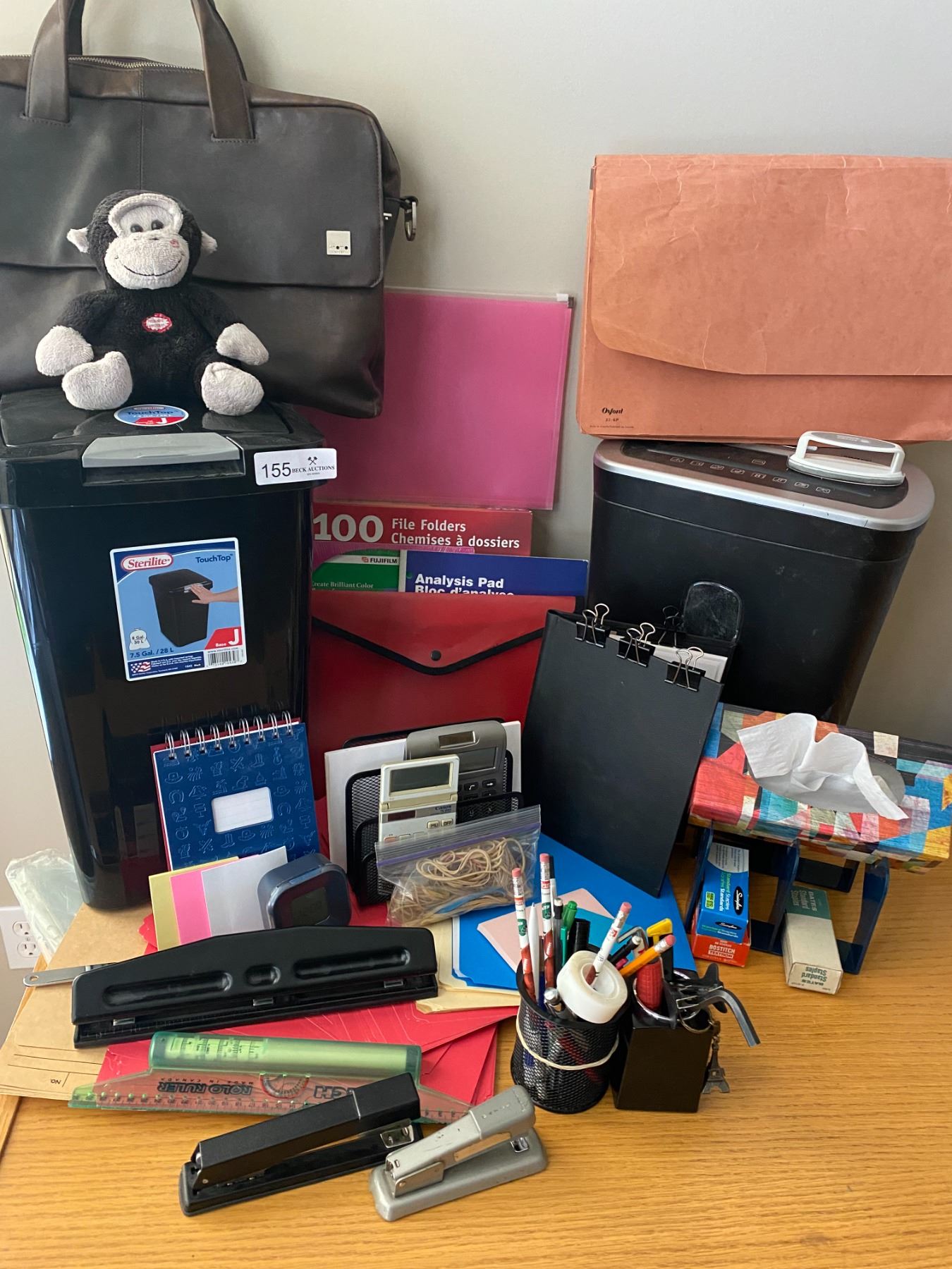 Includes paper shredder, hole puncher, 2 x staplers, 2 x calculators, folders, garbage bin, bag, and more!
