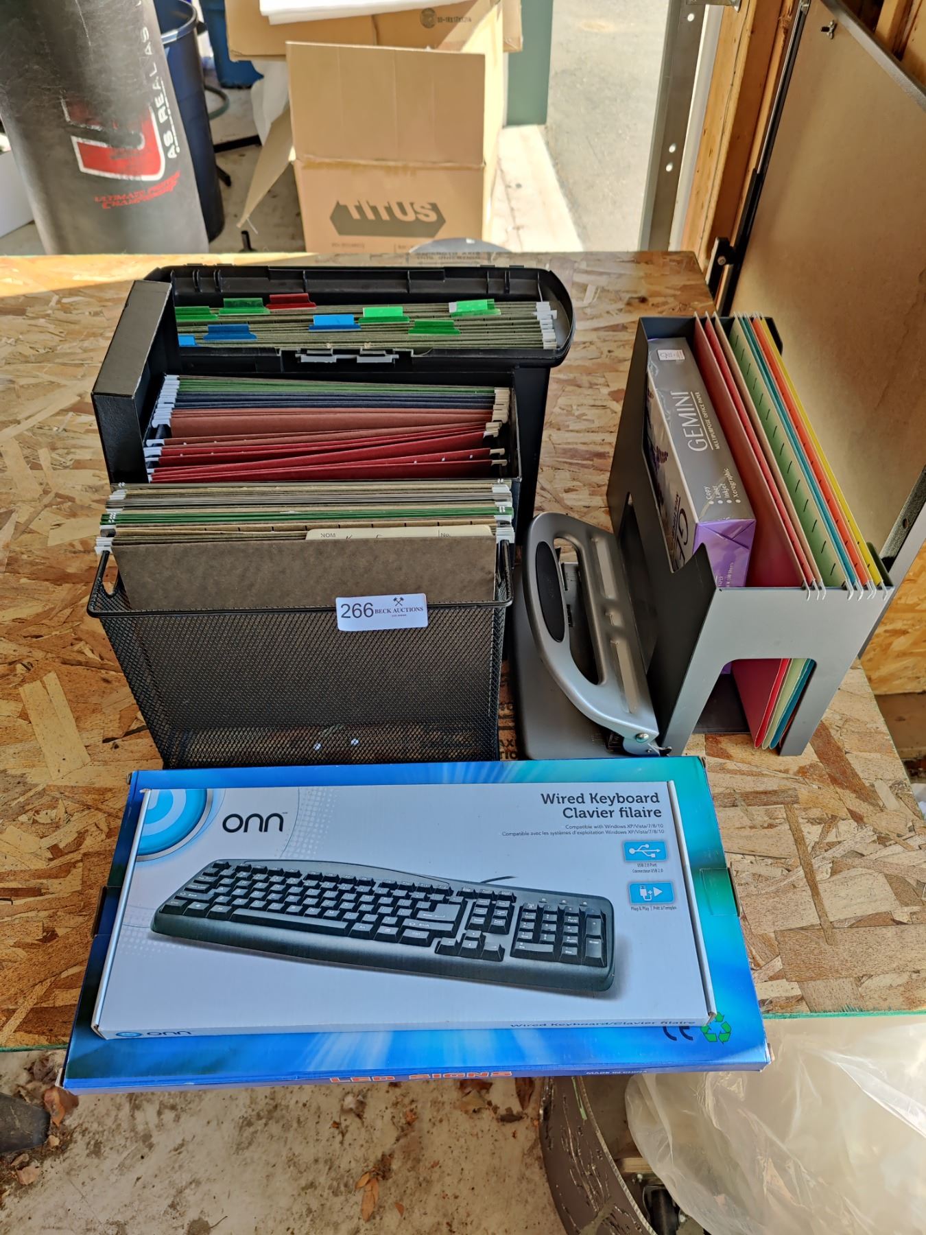 File organizers, paper, hole punch and Onn wired USB keyboard