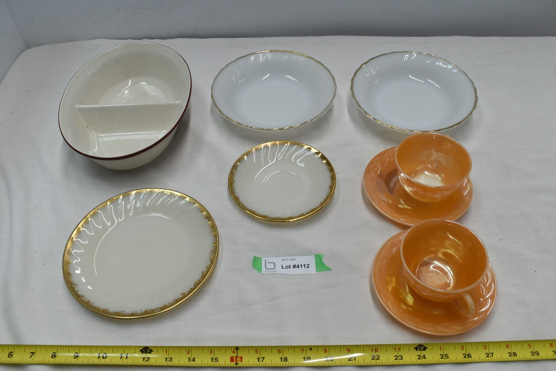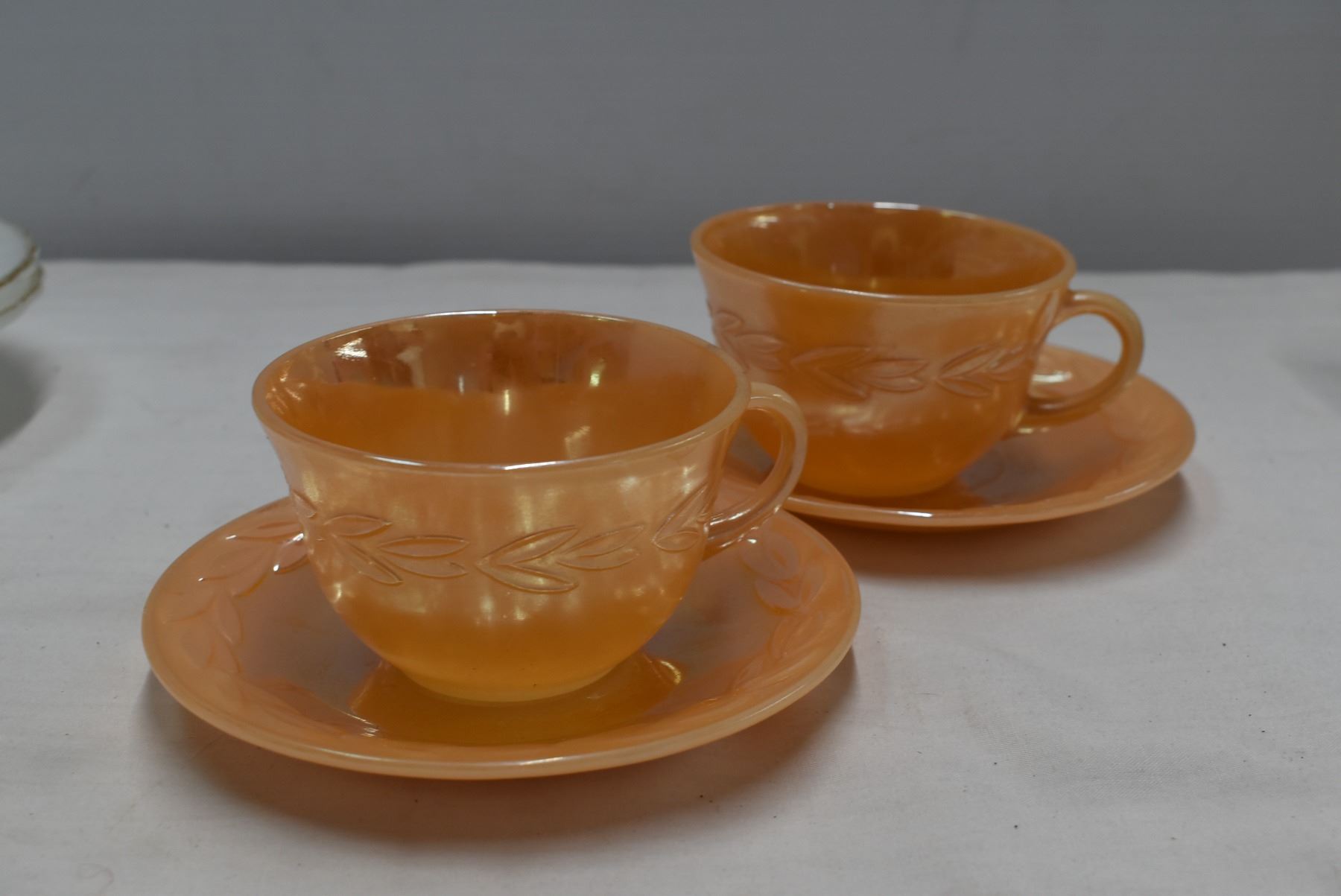 Assorted Oven Safe Dishes - peach lustre cup + saucers
