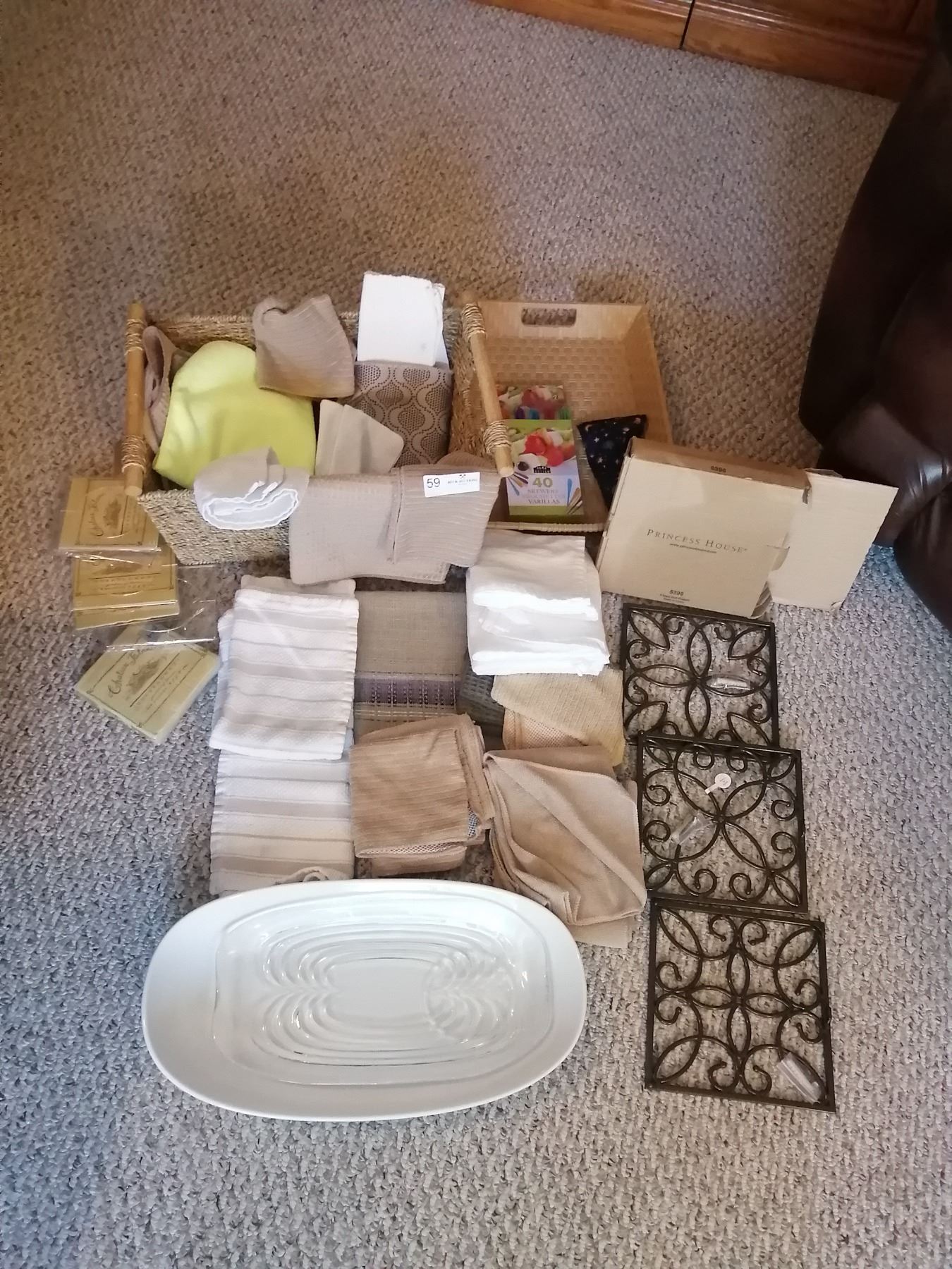 Assorted Place Mats, Dish Cloths, Princess House Wall Hangings, Coasters, 2 x Serving Trays, Basket