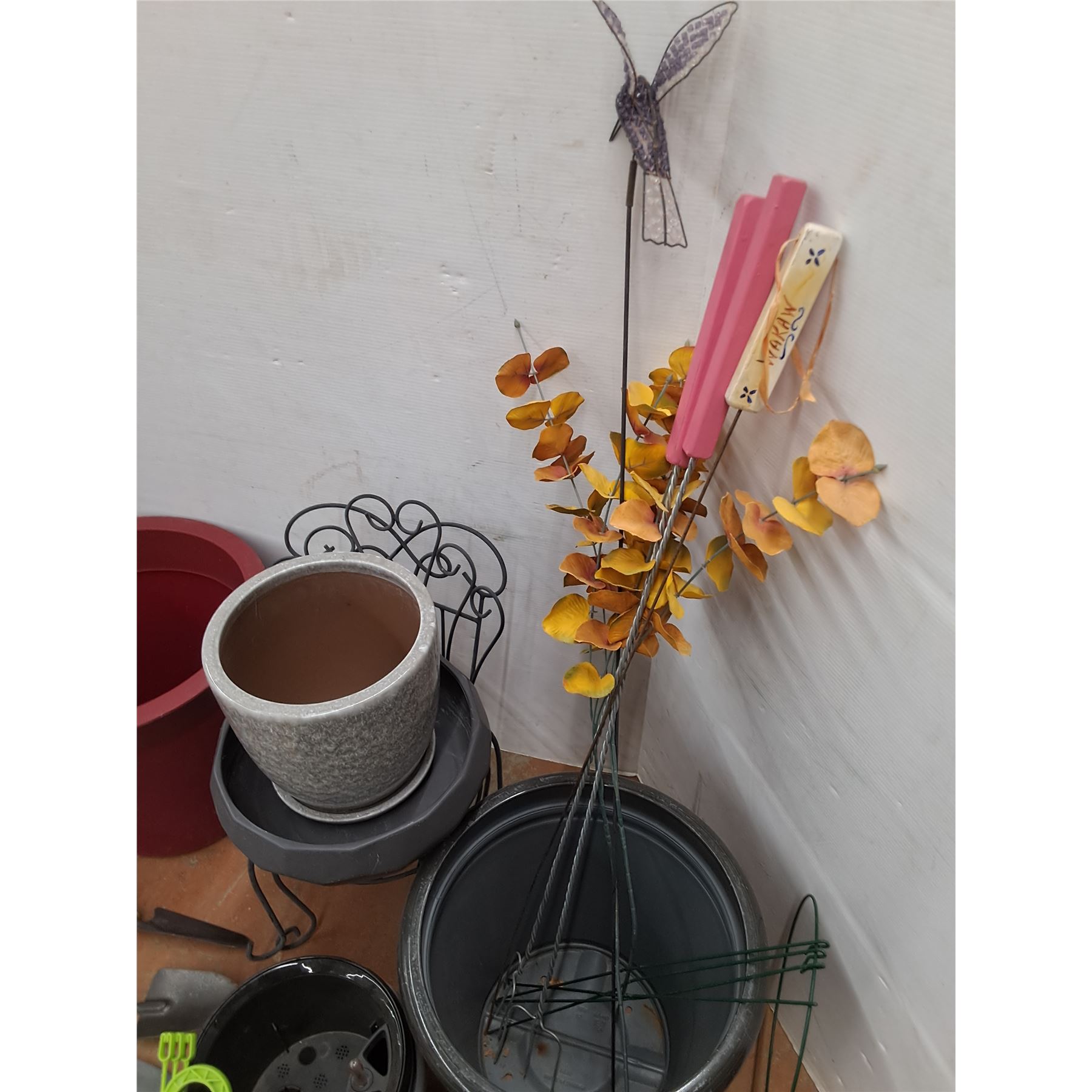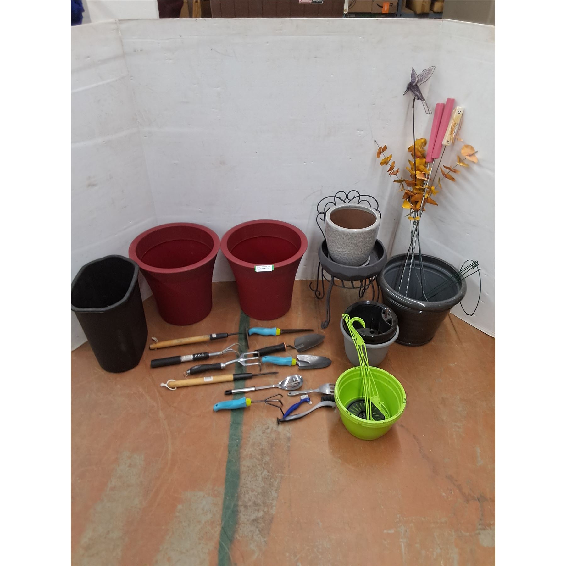 * Assorted Planter Pots, Garden Decor & Tools, Weiner Roast Sticks, Garbage Can - Pickup Only