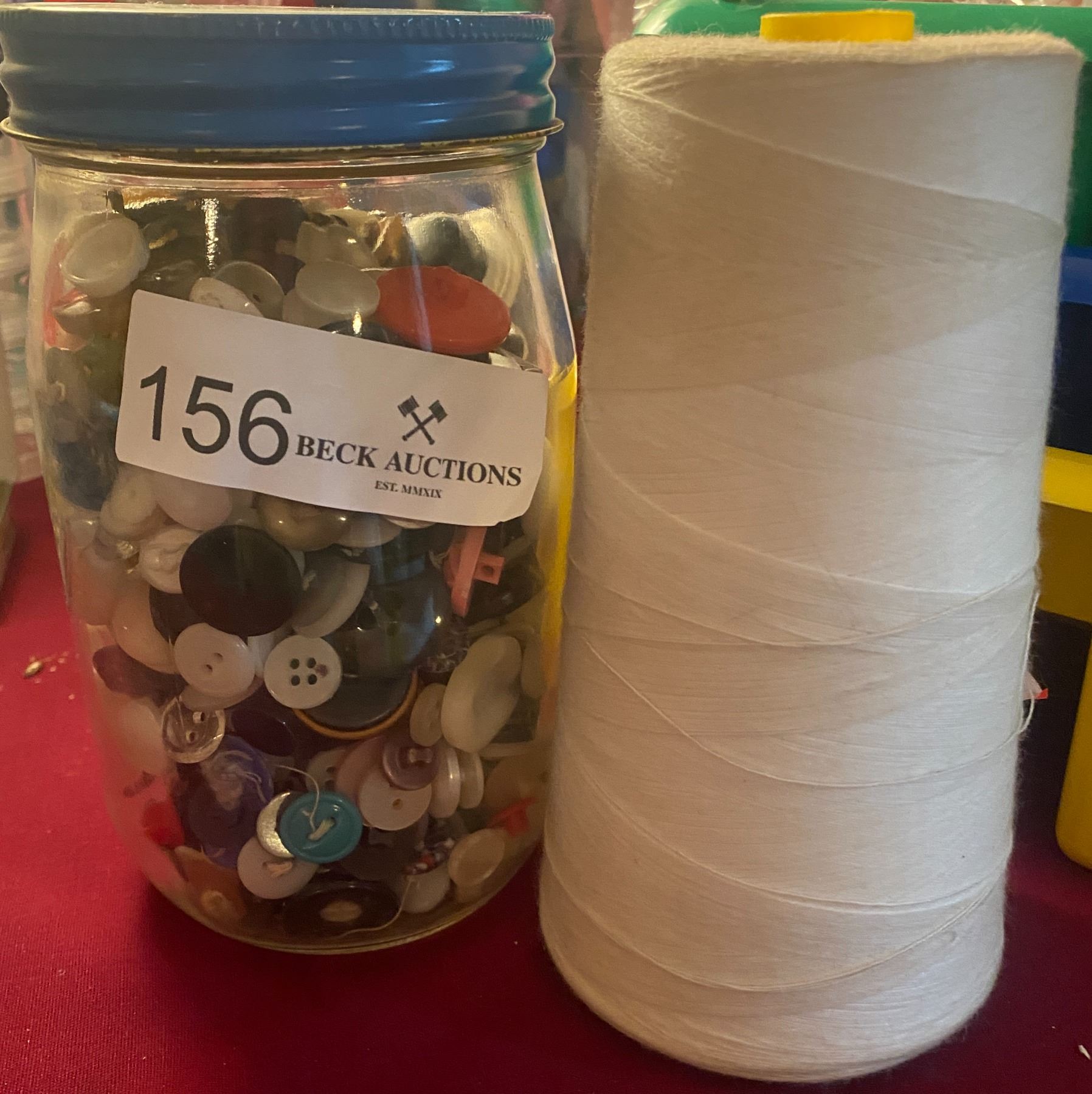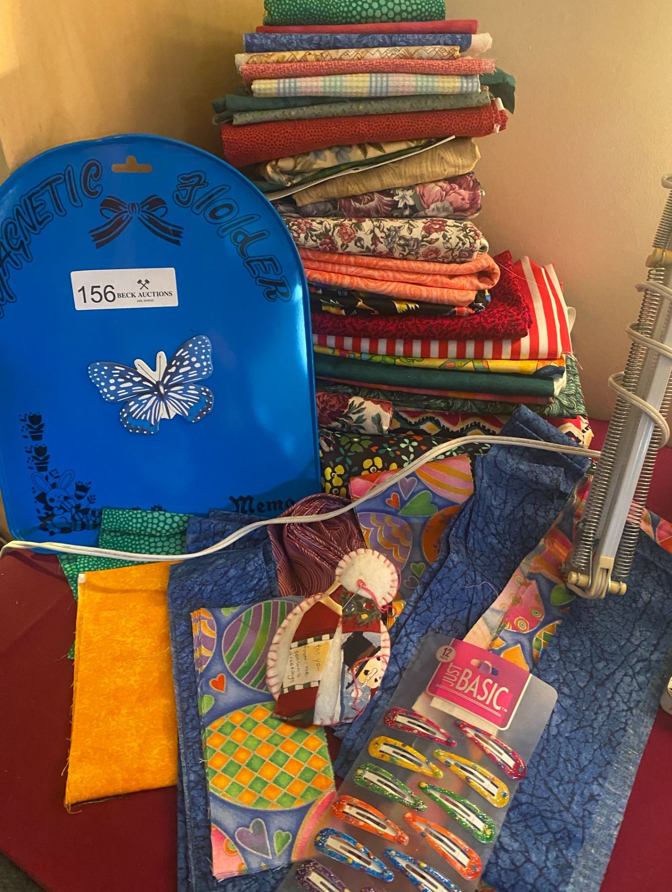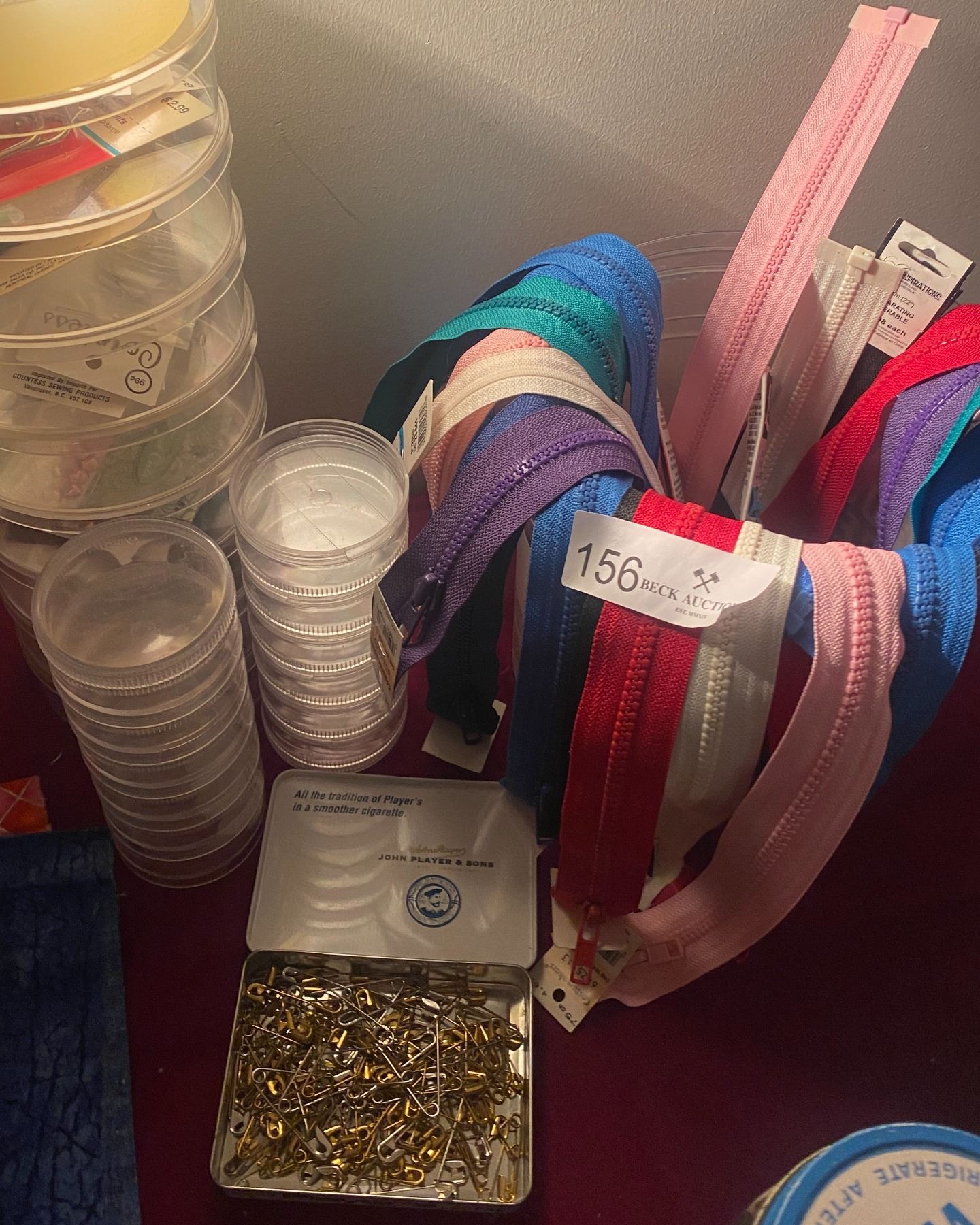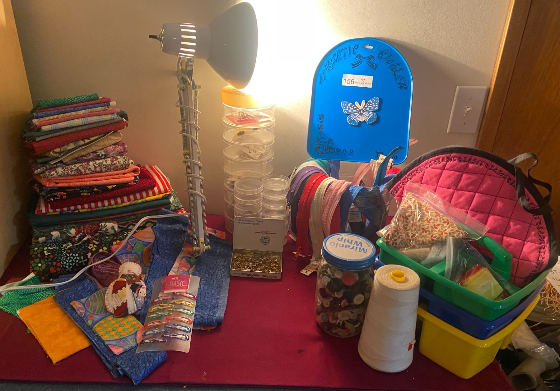 Assorted Quilting Fabrics, Assortment Of Zippers, Thread, Buttons, Lamp, & More
