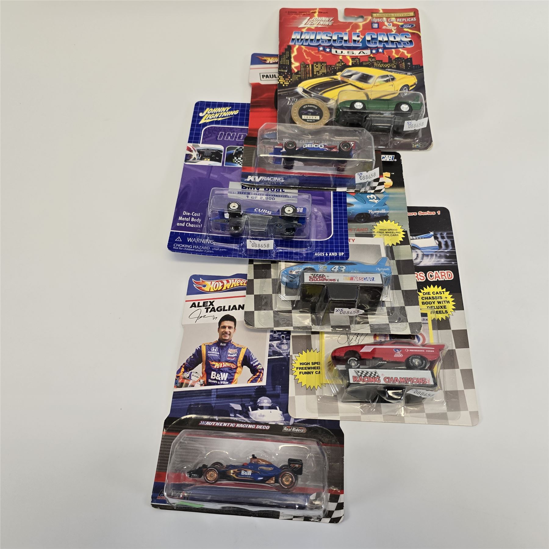 Assorted Race Car and Muscle Car lot - includes 6 cars total - featuring Hot Wheels Indy cars of Paul Tracy and Alex Tagliani