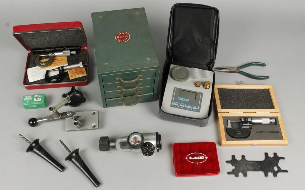 Including: digital scale, 3 micrometers, small metal storage box, and other miscellaneous items.