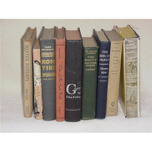 Nine assorted novels including: The Brigde of San Luis Rey, Thorton Wilder 1928. The Caine Mutiny, Herman Wouk Book Club Edition. The Ides of March, Thorton Wilder 1948. The Party and other short stories, Anton Chekhov, 1921, From the Russian by Constance Garnett. Giant, by Edna Ferber,1952. Tales of the South Pacific, James A. Michener, 1947, Third printing. Kon-Tiki, Thor Heyerdahl, 1950. Sayonara, James A. Michener, 1954, Special edition for sale in Japan Okinawa & Korea only. Mister Roberts, By Thomas Heggen 1946