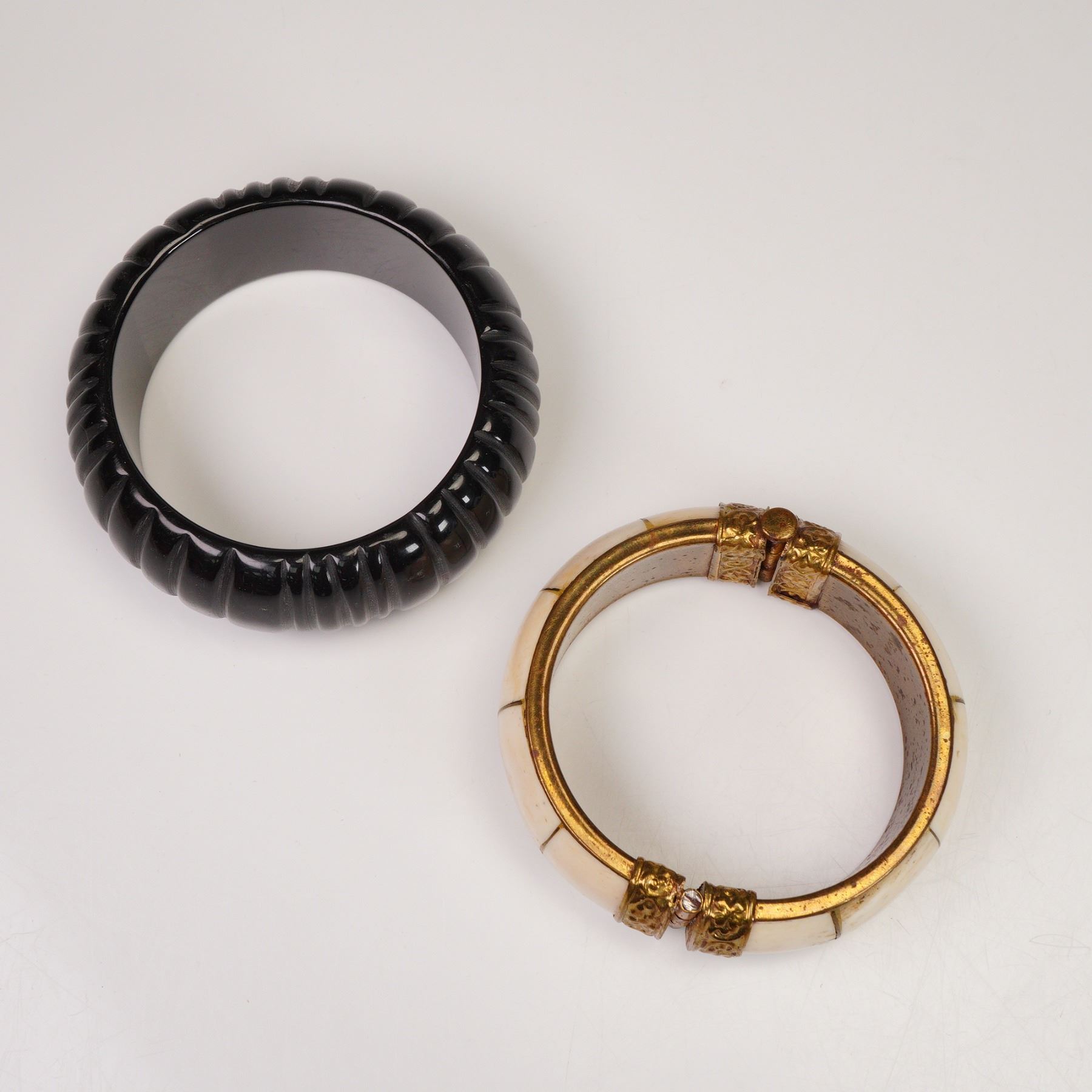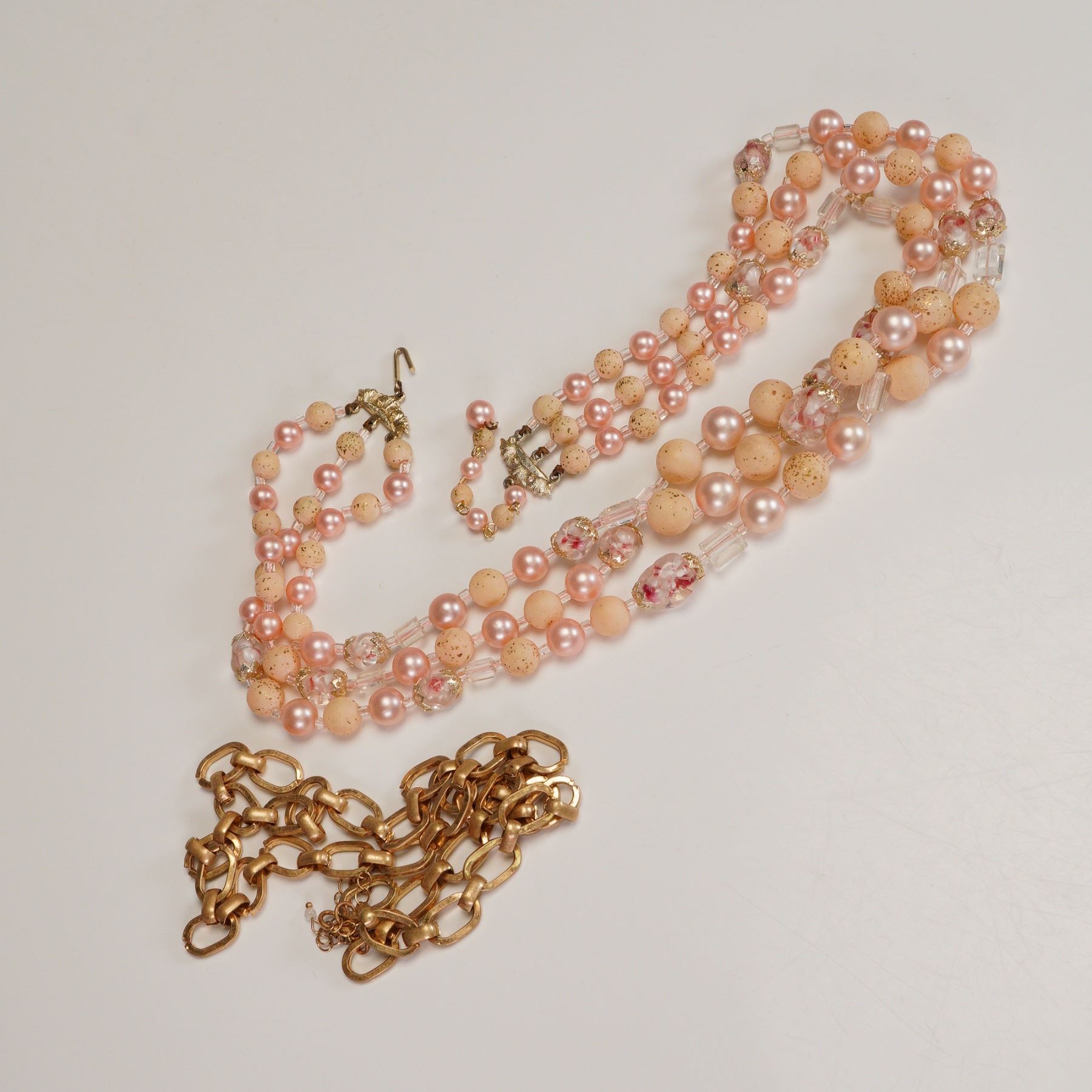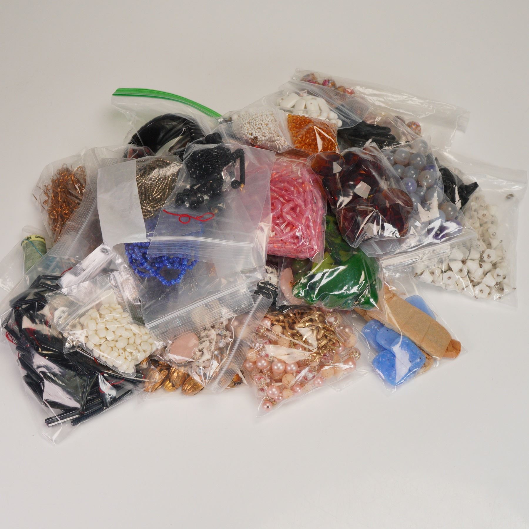 A diverse assortment of vintage jewelry components, including strands of glass, resin, and pearl beads, as well as two bracelets in different styles. This collection features a variety of colors and materials, from black and gold-tone bracelets to multi-colored beads and chains, ideal for jewelry making, repairs, or custom design projects. Includes a mix of clasps, links, and charms, perfect for creative crafting.