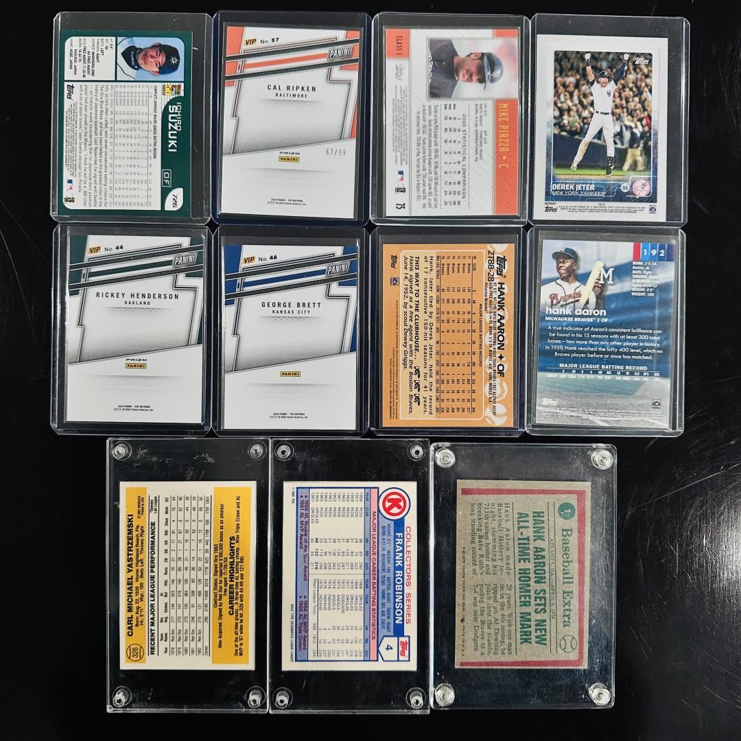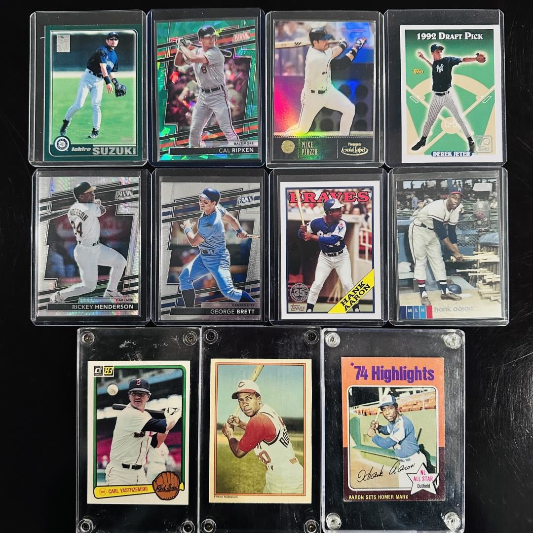This assorted baseball set highlights legendary players across generations, including Hank Aaron, Rickey Henderson, Derek Jeter, Mike Piazza, Ichiro Suzuki, George Brett, and Carl Yastrzemski. The group spans Topps, Donruss, Panini, and other notable brands, with both modern chrome and classic reprint styles represented. Cards include vintage designs, '90s parallels, and retro inserts, blending historical reverence with collector appeal. Ideal for anyone looking to build out a hall-of-fame caliber baseball collection.