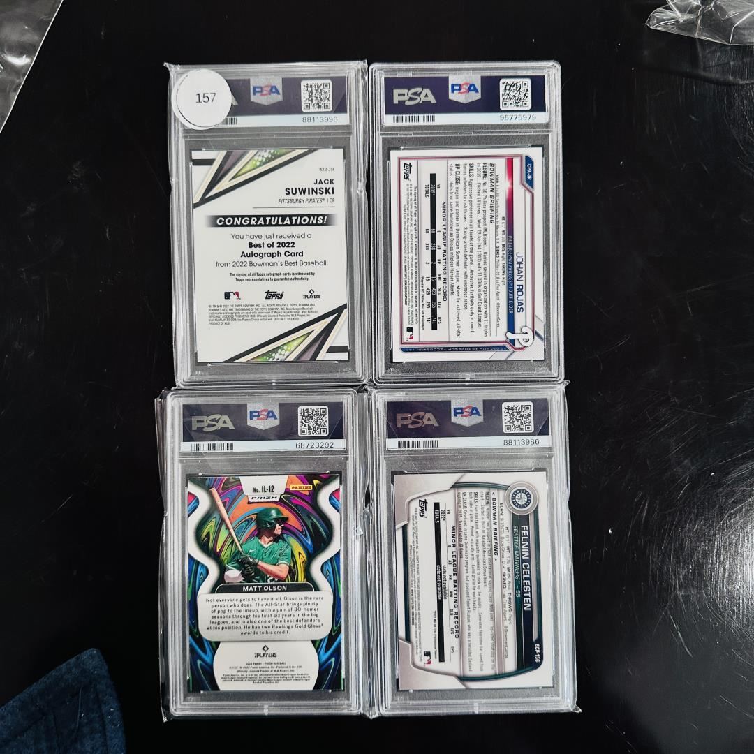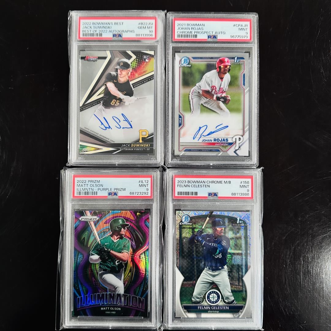 A clean and modern mix of PSA-graded baseball cards including autographs, parallels, and prospects. Features a 2022 Bowman's Best Jack Suwinski Best of 2022 Autographs (PSA 10), a 2021 Bowman Chrome Prospect Auto of Johan Rojas (PSA 9), a 2022 Prizm Illumination Matt Olson Purple Prizm (PSA 9), and a 2023 Bowman Chrome Felinin Celesten card (PSA 9). This set highlights rising players with sleek refractors and solid grades, ideal for collectors seeking future MLB talent.