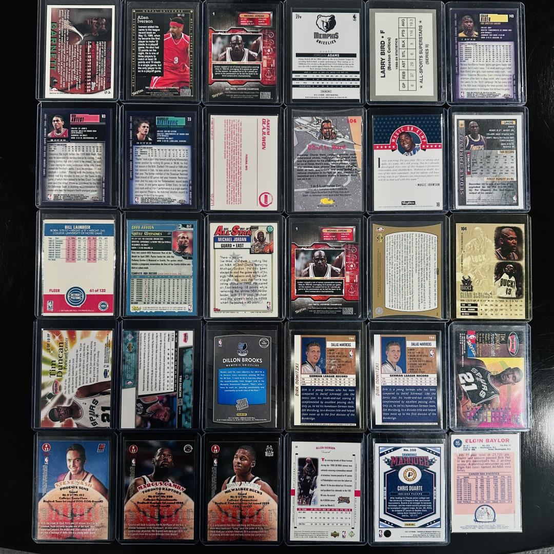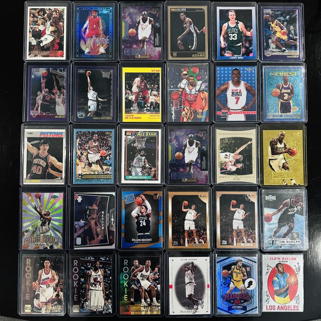 This assorted basketball set offers a loaded lineup of all-time greats and exciting rookies, including multiple Michael Jordan cards, Larry Bird, Allen Iverson, Tim Duncan, Elgin Baylor, and rookie-era cards of Steve Nash, Marcus Camby, and Ray Allen. The mix includes foil parallels, retro throwbacks, USA team cards, and player-themed subsets across Fleer, Upper Deck, Skybox, Finest, and more. A well-rounded lot featuring legends from every era, ideal for collectors chasing history and hobby value.