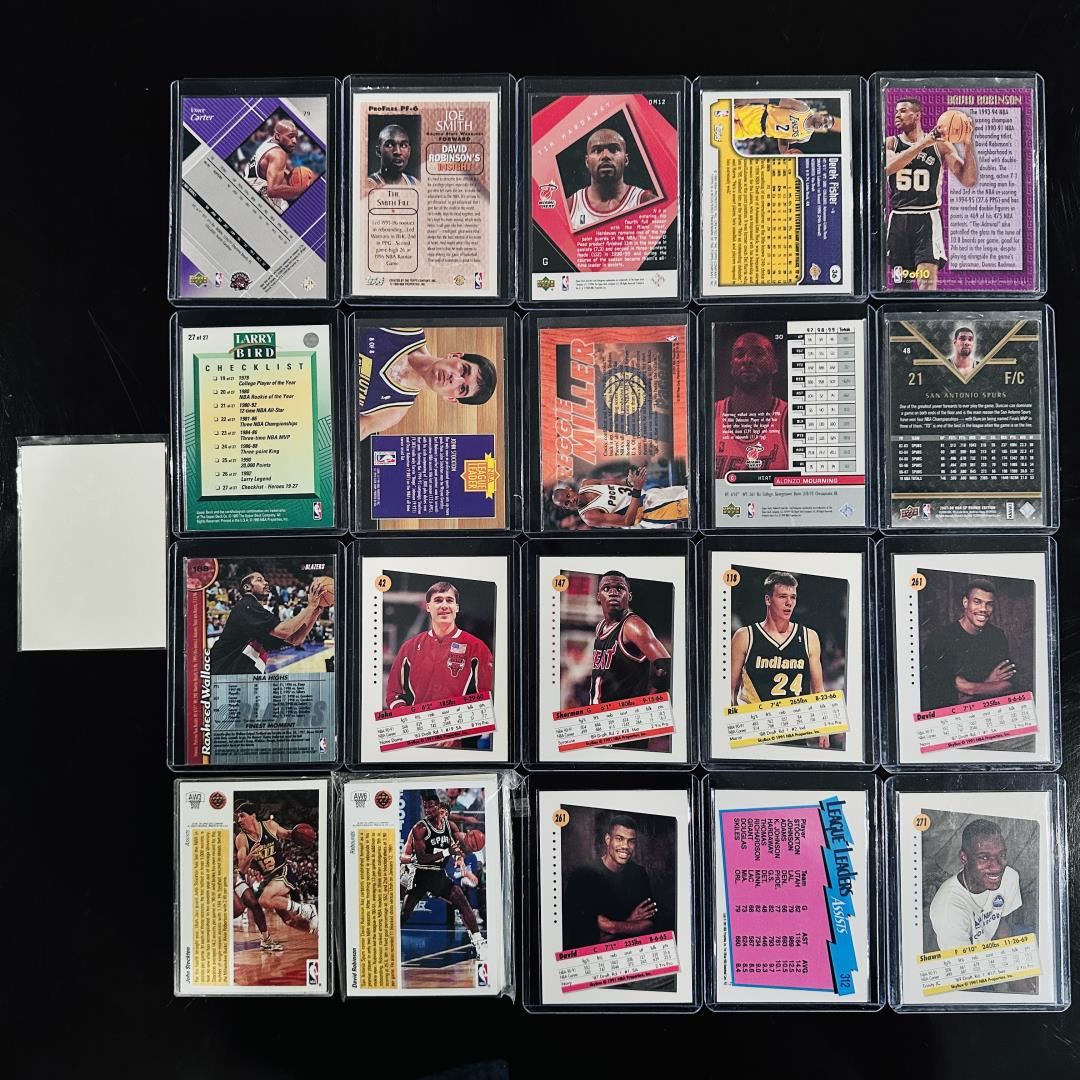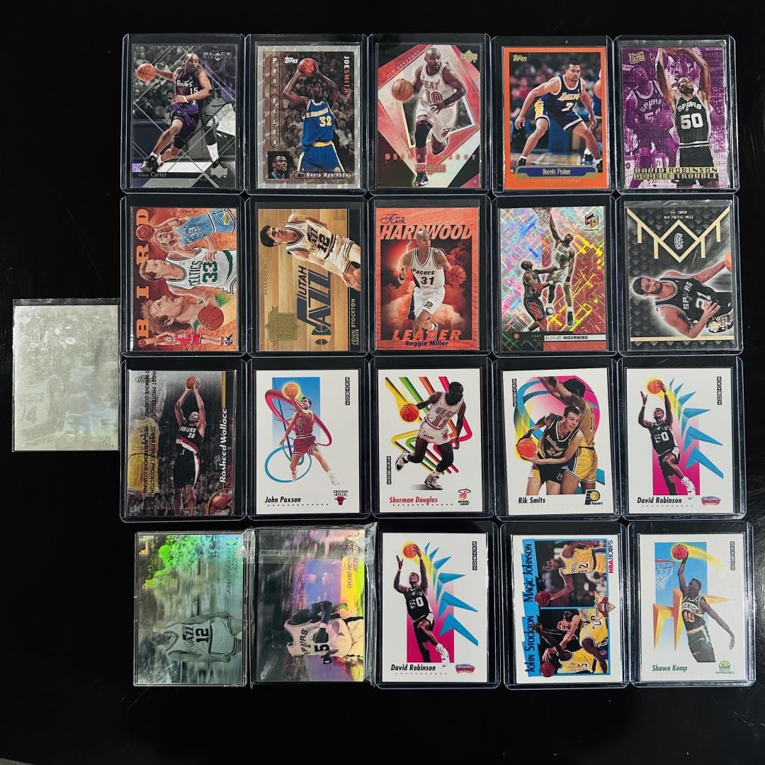 This assorted basketball lot showcases NBA icons like David Robinson, Larry Bird, Reggie Miller, Shawn Kemp, and John Paxson alongside a vibrant mix of inserts, foil parallels, and holographic cards. It includes product lines such as Upper Deck, Topps Finest, Fleer Ultra, and SkyBox, with artistic and visually striking designs. You'll find both retro and early 2000s flair, including standout player-themed cards, NBA Jam Session styles, and team-oriented subsets. Great mix for collectors seeking color, variety, and star power.