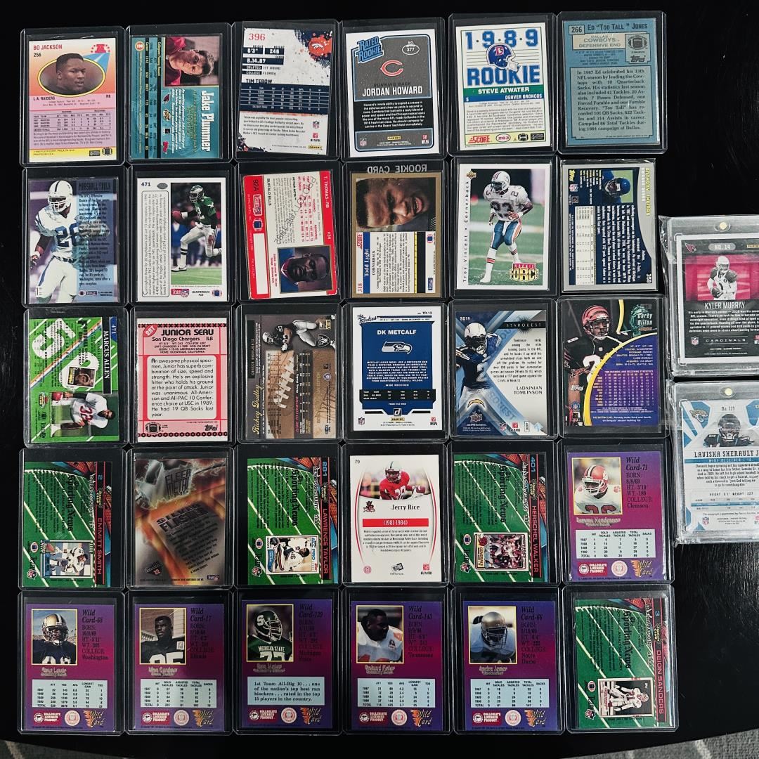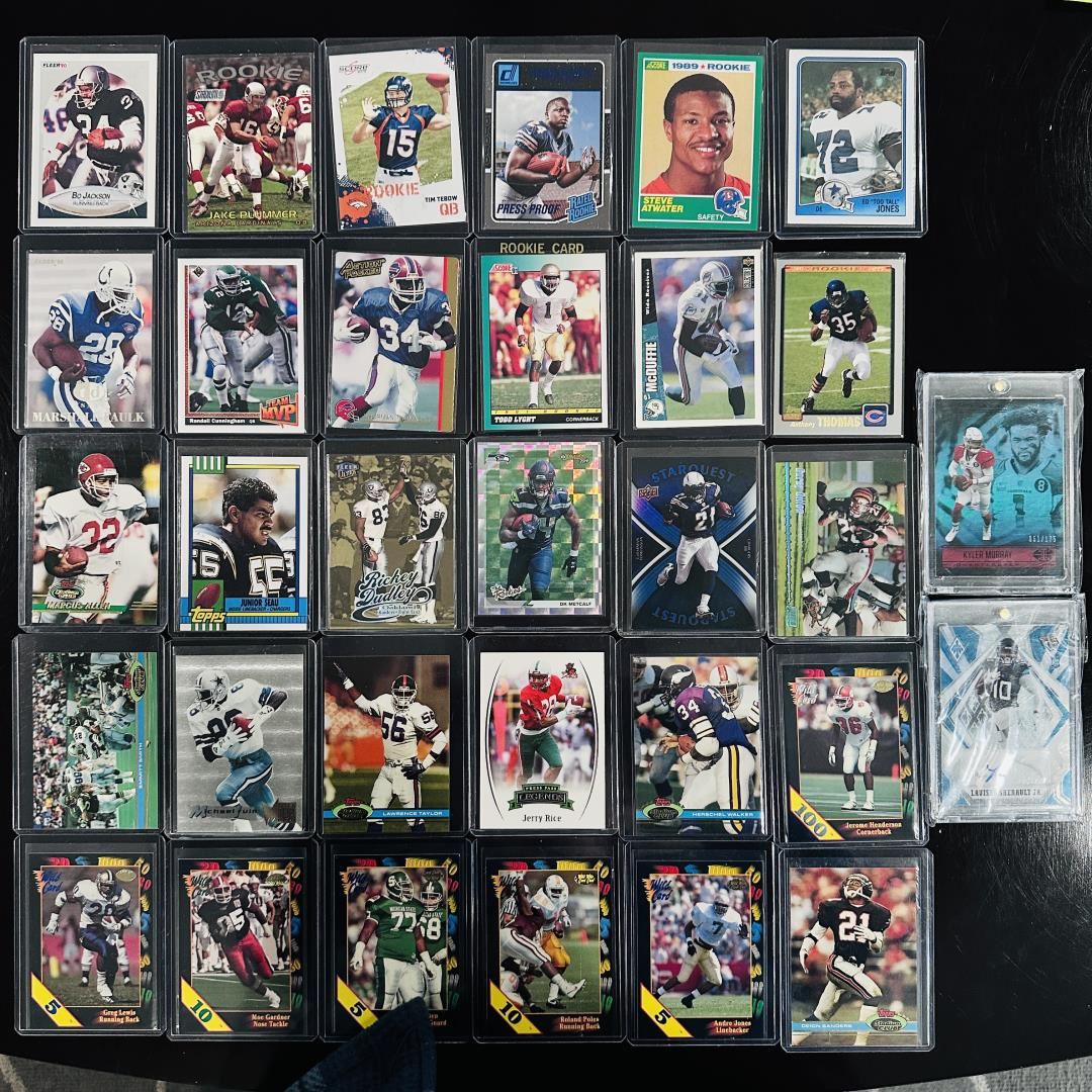 This assorted football card set includes a mix of stars, rookies, and Hall of Famers spanning several eras and styles. Players featured include Steve Atwater, Jerry Rice, Todd Light, Lawrence Taylor, Marshawn Lynch, and Jake Plummer, with brands ranging from Topps and Score to Playoff, Donruss, Leaf, and Panini. The set includes rookie cards, refractors, chrome parallels, and standout inserts like Starquest, Rookie Gridiron Kings, and Press Pass. A well-rounded group that blends vintage and modern appeal for football collectors.