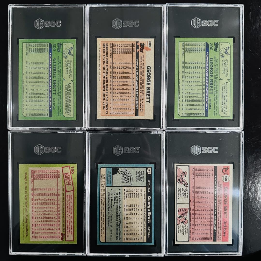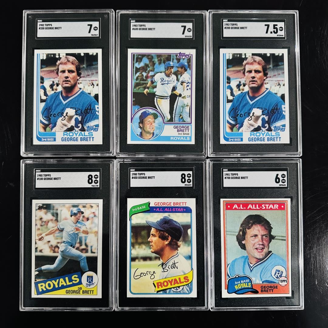 This assorted George Brett set features six SGC-graded cards spanning 1981 to 1985, highlighting the Kansas City Royals Hall of Famer across several classic Topps designs. Grades range from SGC 6 to 8, with strong entries like the 1985 Topps #100 and 1981 Topps #450 both earning SGC 8. Each card showcases Brett's consistency and legacy through the prime of his career. A clean, collectible group ideal for Royals fans and vintage collectors.