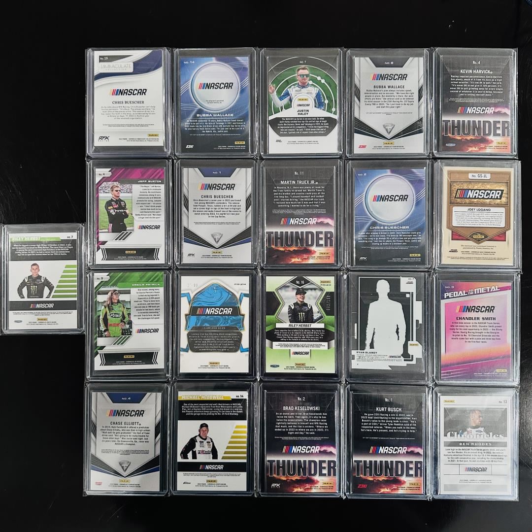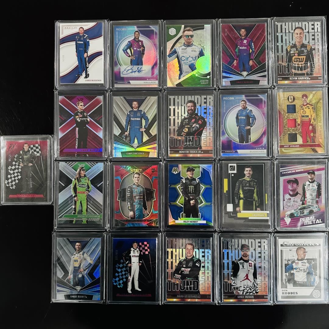This follow-up NASCAR lot complements the previous with even more high-impact foil inserts, vibrant driver images, and standout parallels. Drivers include Martin Truex Jr., Chase Elliott, Hailie Deegan, Bubba Wallace, and Kyle Busch, with "Thunder" inserts, checkered foil cards, "Mosaic" styles, and vivid portraits across the grid. Many cards feature chromium shine, team gear, and dynamic action shots, offering a great mix of texture and collector value. A perfect expansion set for racing enthusiasts and card flippers alike.