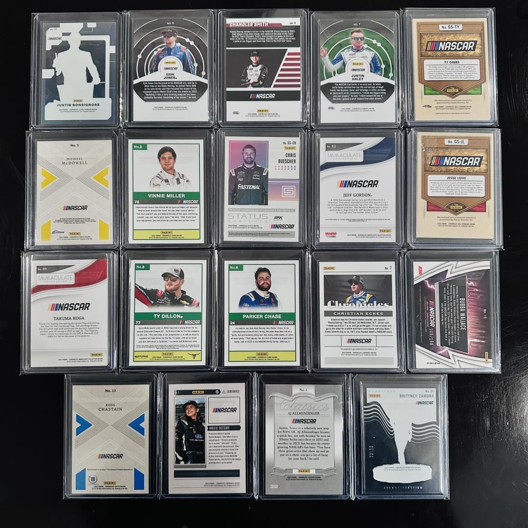 This assorted NASCAR set packs a punch with a mix of memorabilia relics, certified autographs, rookie cards, and foil parallels. Drivers include Jeff Gordon, Justin Allgaier, Ty Gibbs, Bubba Wallace, Christian Eckes, and more, spanning brands like Immaculate, Panini Donruss, Chronicles, and Leaf. Highlights include multi-swatch relic cards, acetate inserts, green rookie designs, and vibrant racing-themed color pops. A premium mix of modern NASCAR content perfect for collectors chasing hits and visual appeal.