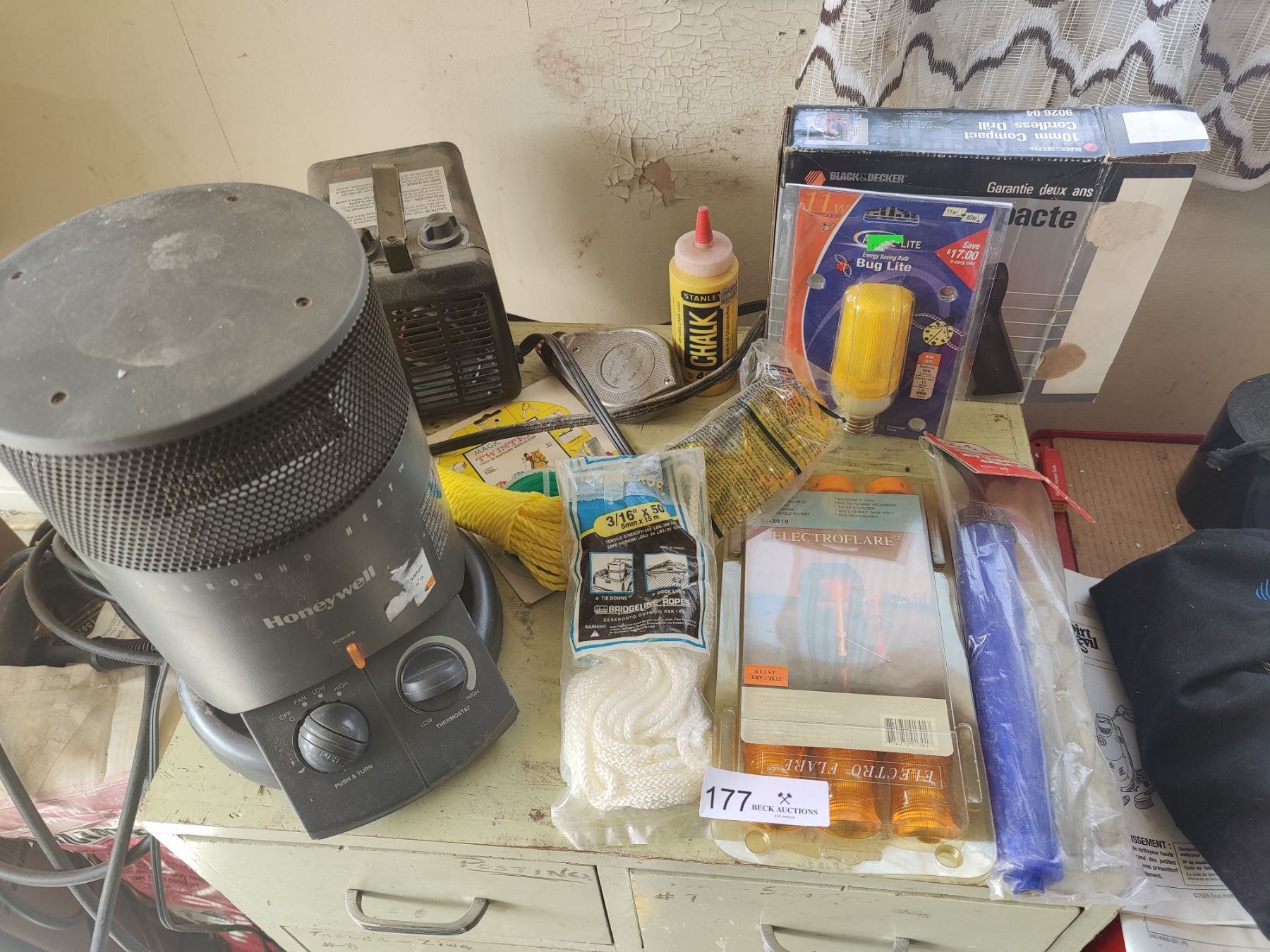 2 Space Heaters 10mml Cordless Drill, Reflective Road flares, safety glasses, assorted rope.