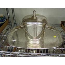Shelf Lot, Silver Plate, Ice Bucket, Serving Tray, Several Platters and Bowls, Candlesticks, etc.