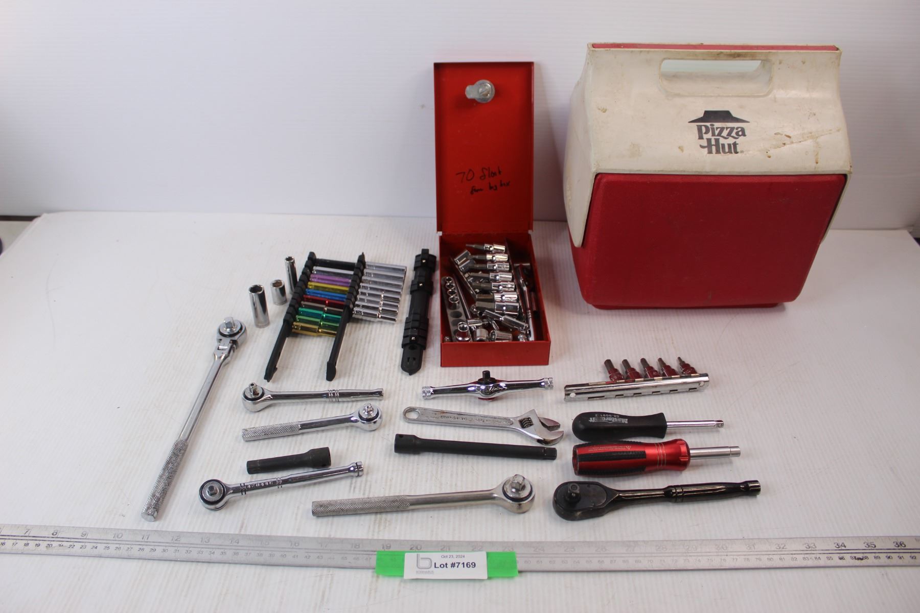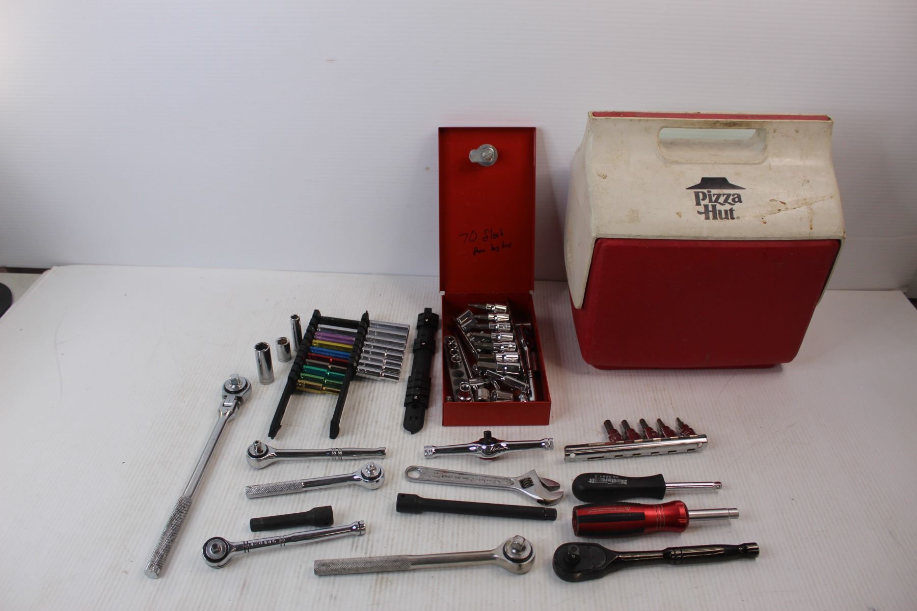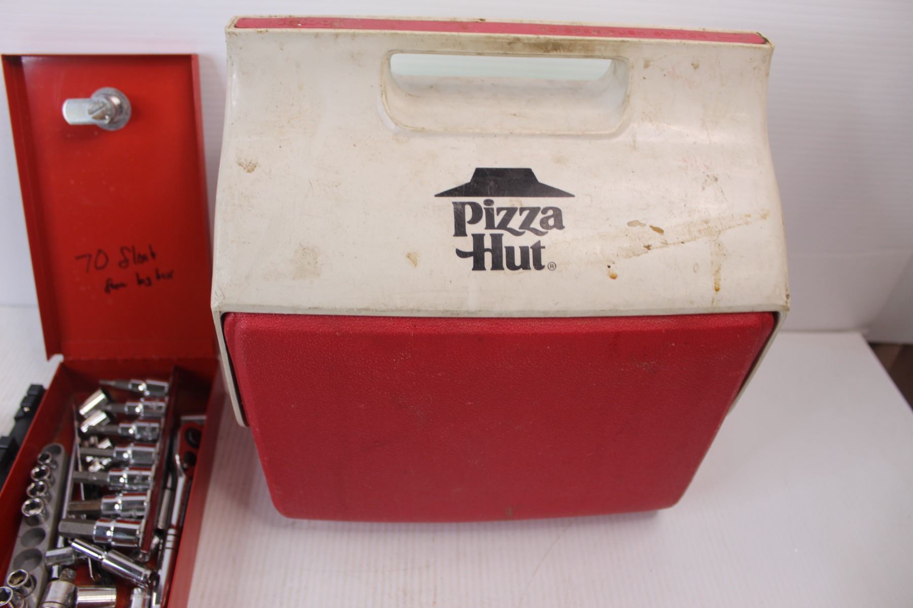Assorted Sockets/ Rachets, Misc. w/ Pizza Hut Igloo Cooler