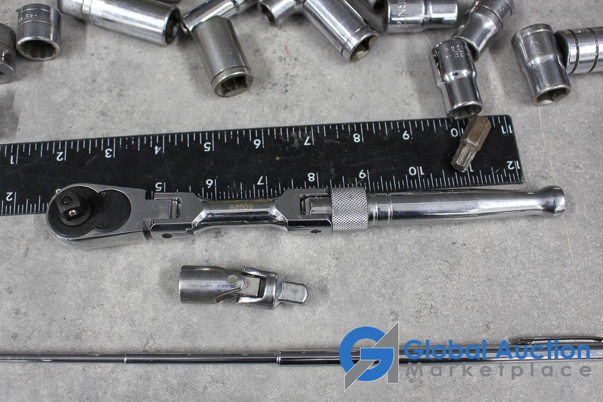 Assorted Sockets, Ratchets, Magnetic Tool