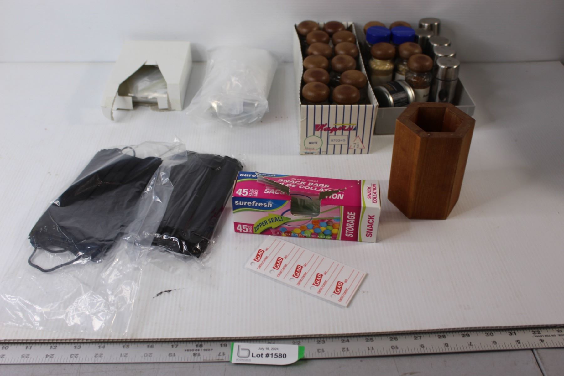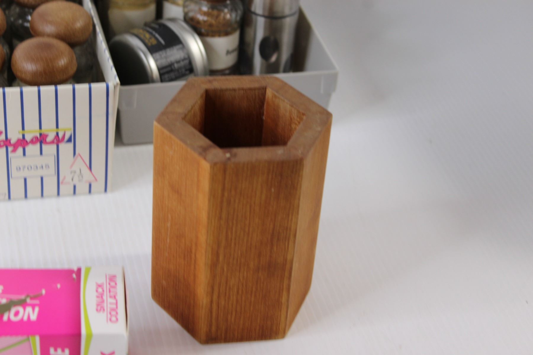 Assorted Spices, Food Bags, Face Masks, Wooden Vase for Fake Flowers