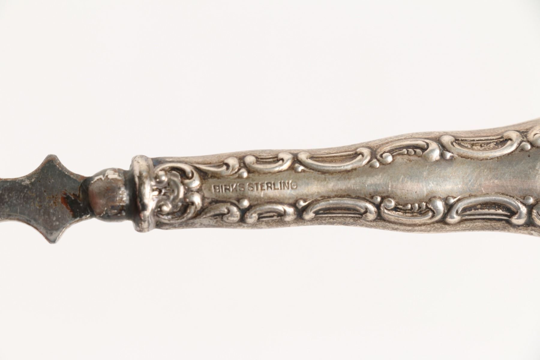 Lot 347 - Sixteen (16) pieces. Each piece is Sterling hallmarked. Includes: 3 salt shakers, 2 napkin rings, 1 gravy spoon, 1 gravy boat, 1 corn spike, 1 bottle opener (handle only sterling), 1 pair sugar tongs, 1 pair scissors (handles only sterling), 1 footed salt cellar with cobalt blue glass insert, 1 filigree compote, 1 commemorative royal visit bar, 1 baby rattle, 2 menu easels. Gross combined weight, 454g, 46g sterling handled accessories. Various sizes. $400-600.