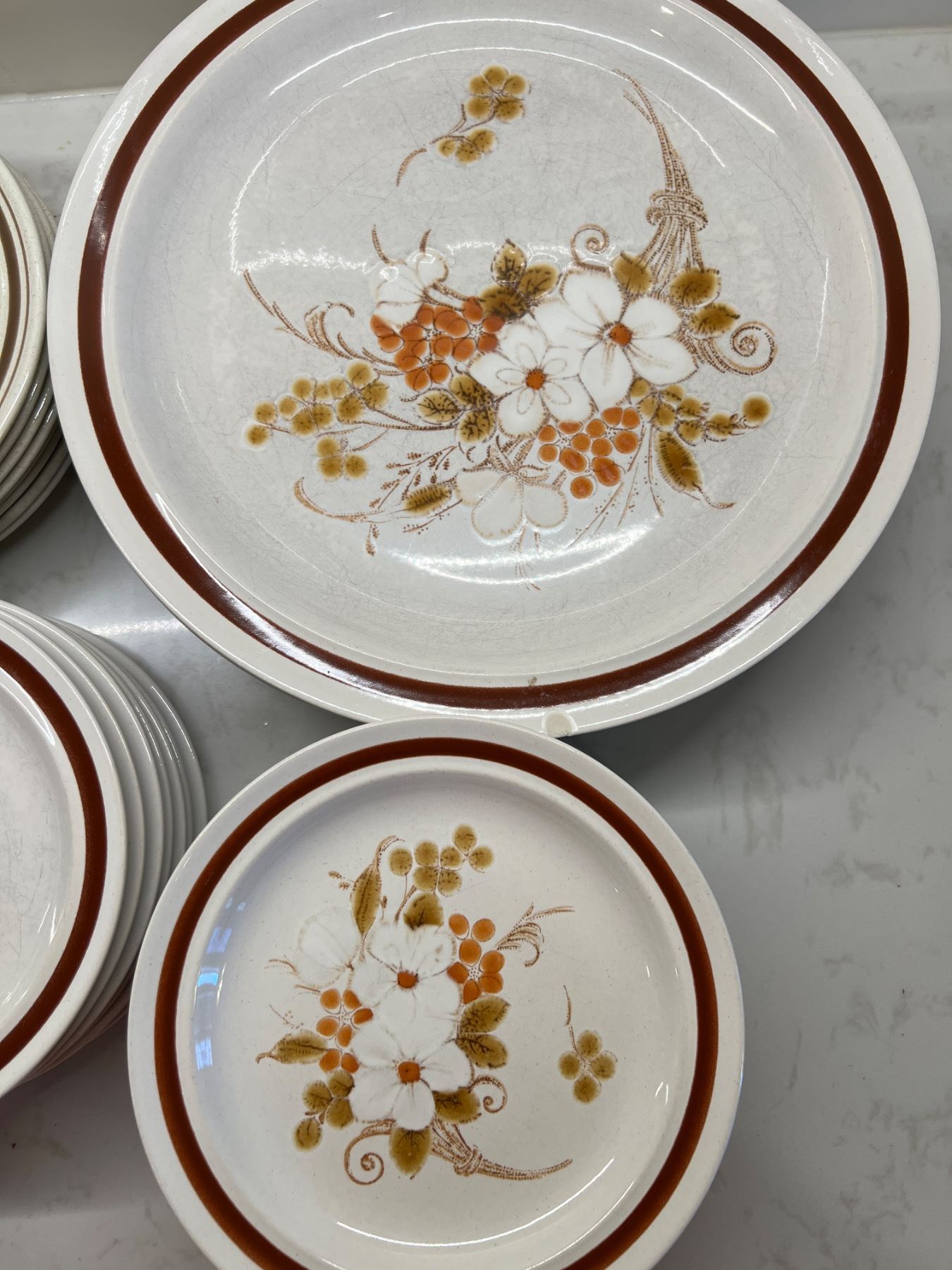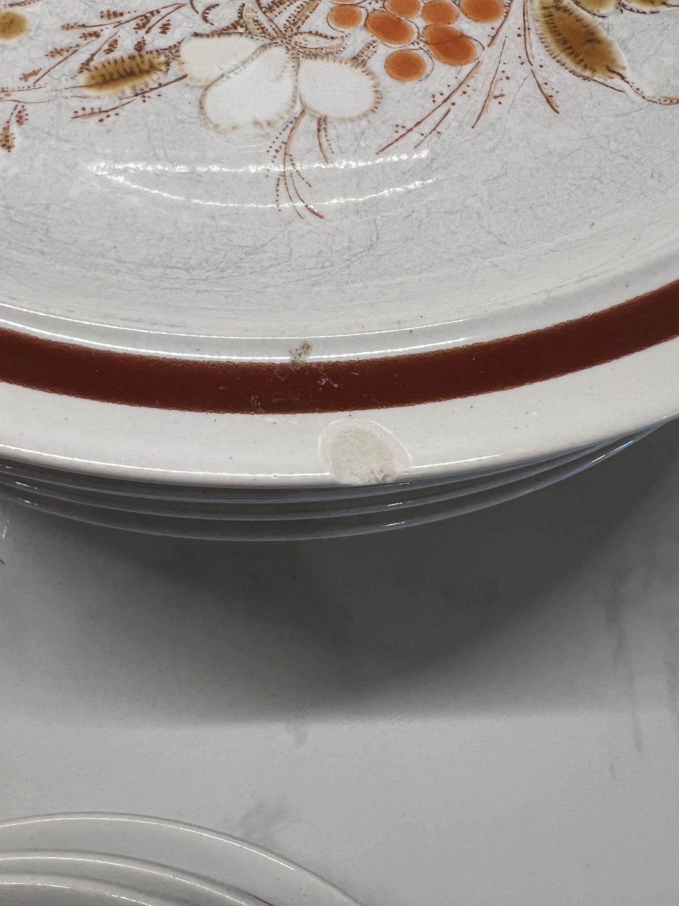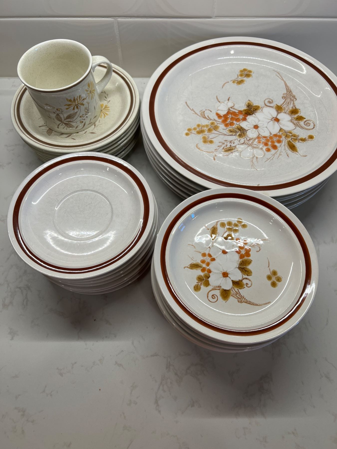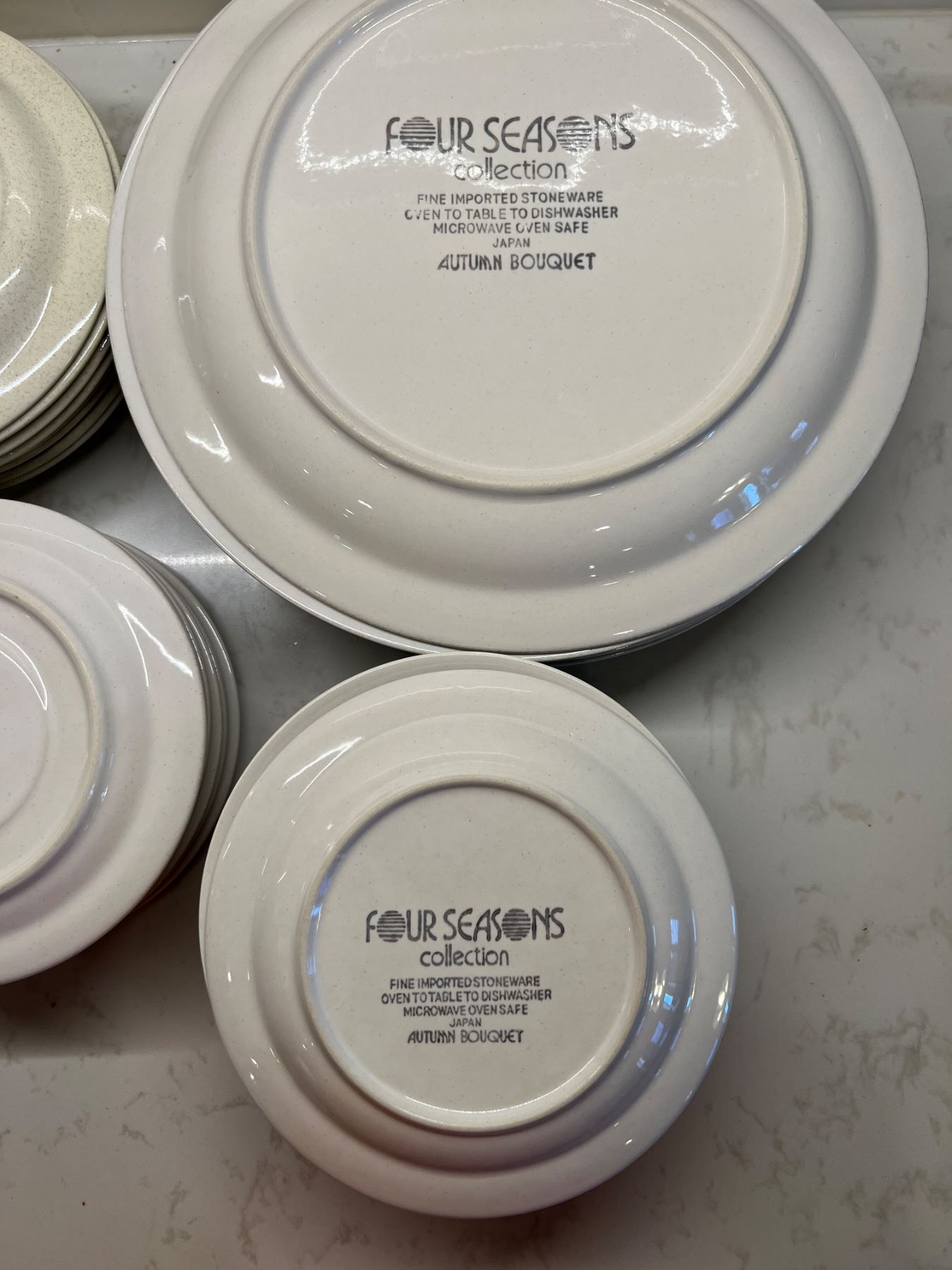 Features Royal Doulton and Four Seasons. Largest dishes measure 10" in diameter and there is a chip in one of them