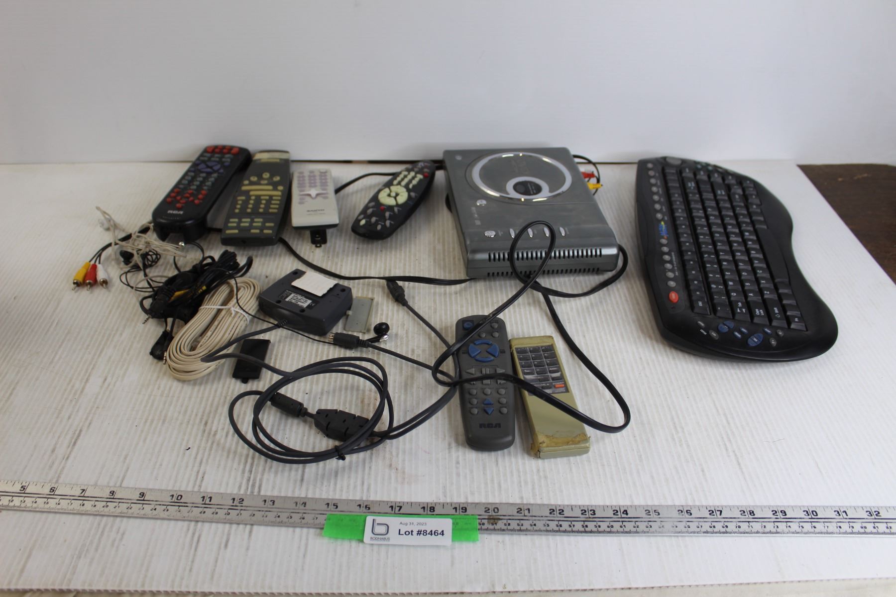 Assorted TV Remotes, Max Keyboard, DVD/MP3/CD Player, Cords - All Untested