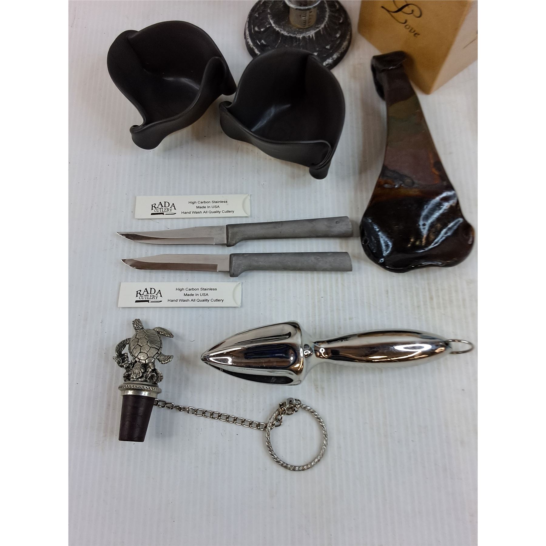 Assorted Table Decor, Bar Tools, Cheese Knives, Candle, 3D Wall Art