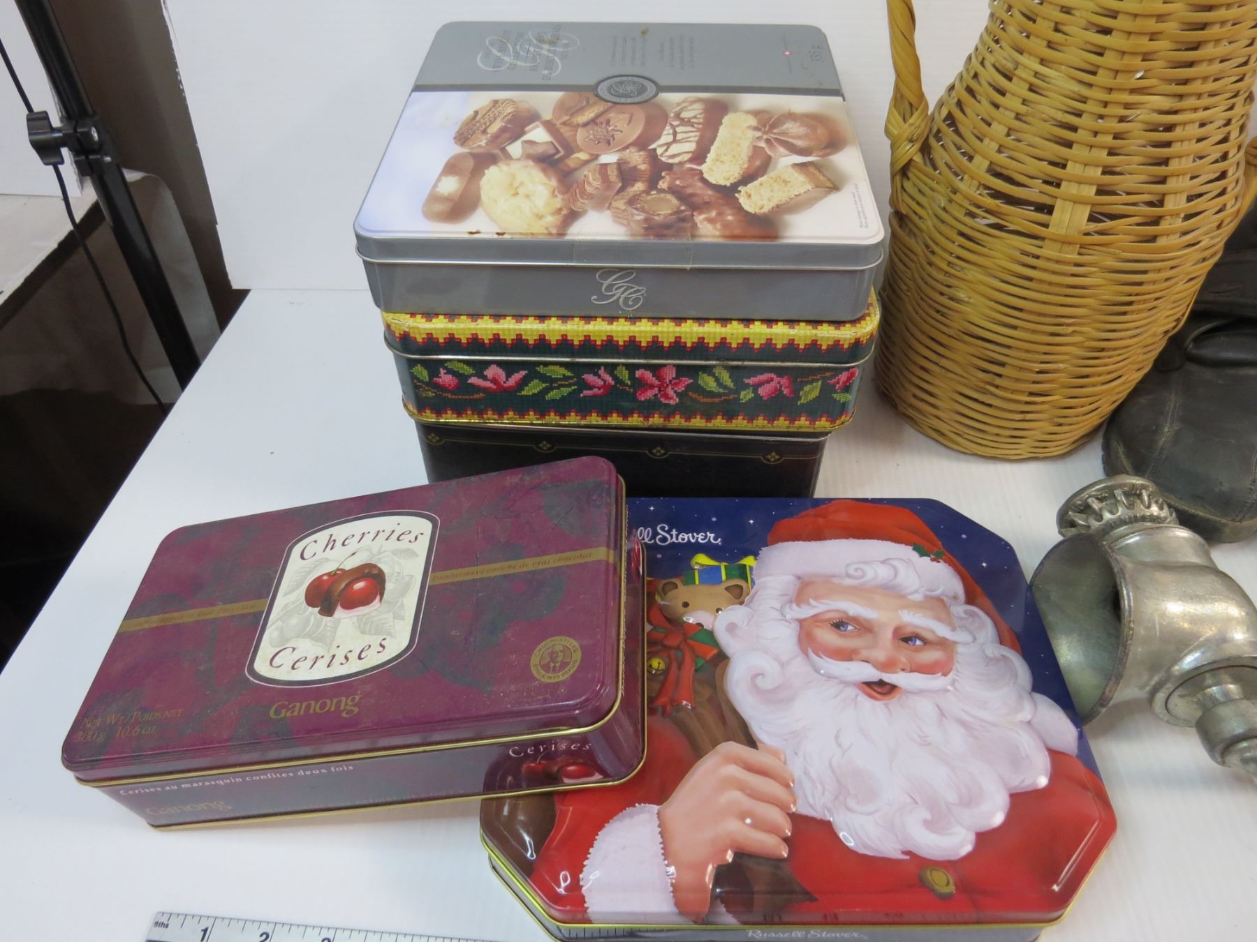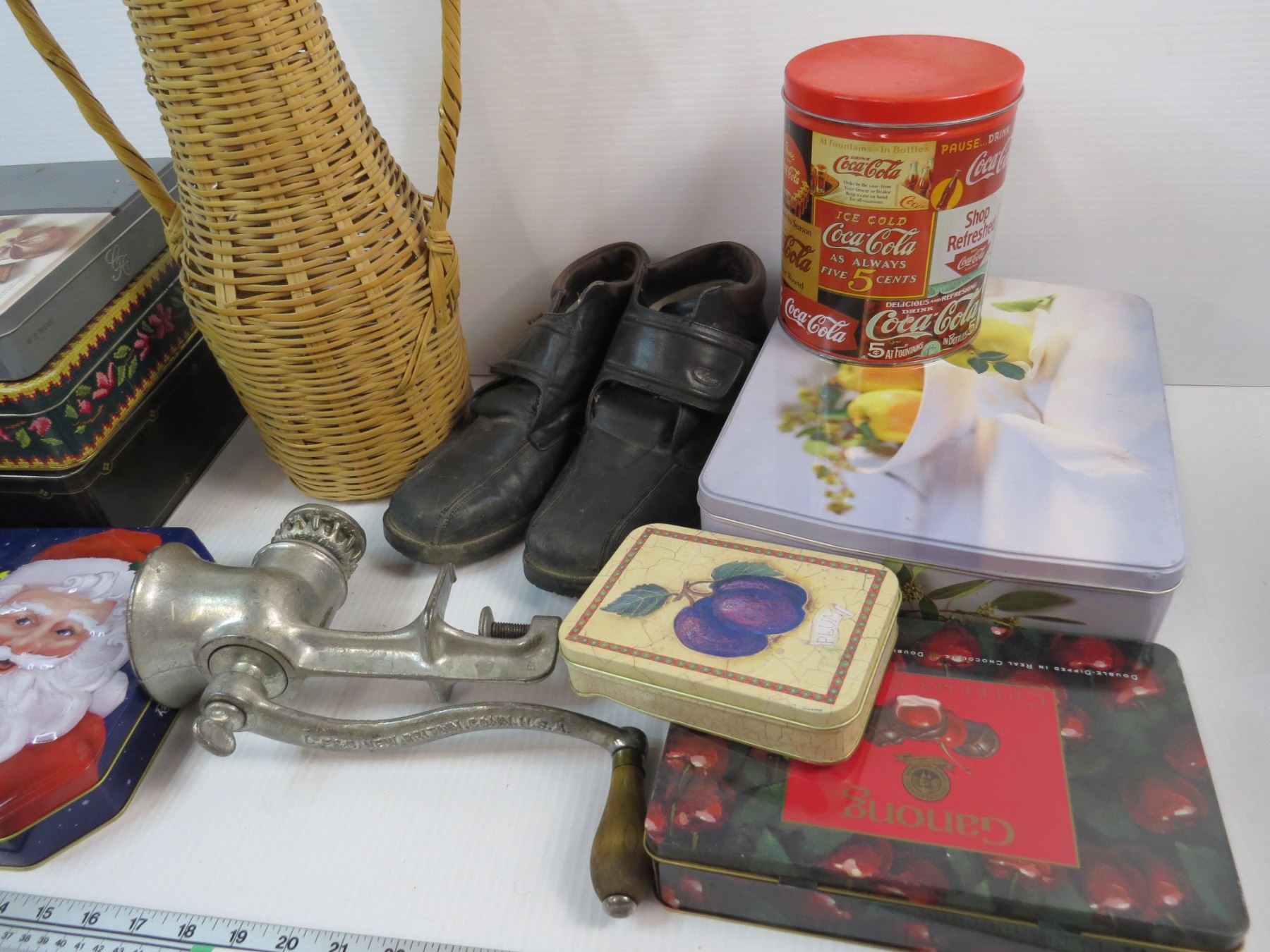 *Assorted Tins - Ladies Boots (size 9) - Wicker Item (damages) - Grinder (missing parts)