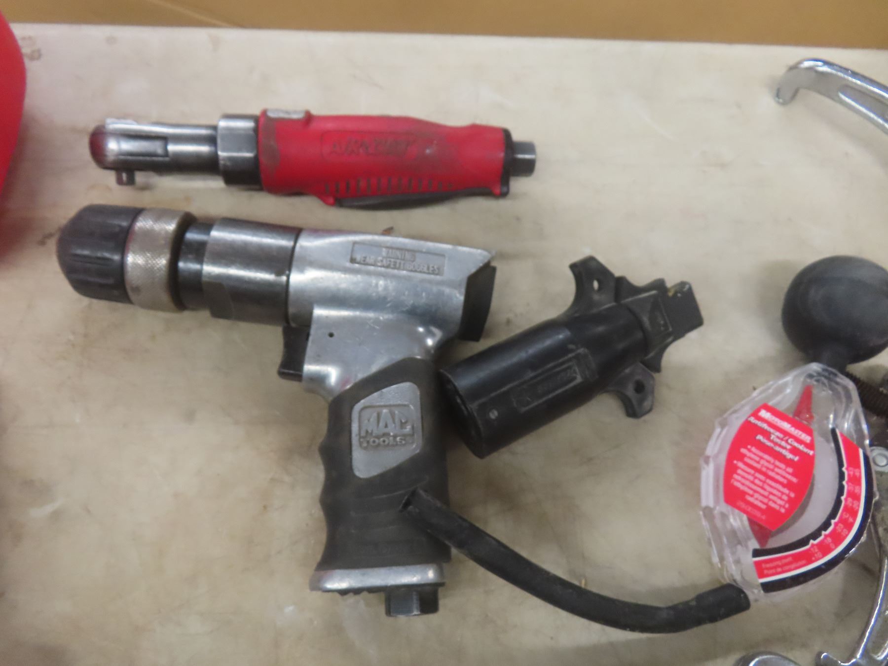 Assorted Tools Including Gear Pullers and Parts, Bolt Cutters, Plastic Gas Container, Convex Mirrors, and Chain with Hooks