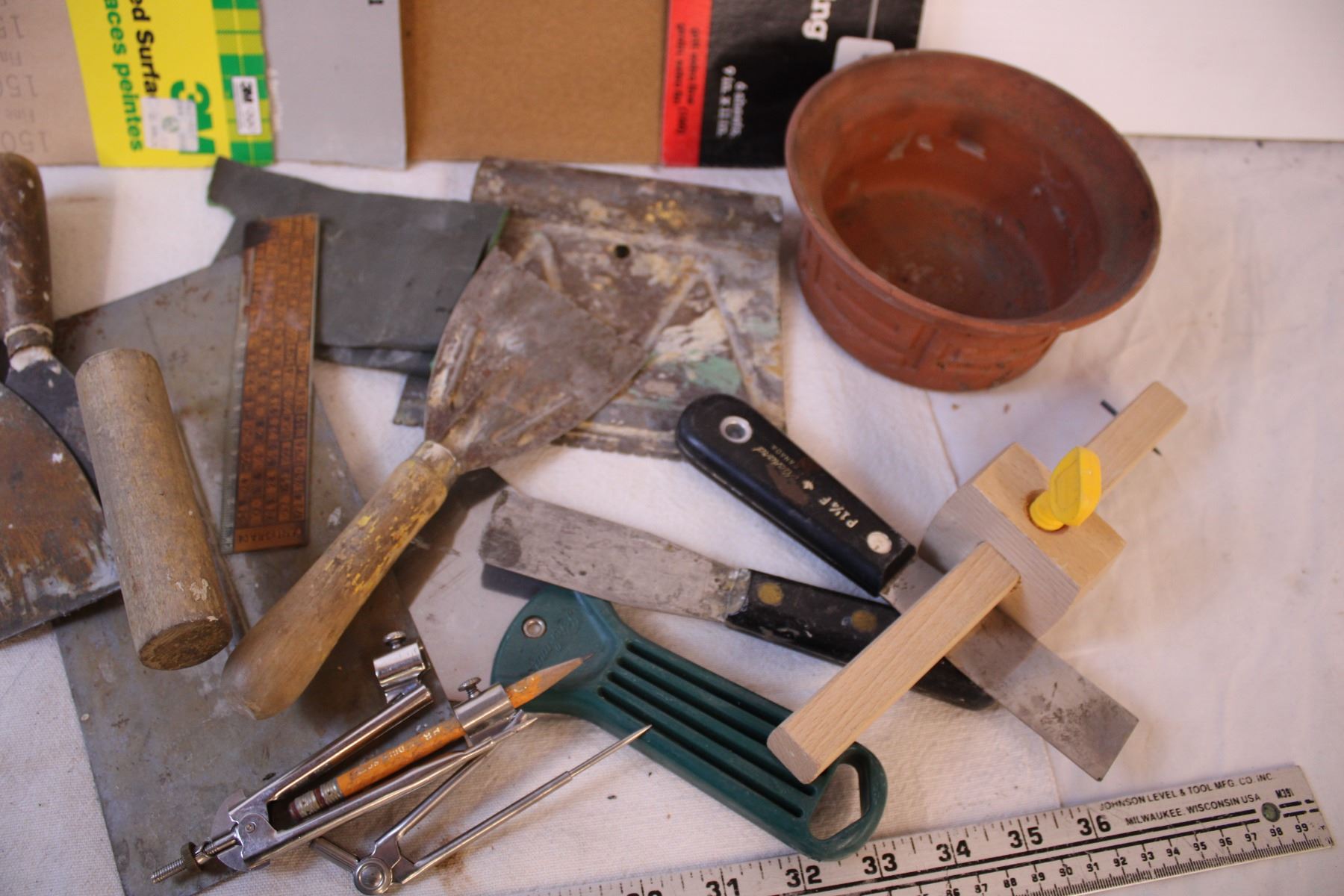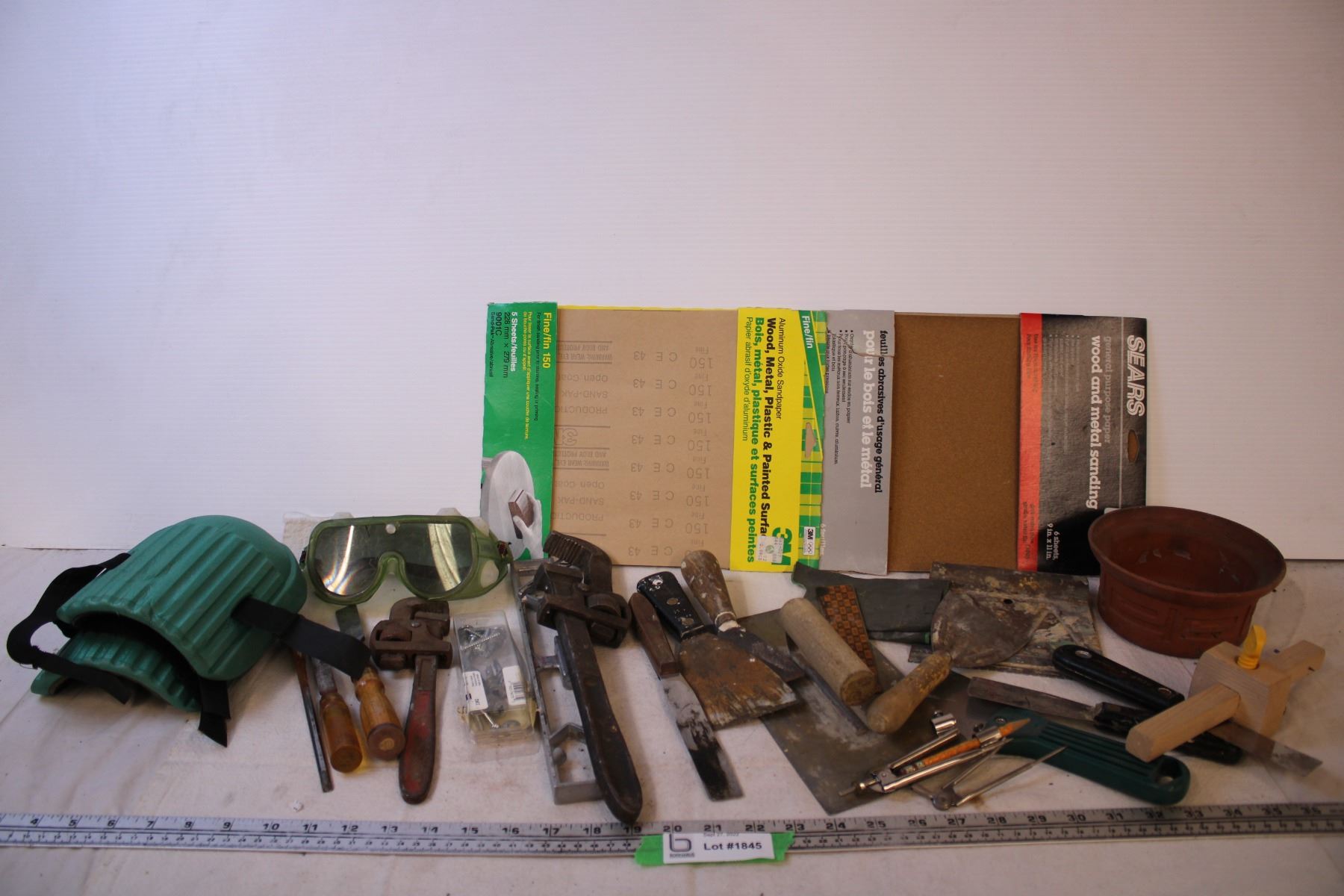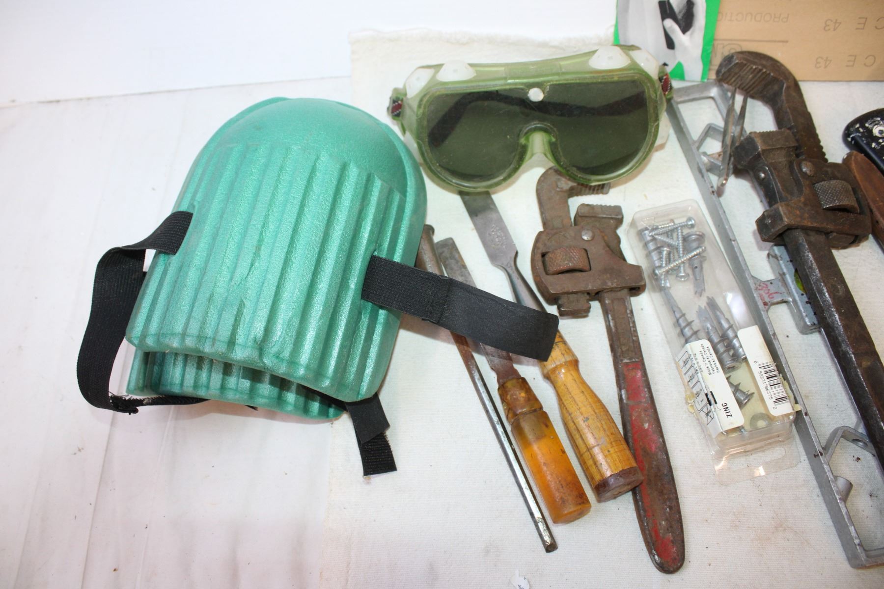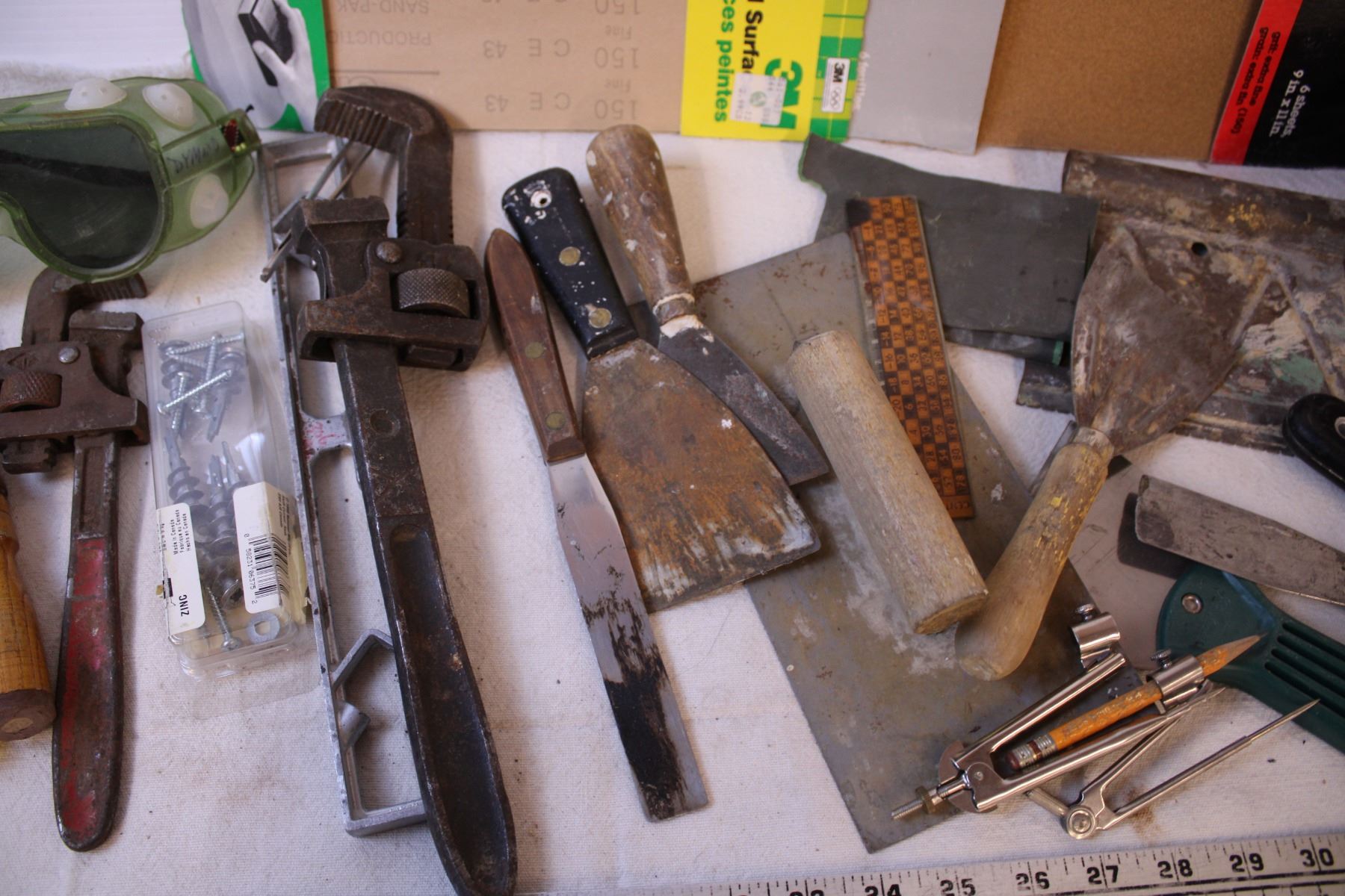 Assorted Tools (Mudding Knives, Chisels, Wrenches, Sand Paper, PPE)