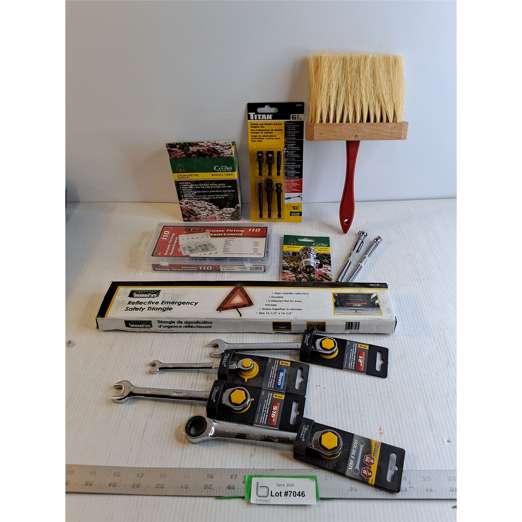 Assorted Tools NIB - Safety Triangle/ Grease Fittings/ Timer/ Brush/ Misc.