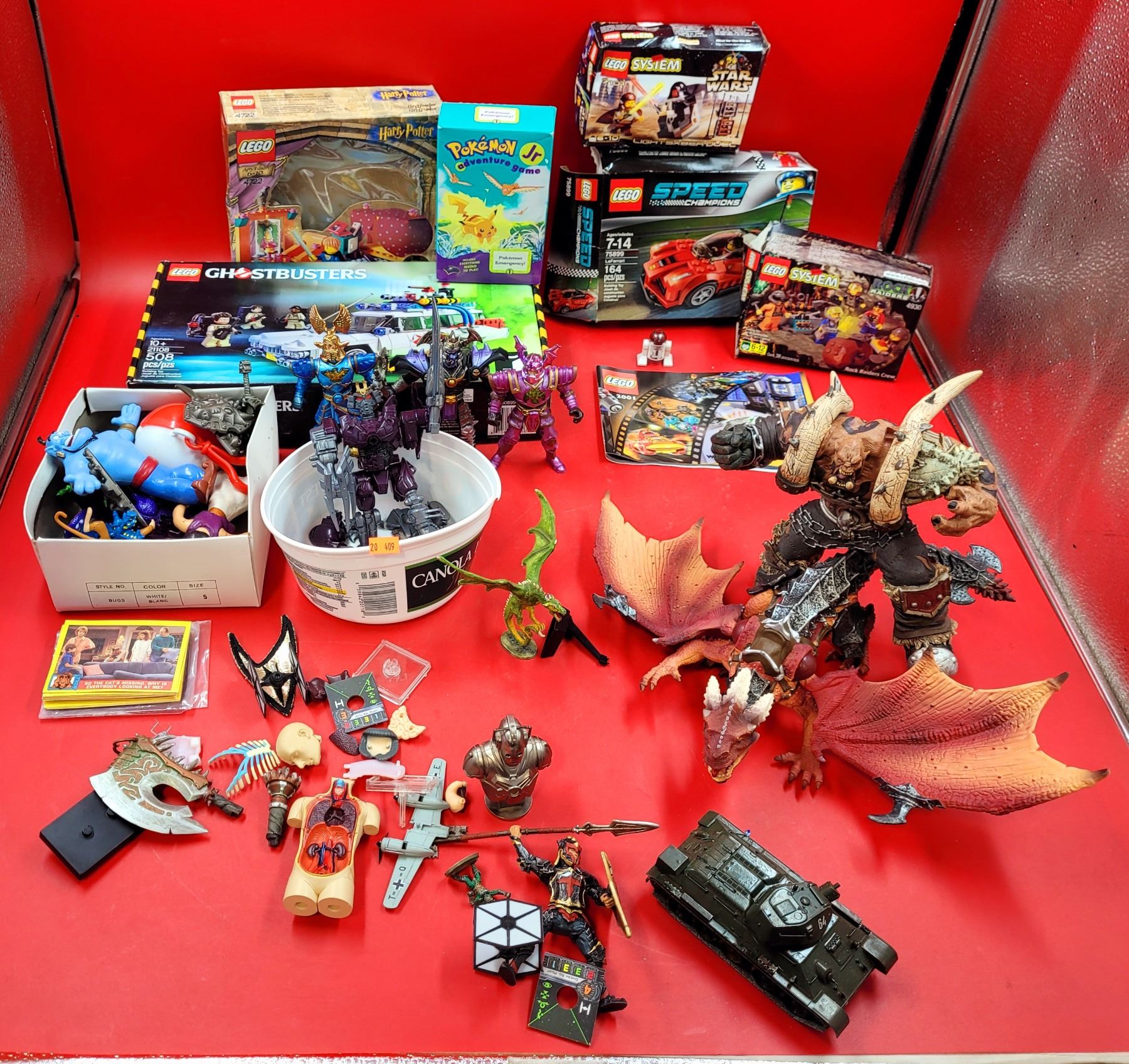 Assorted Toy Lot w/ Mostly Empty Lego Boxes, Plastic Characters, Alf Trading Cards, & More