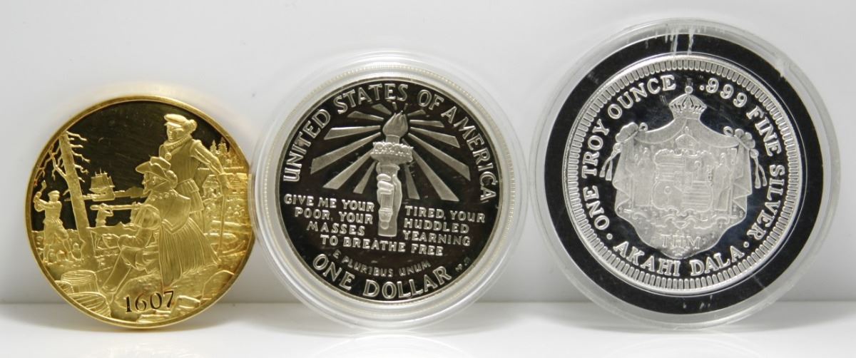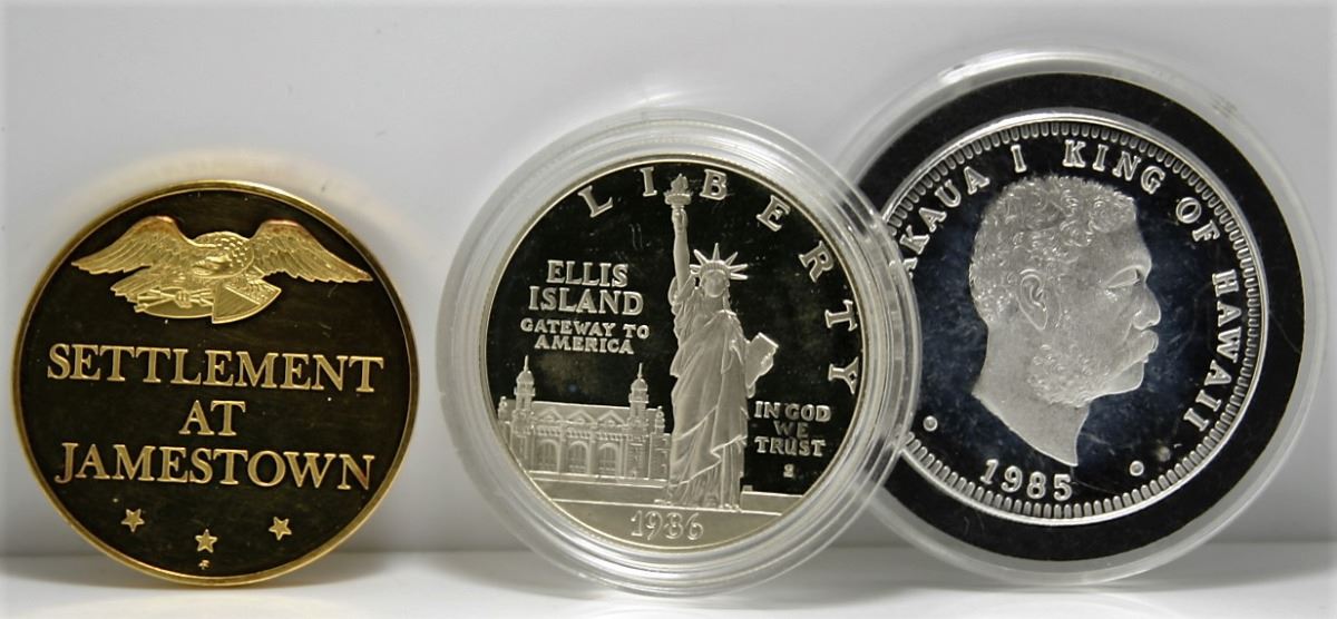 3 Assorted United States Silver Coins / Medallions -- 1985 King of Hawaii 1 Oz Round, 1986 Ellis Island Dollar & Gold Clad over Sterling Jamestown Medal