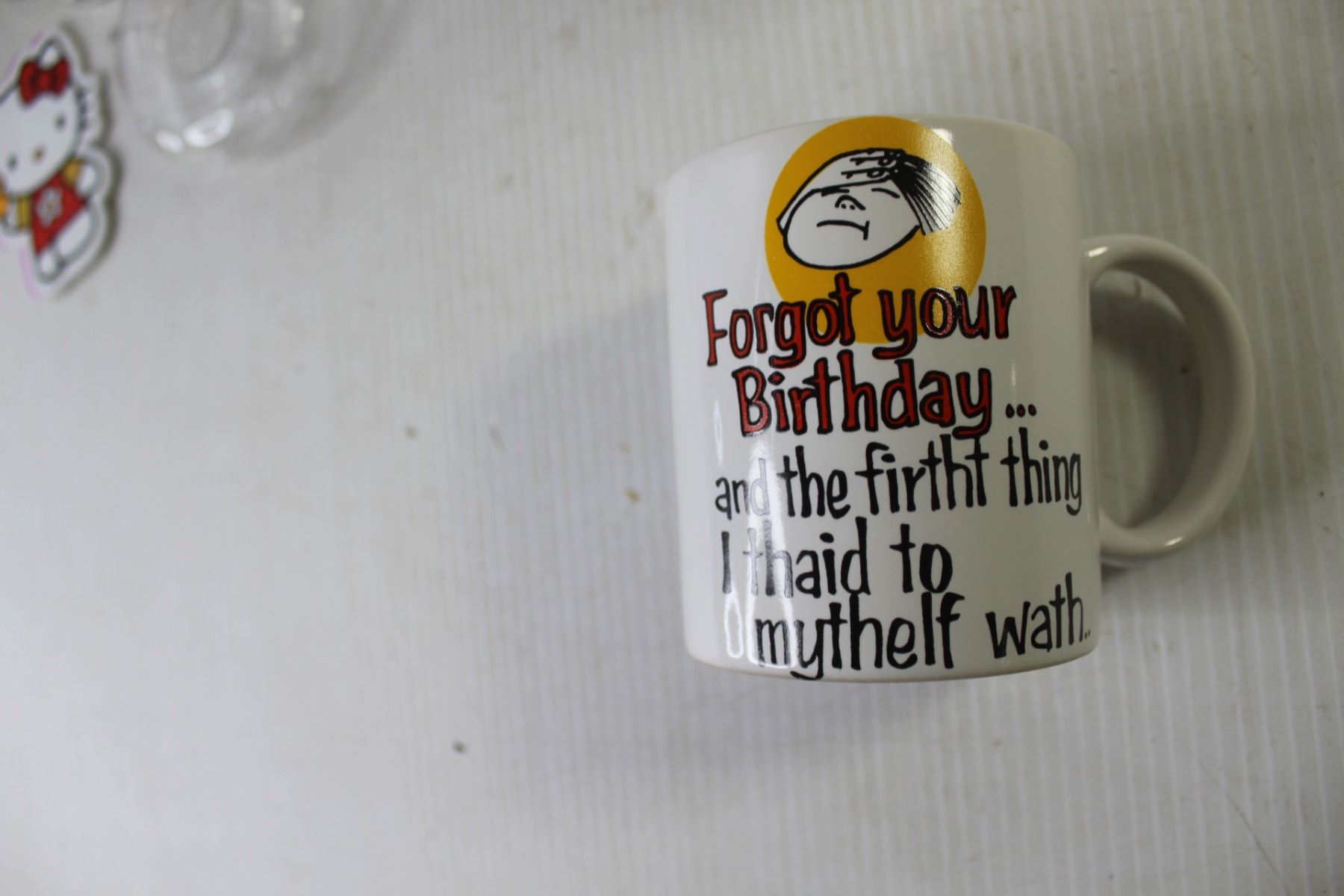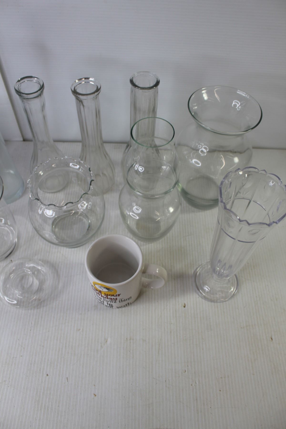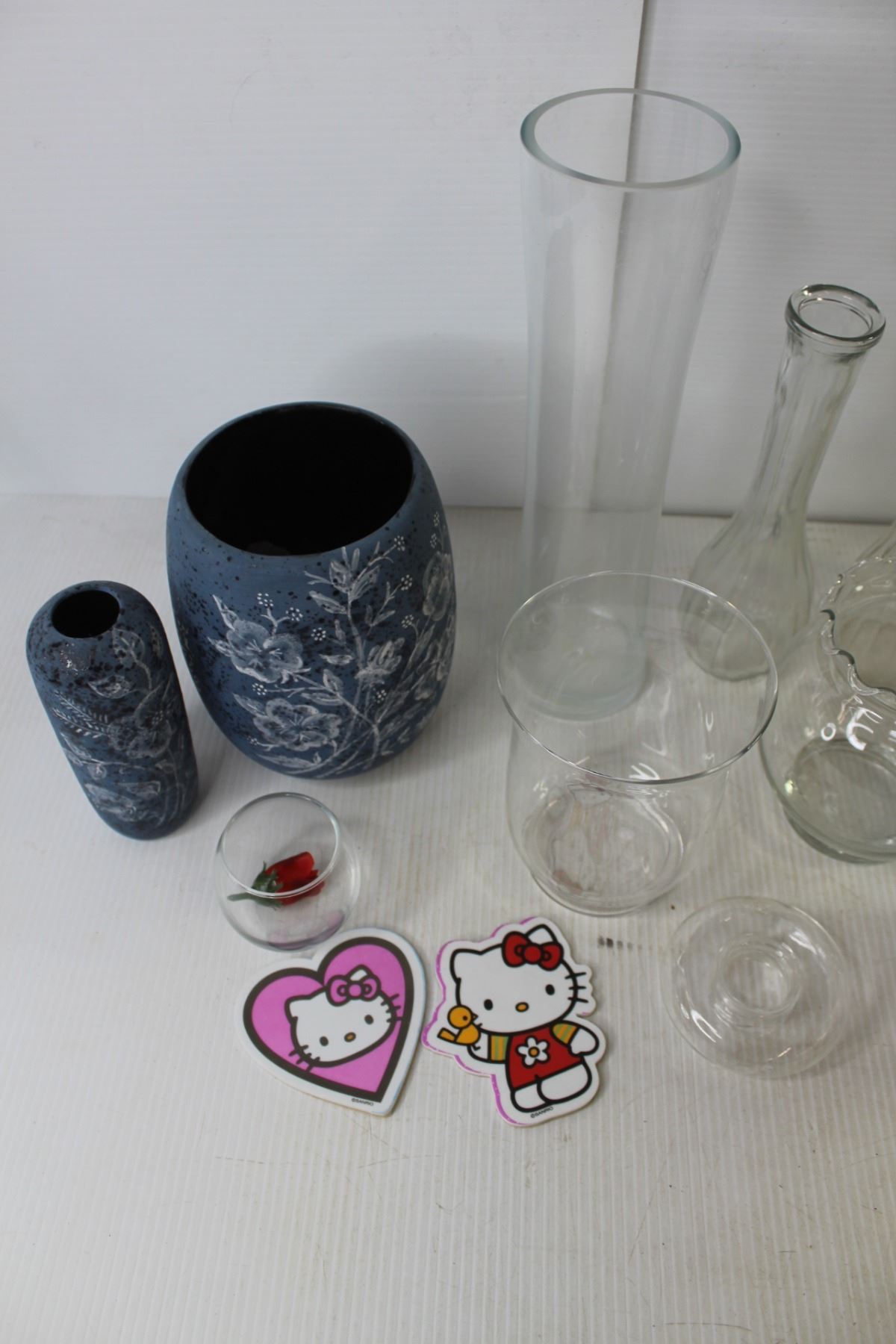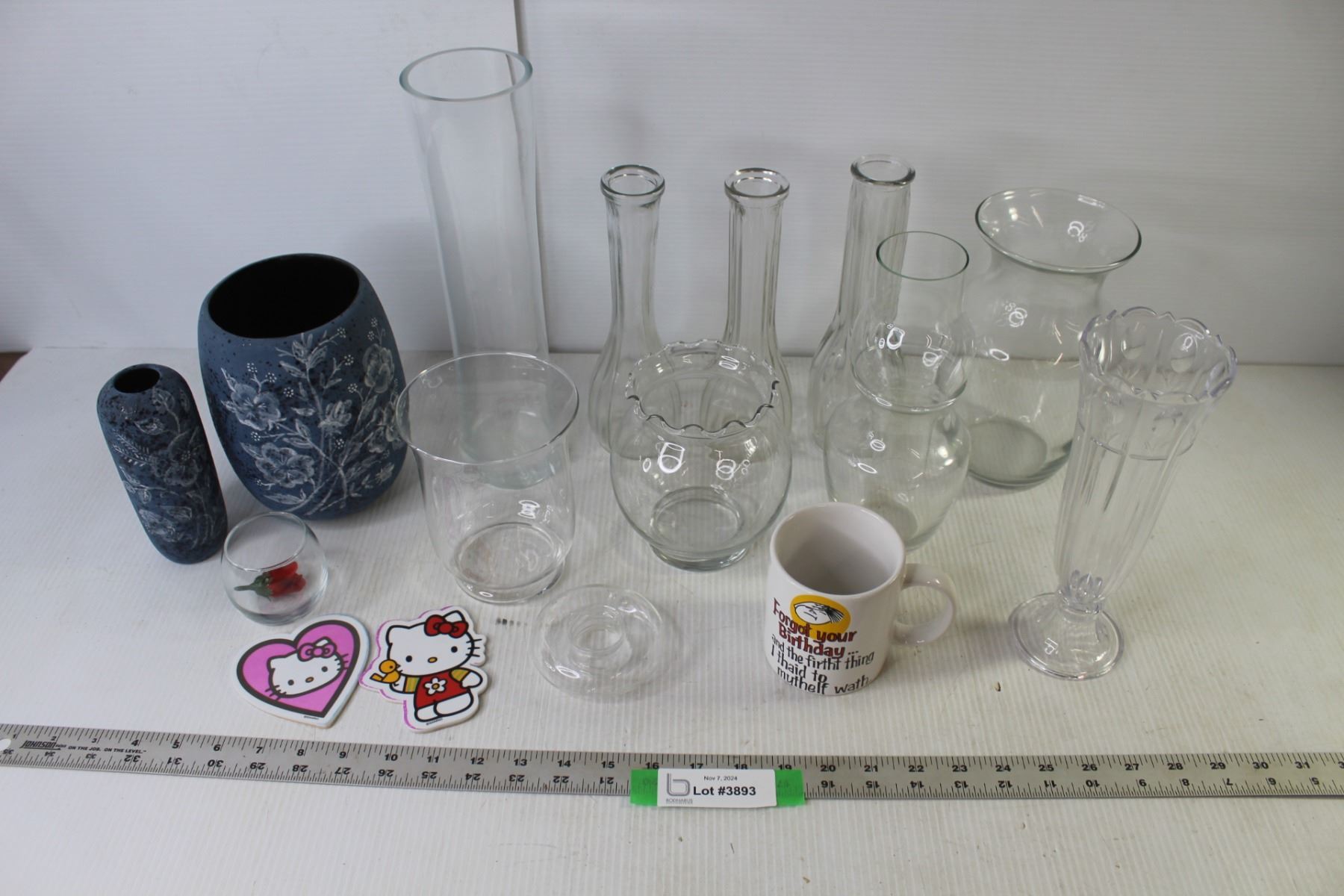Assorted Vases, "Lisp" Coffee Mug, Hello Kitty Foam Cutouts, Misc.
