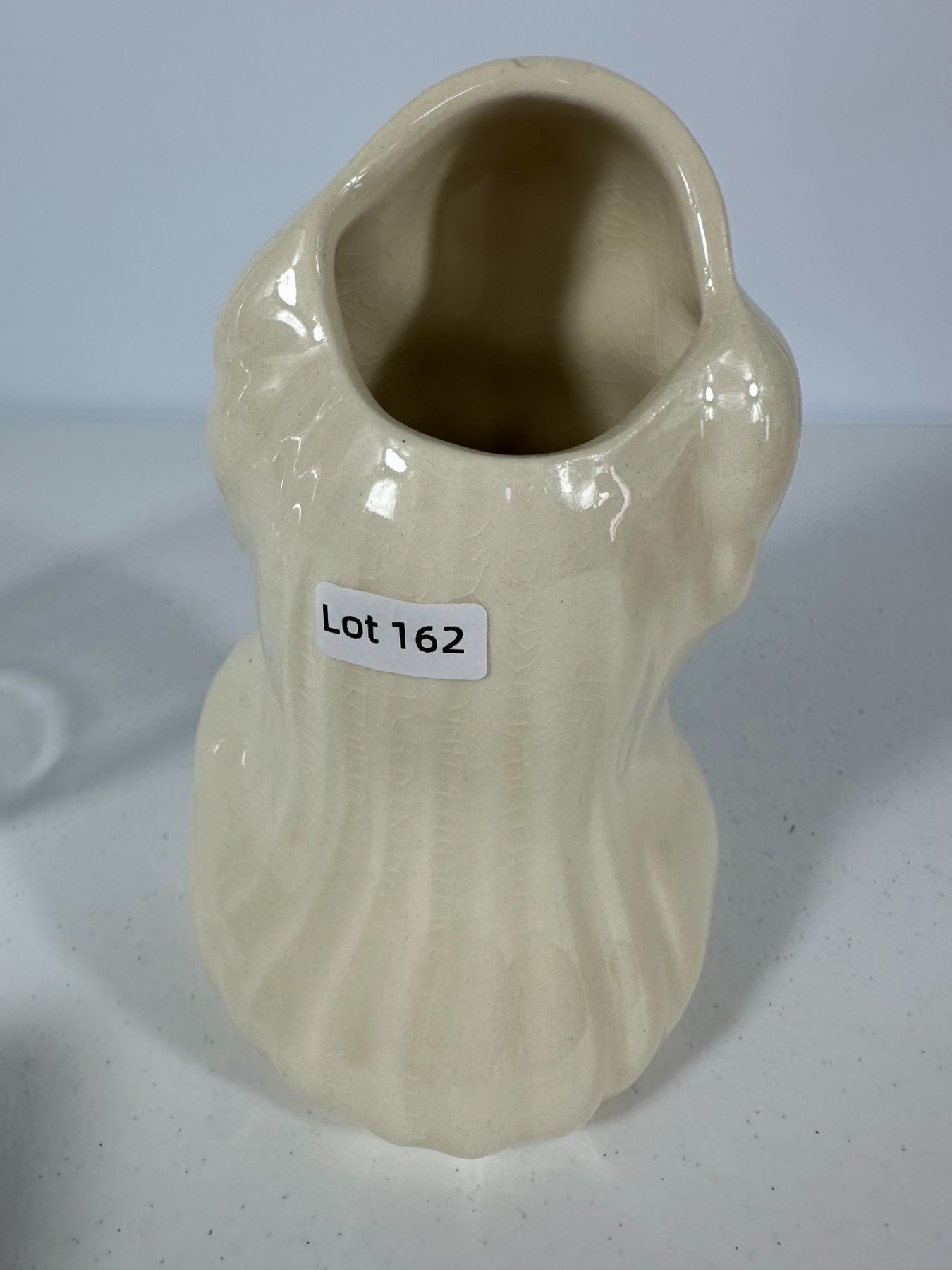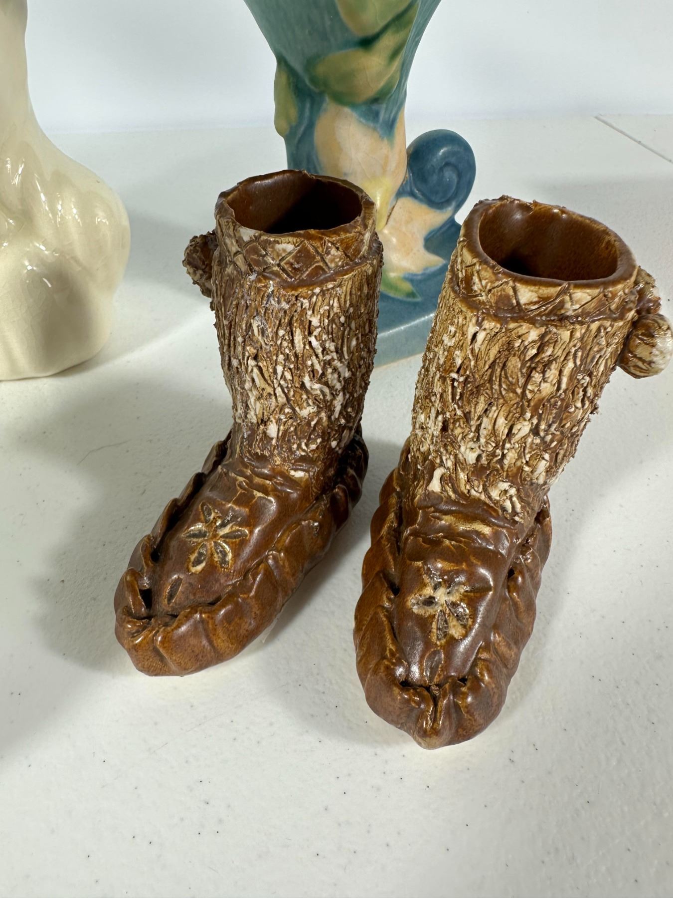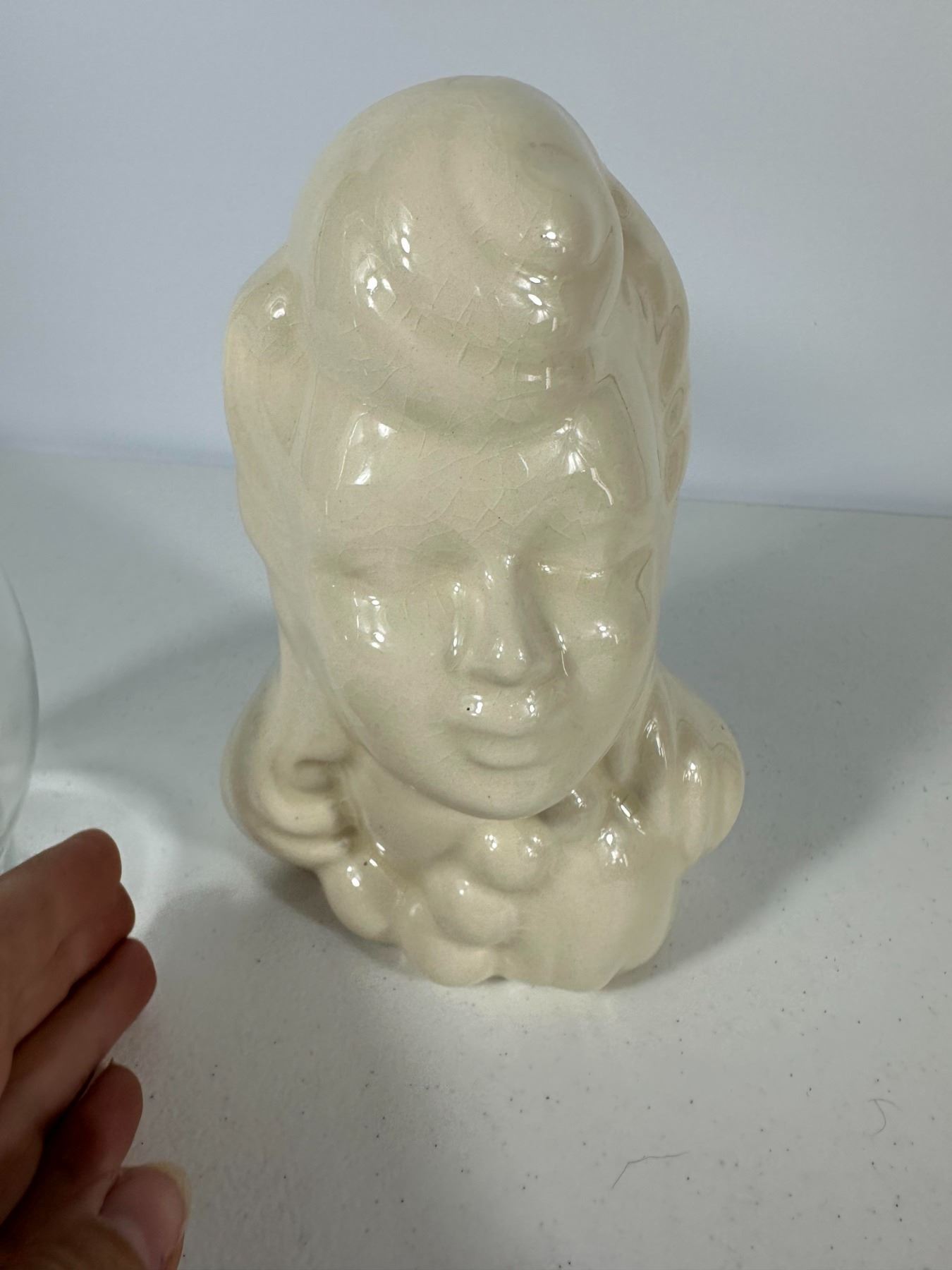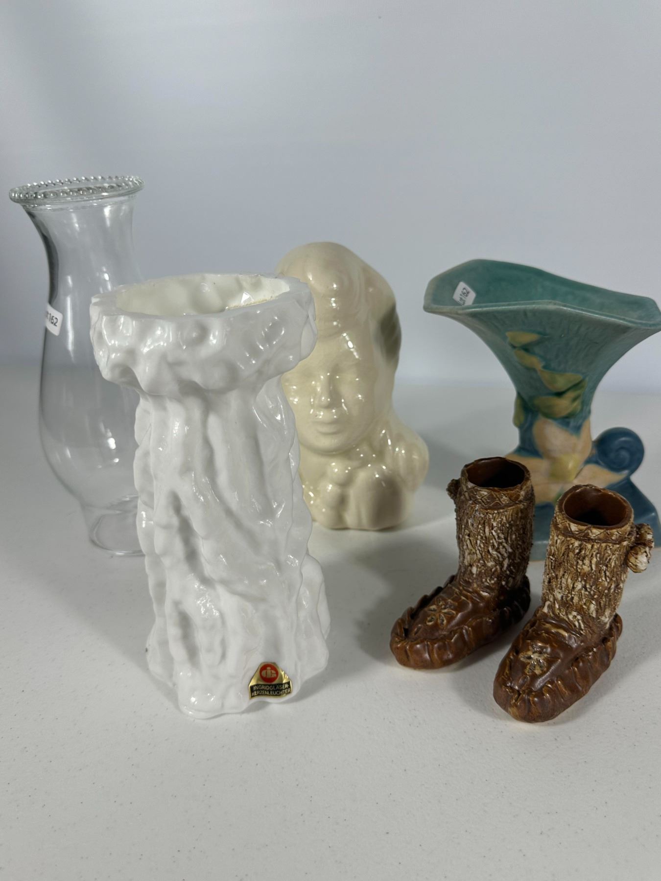 Includes a mix of vintage vases and figural planters including a lady head vase, textured white vase, glass vase, Roseville-style vase, and novelty moccasin-style planters.