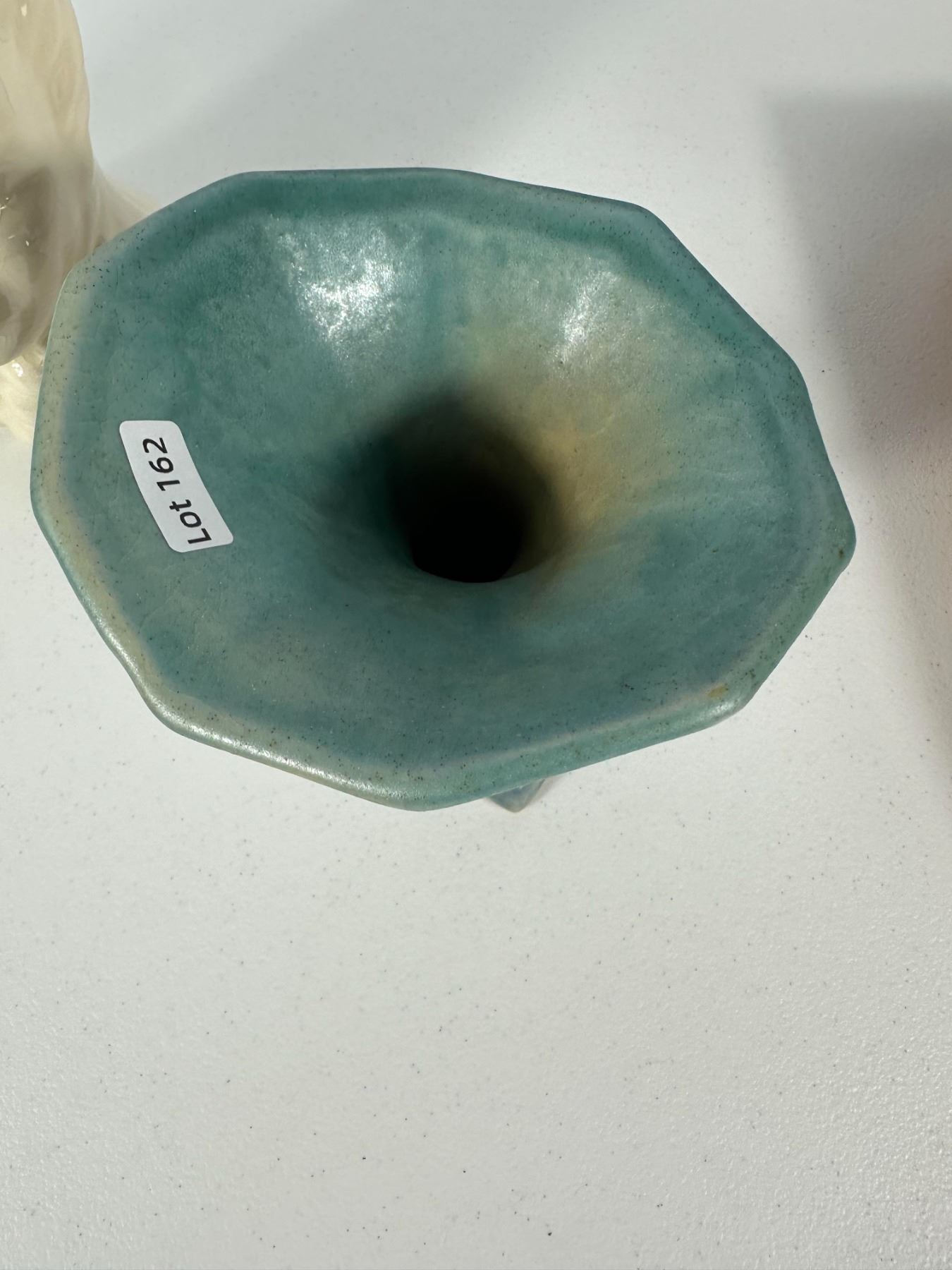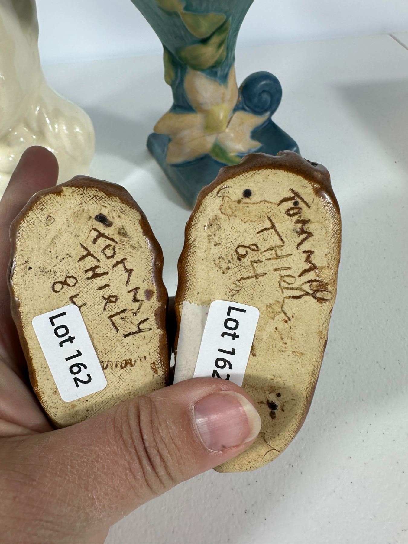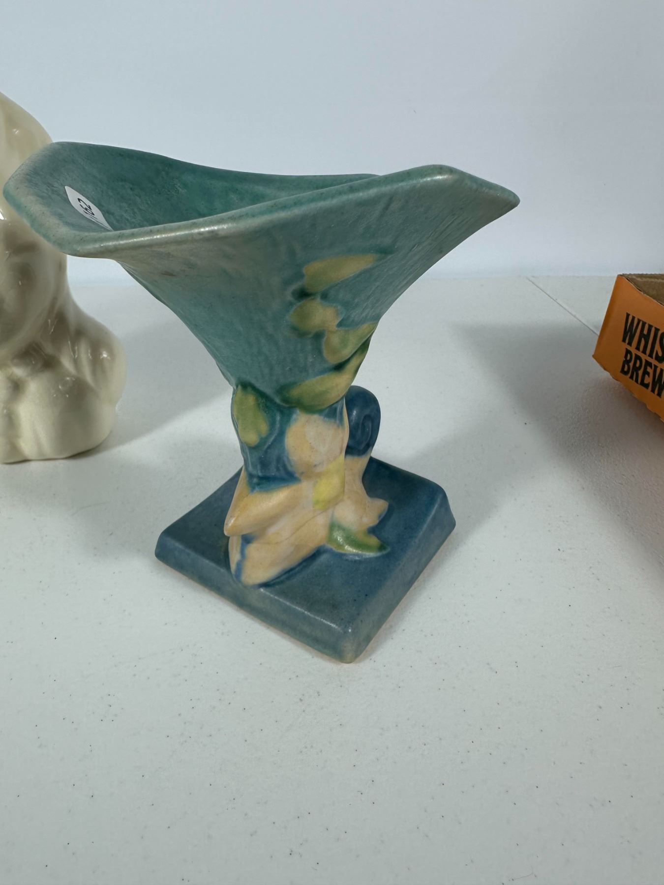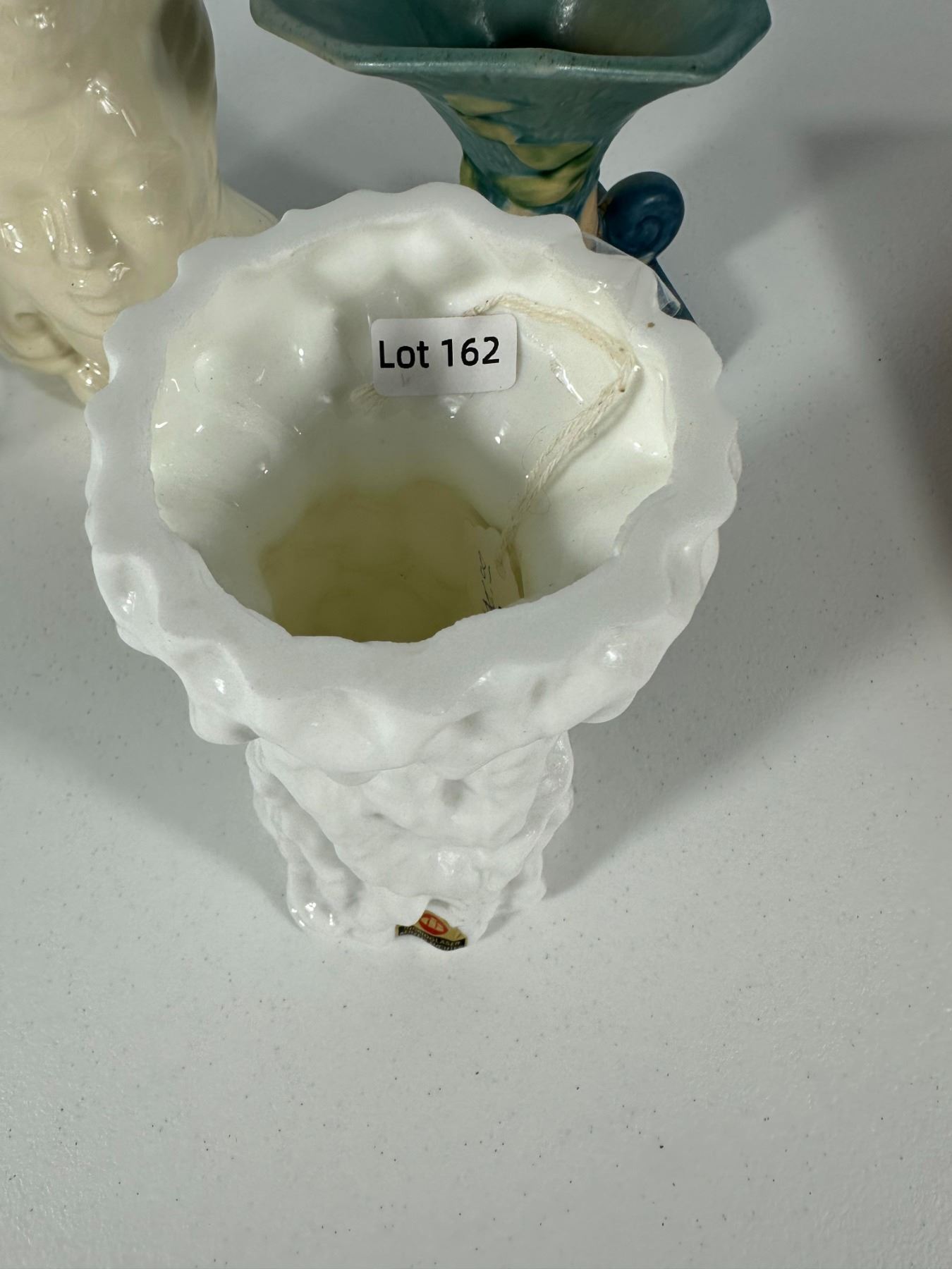 Includes a mix of vintage vases and figural planters including a lady head vase, textured white vase, glass vase, Roseville-style vase, and novelty moccasin-style planters.