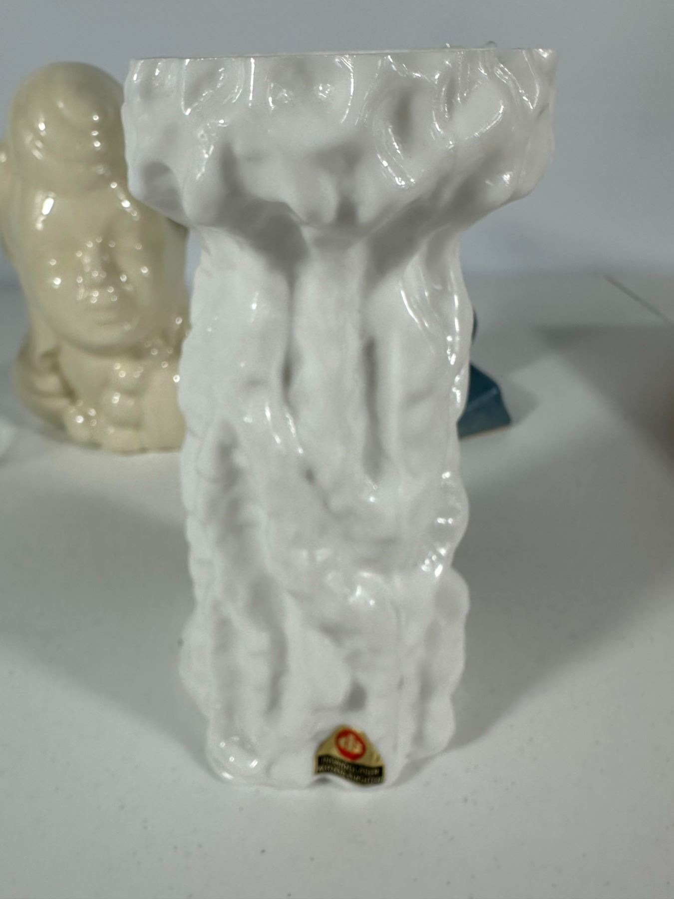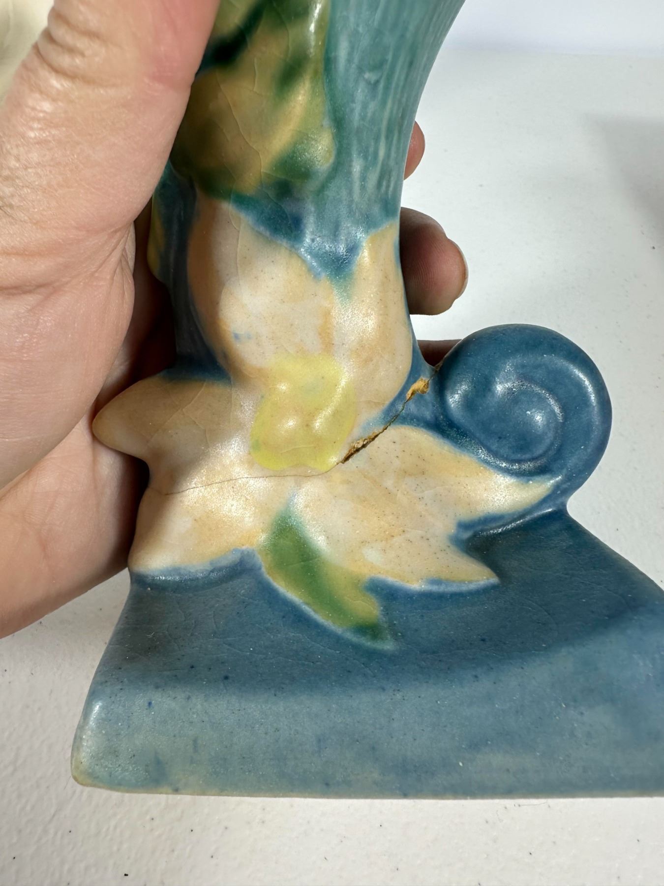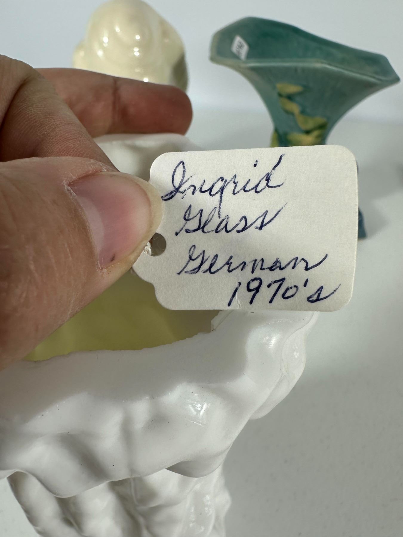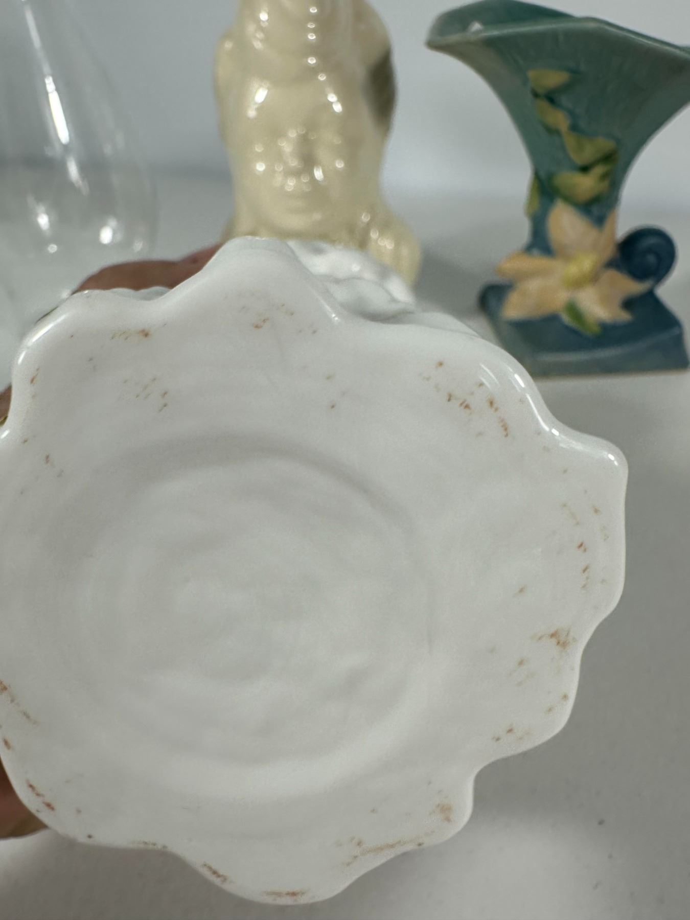 Includes a mix of vintage vases and figural planters including a lady head vase, textured white vase, glass vase, Roseville-style vase, and novelty moccasin-style planters.
