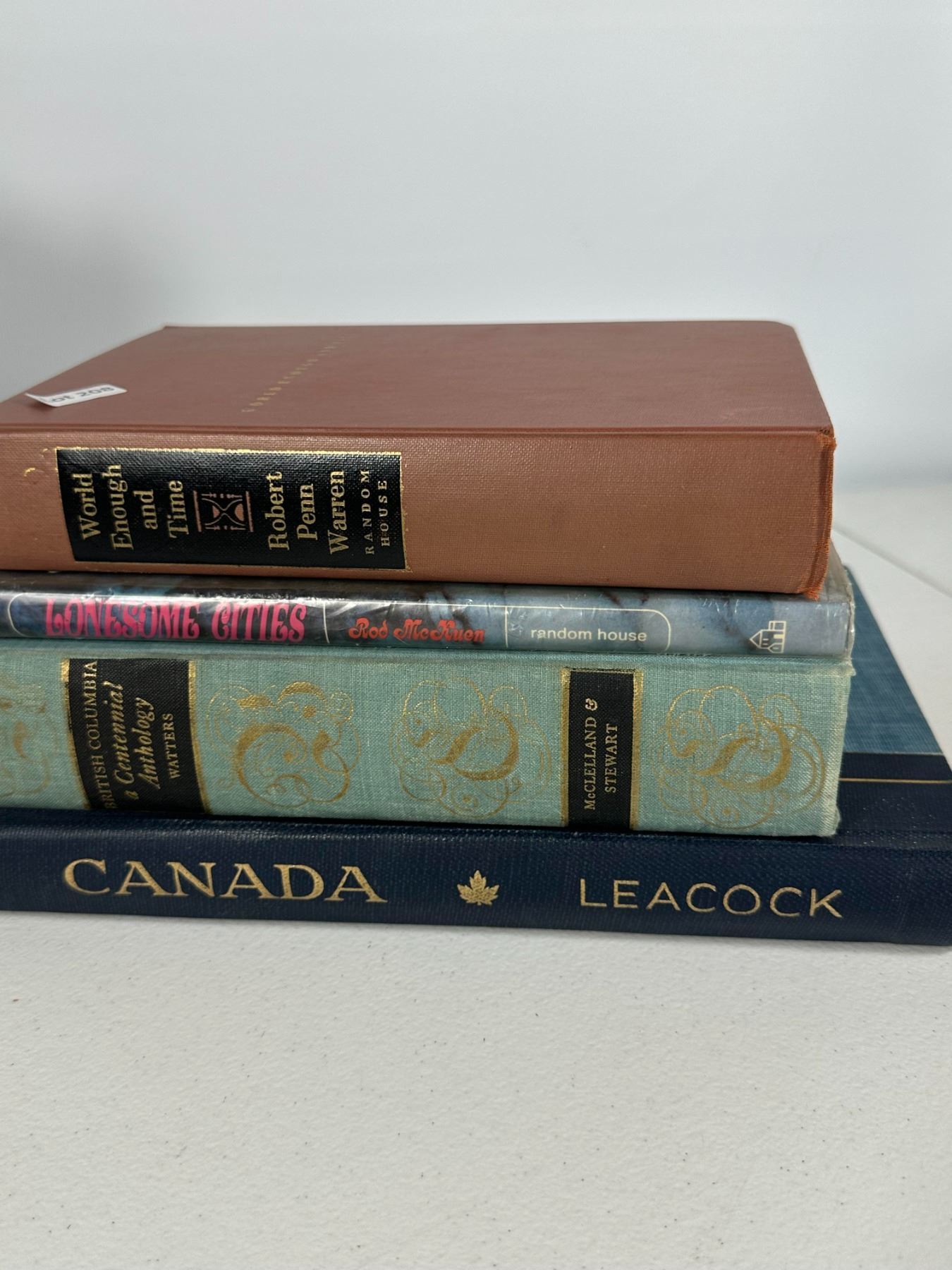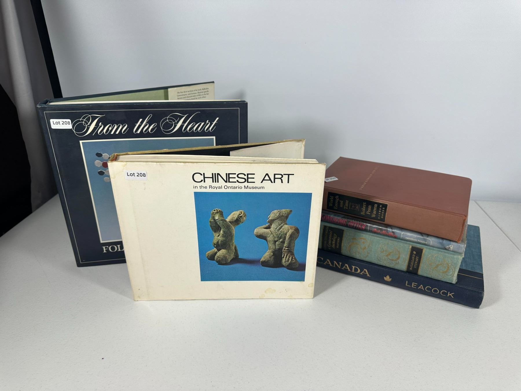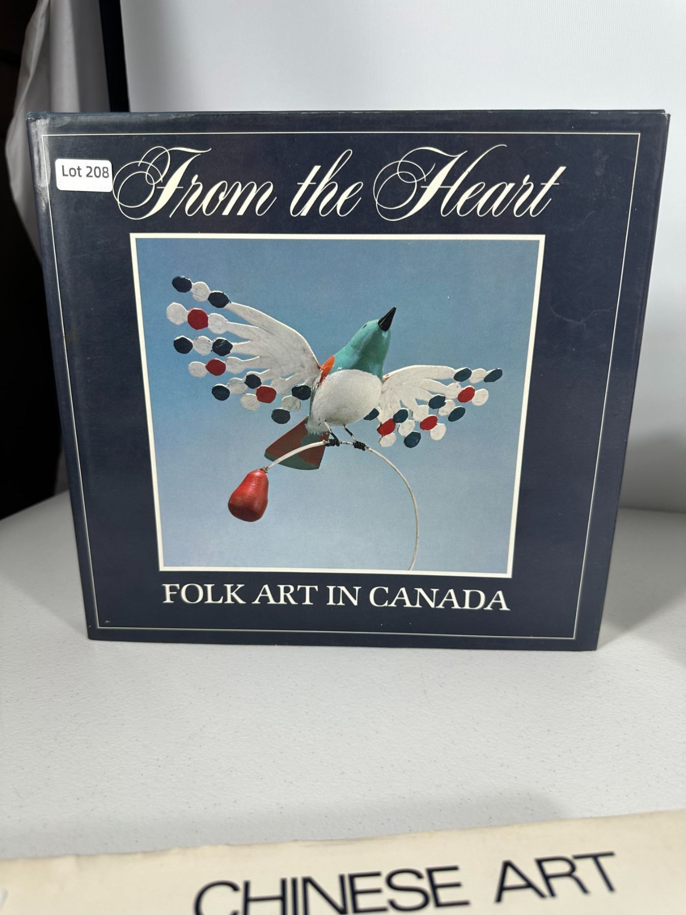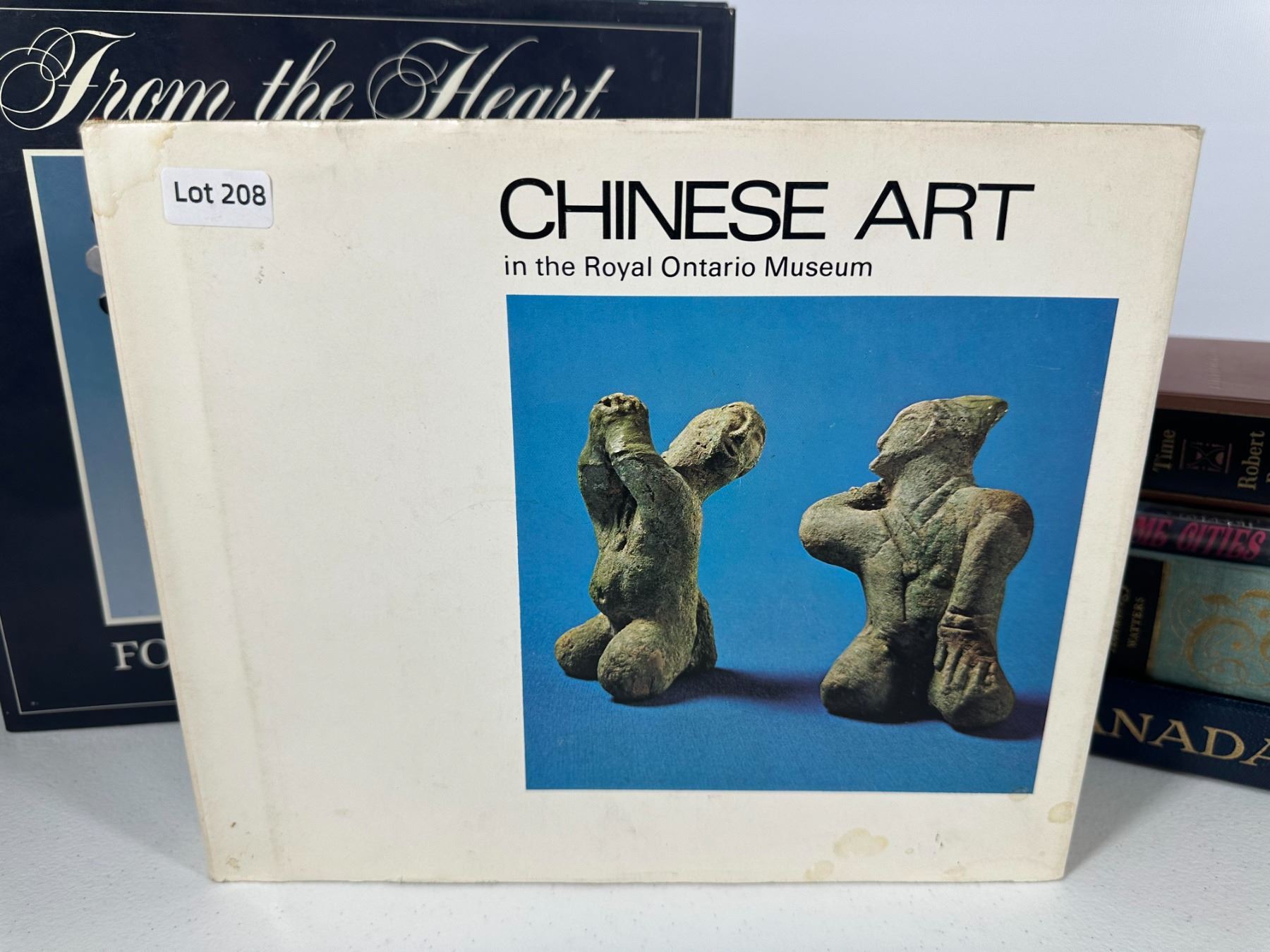 Includes a grouping of vintage books such as 'Chinese Art in the Royal Ontario Museum', 'From the Heart', and Canadian literature. A mixed literary collection.