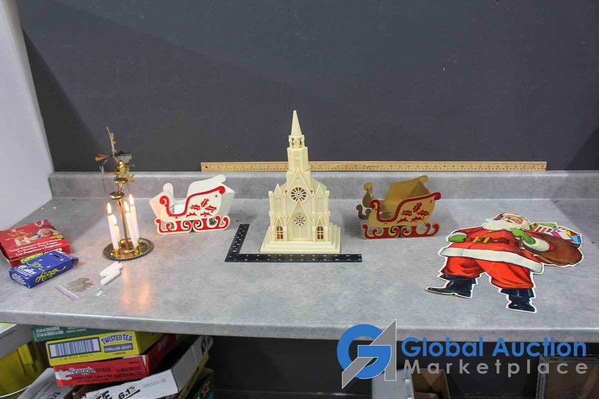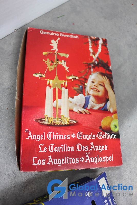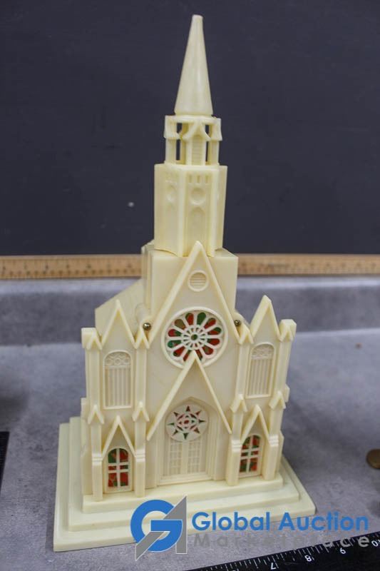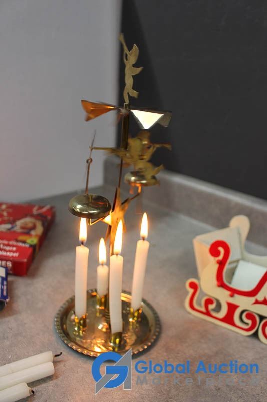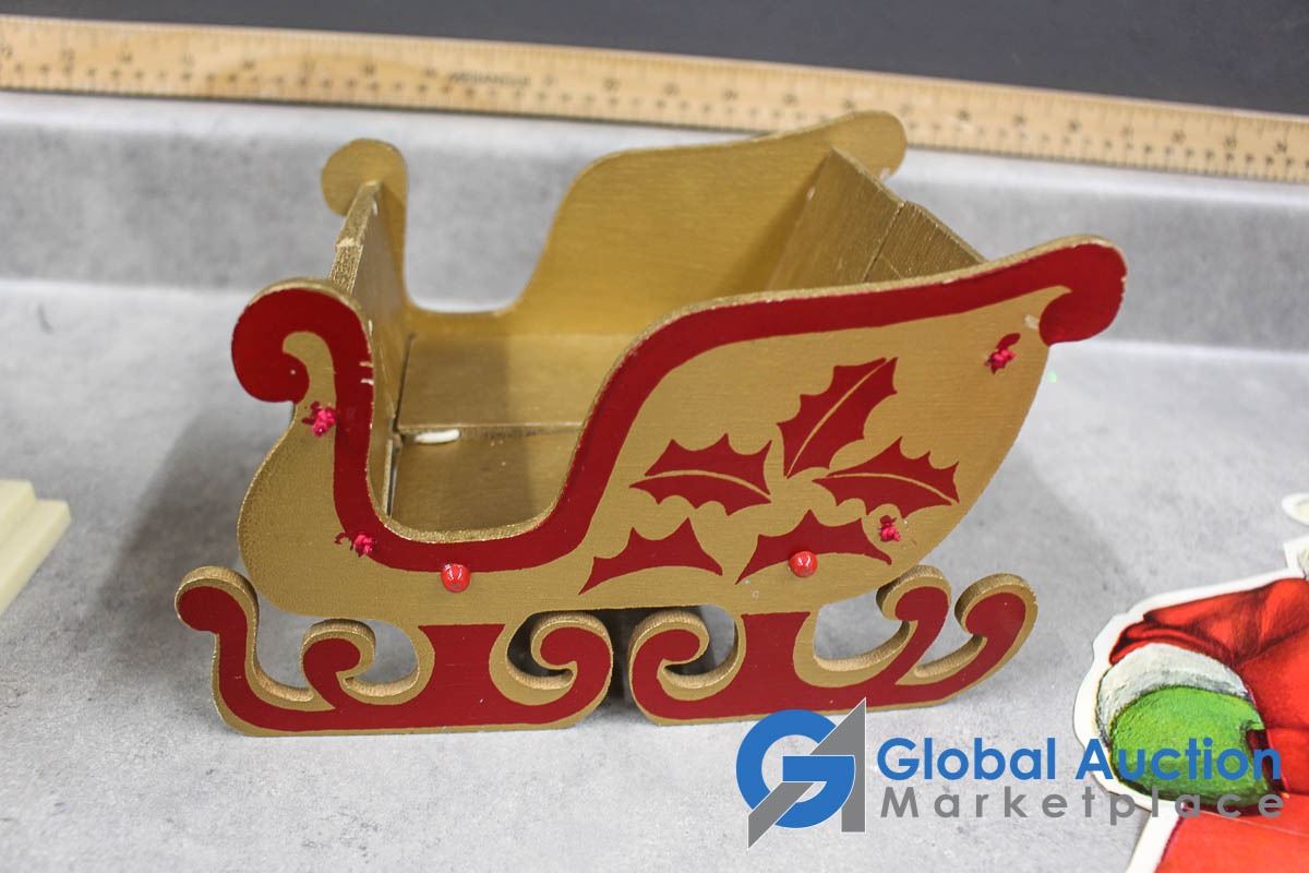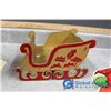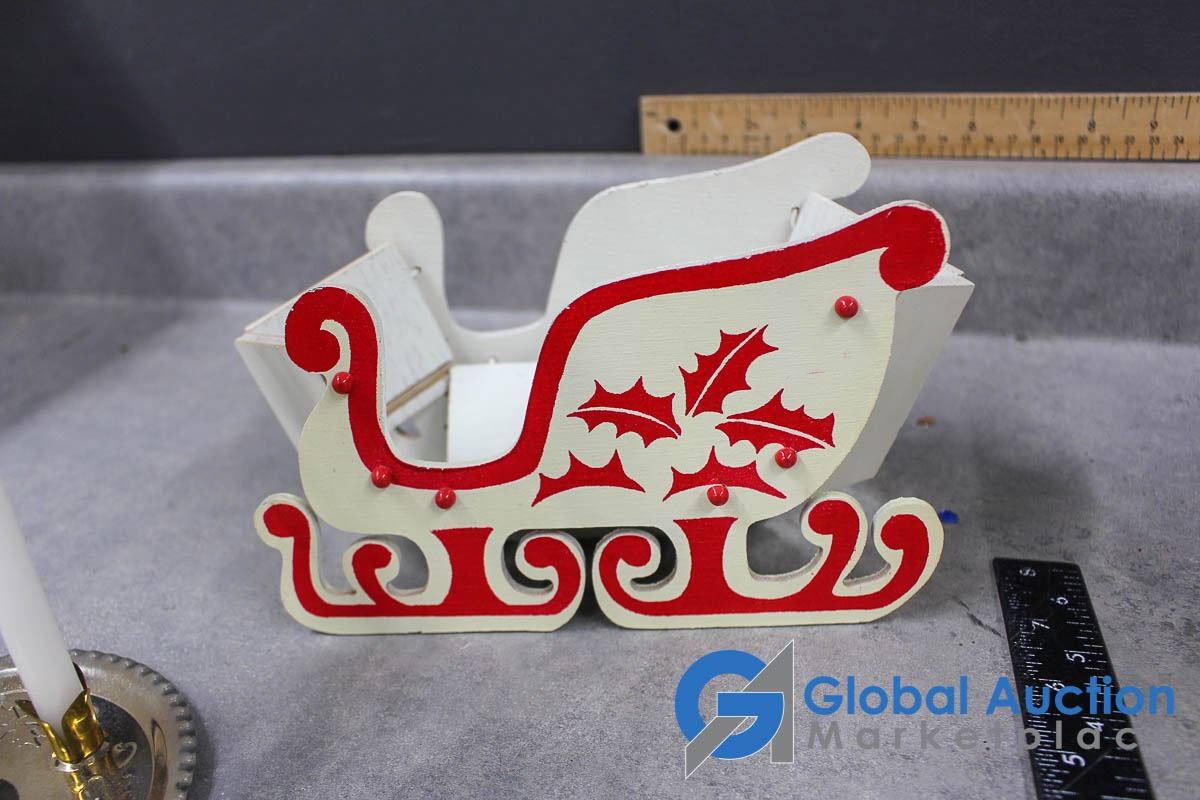 (2) Wooden collapsible sleighs - Made in Japan - (possibly from the 1950's); musical light up church made in Hong Kong - music works, light doesn't; brass chime & candles.
