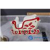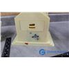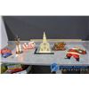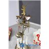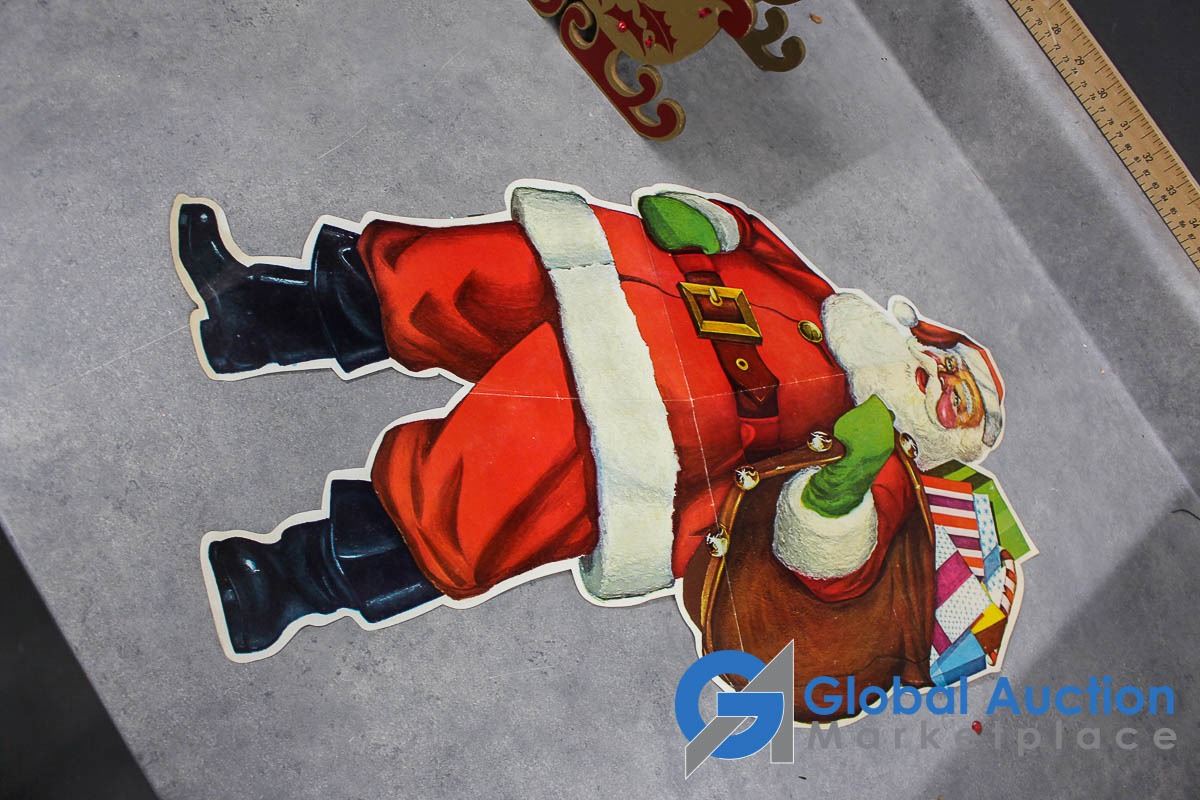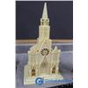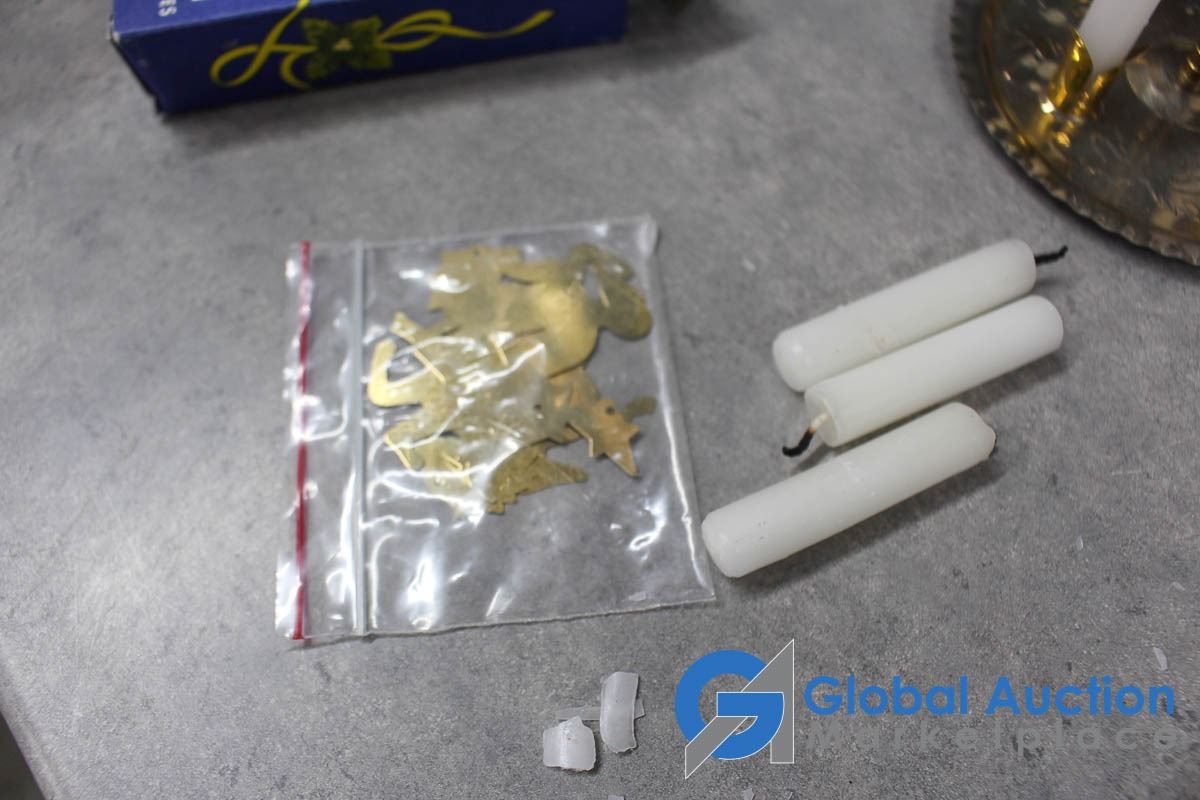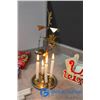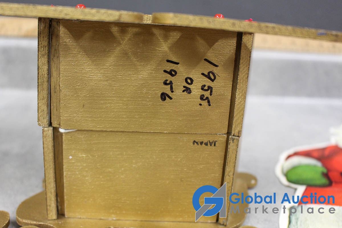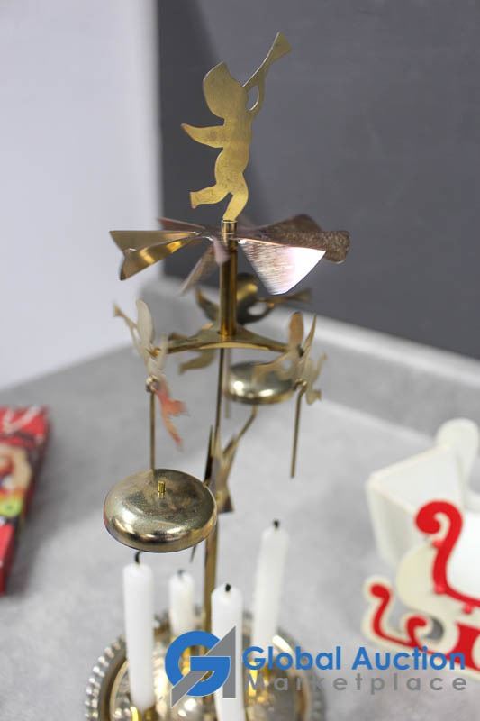 (2) Wooden collapsible sleighs - Made in Japan - (possibly from the 1950's); musical light up church made in Hong Kong - music works, light doesn't; brass chime & candles.