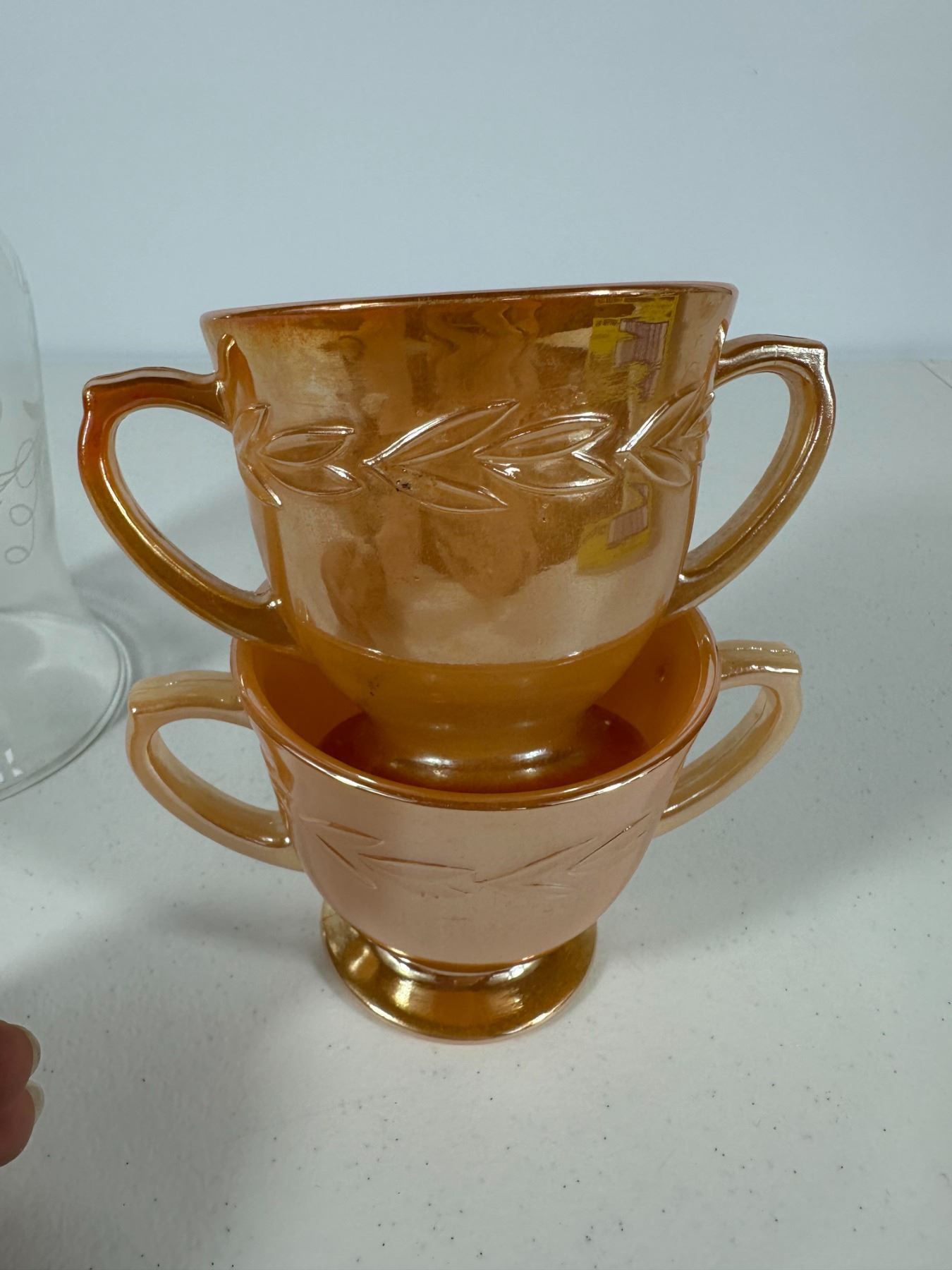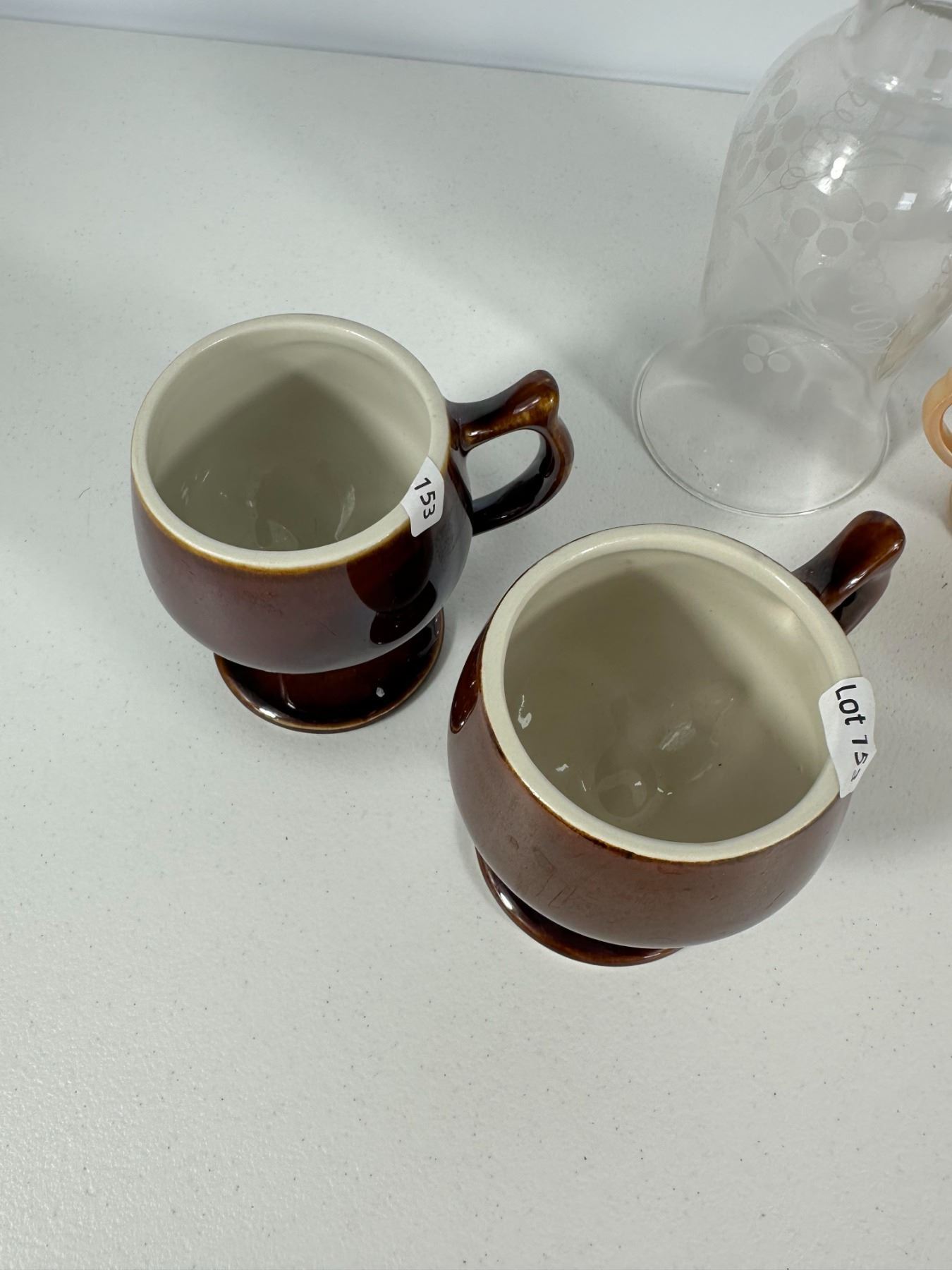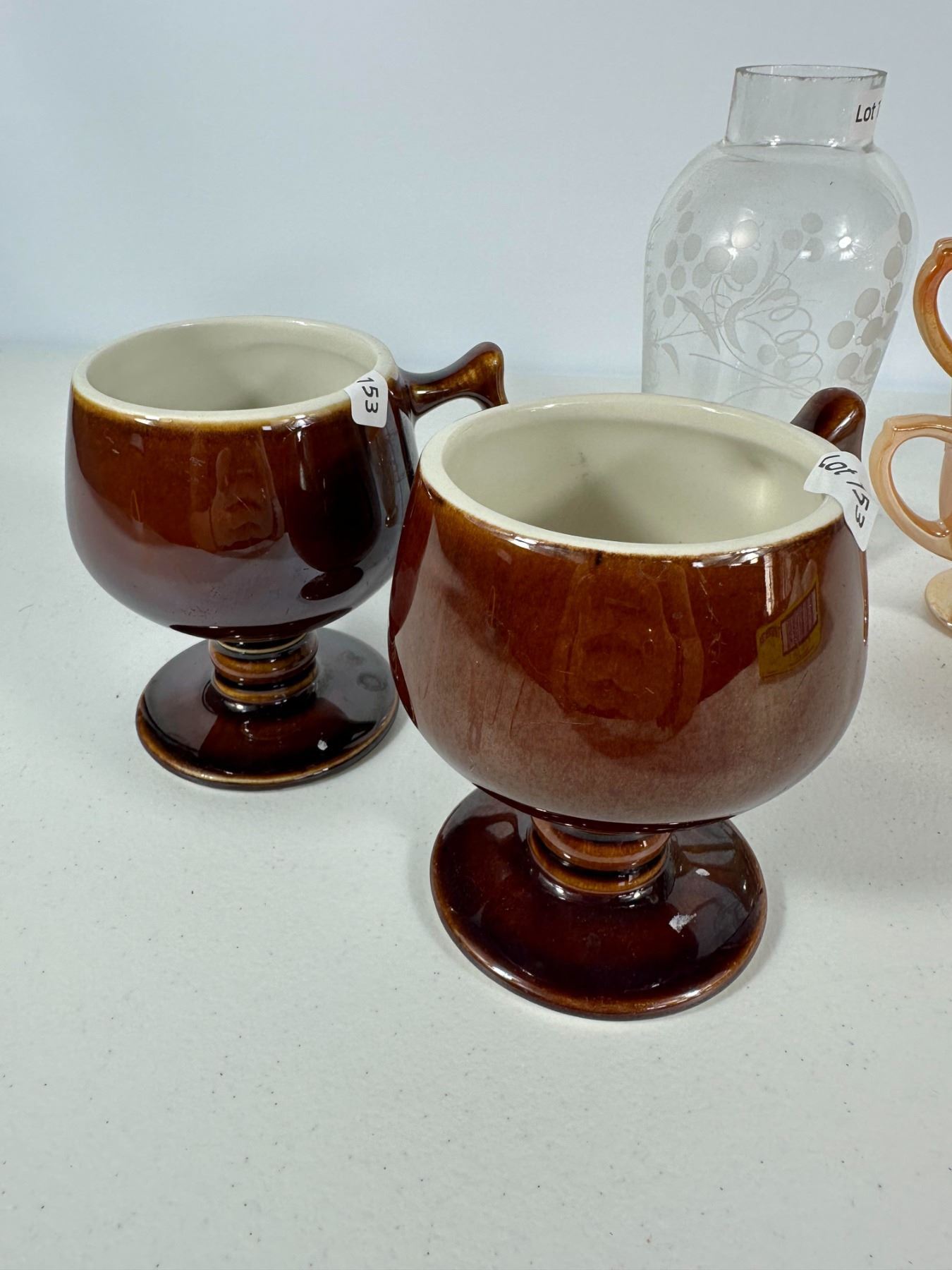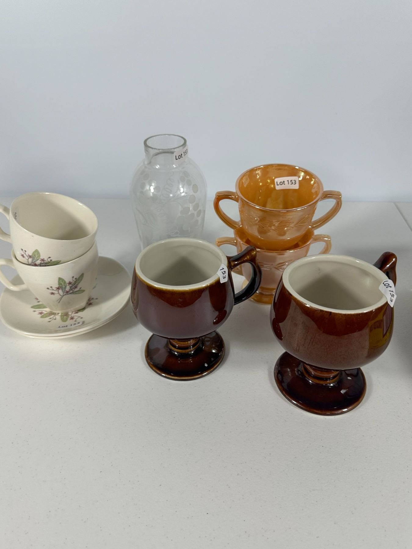 Features a mixed collection of vintage drinkware including lustreware double-handled cups, etched glass bottle, brown pedestal mugs, and floral teacups with saucer. Eclectic grouping for collectors.