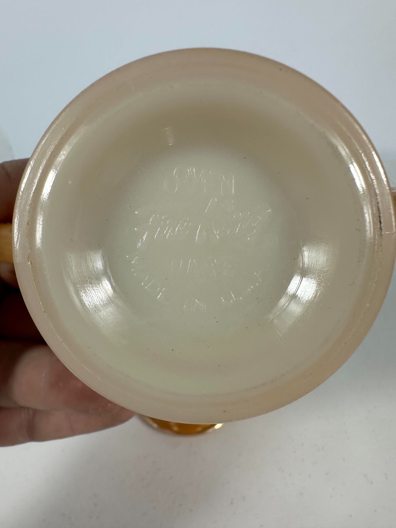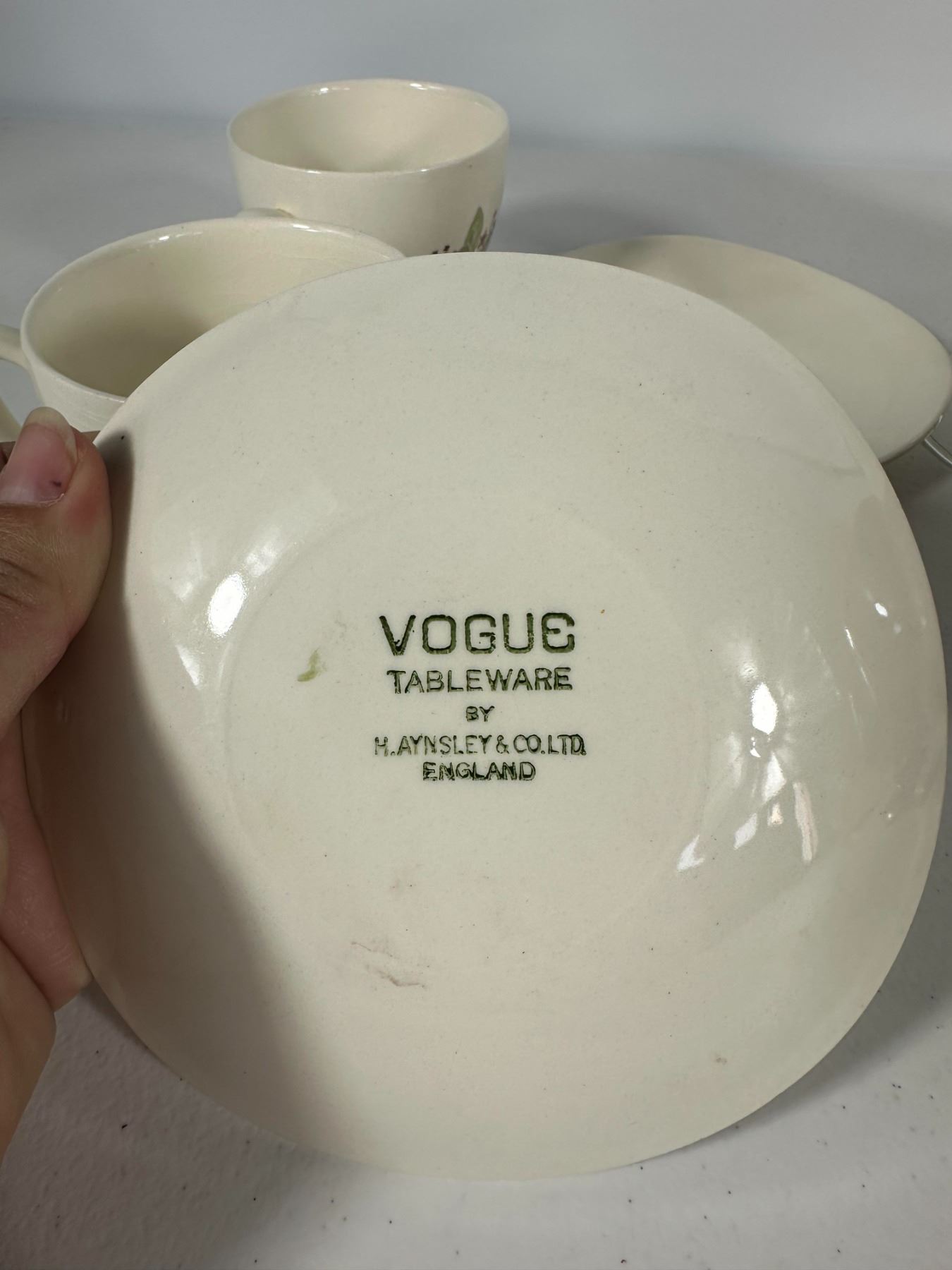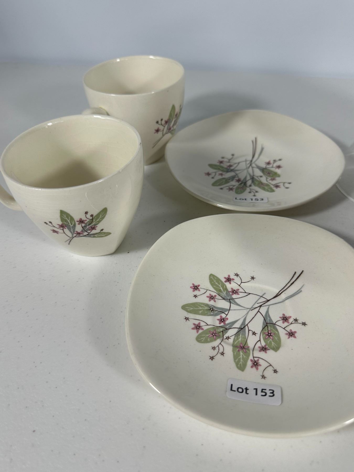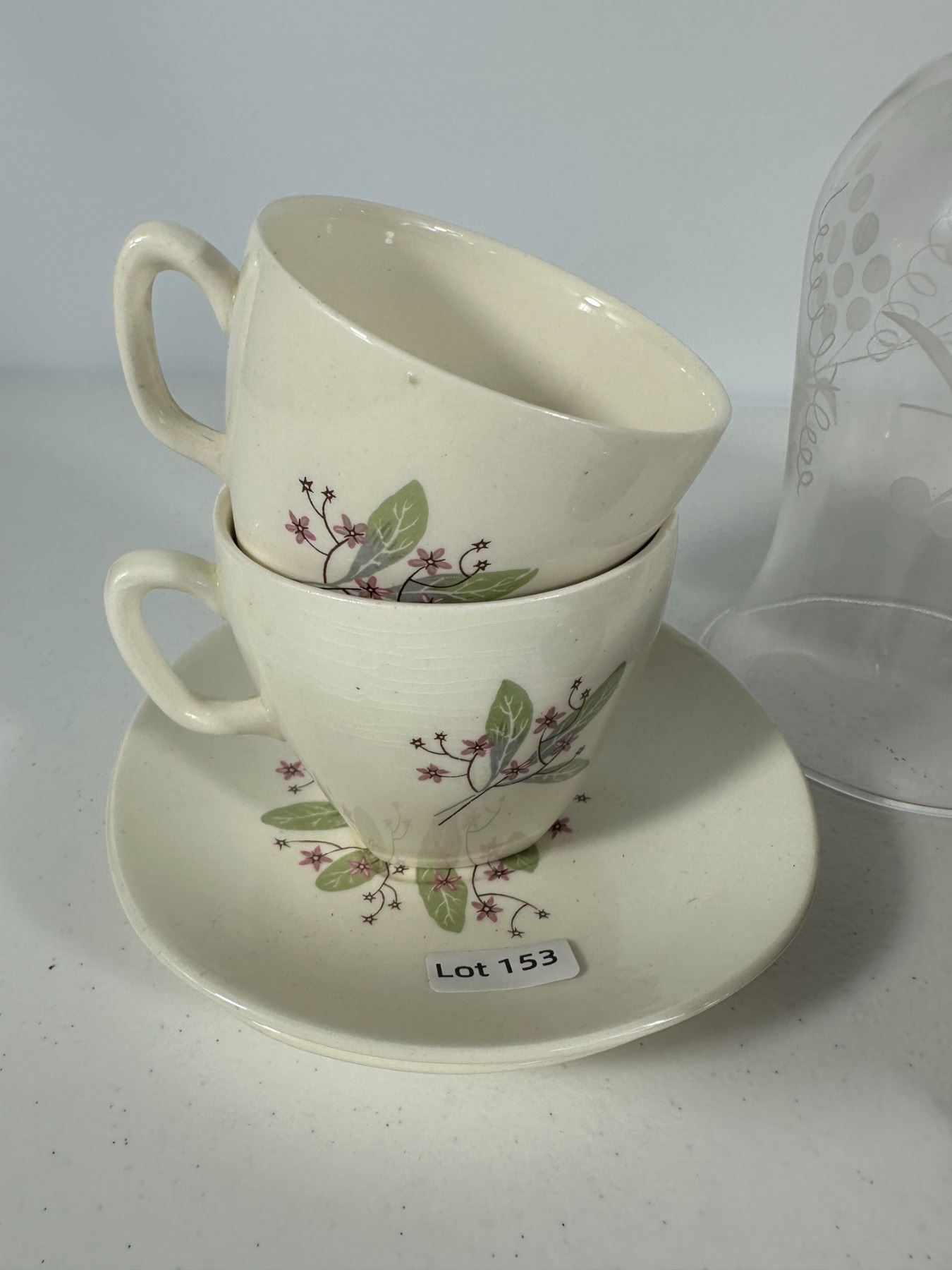 Features a mixed collection of vintage drinkware including lustreware double-handled cups, etched glass bottle, brown pedestal mugs, and floral teacups with saucer. Eclectic grouping for collectors.