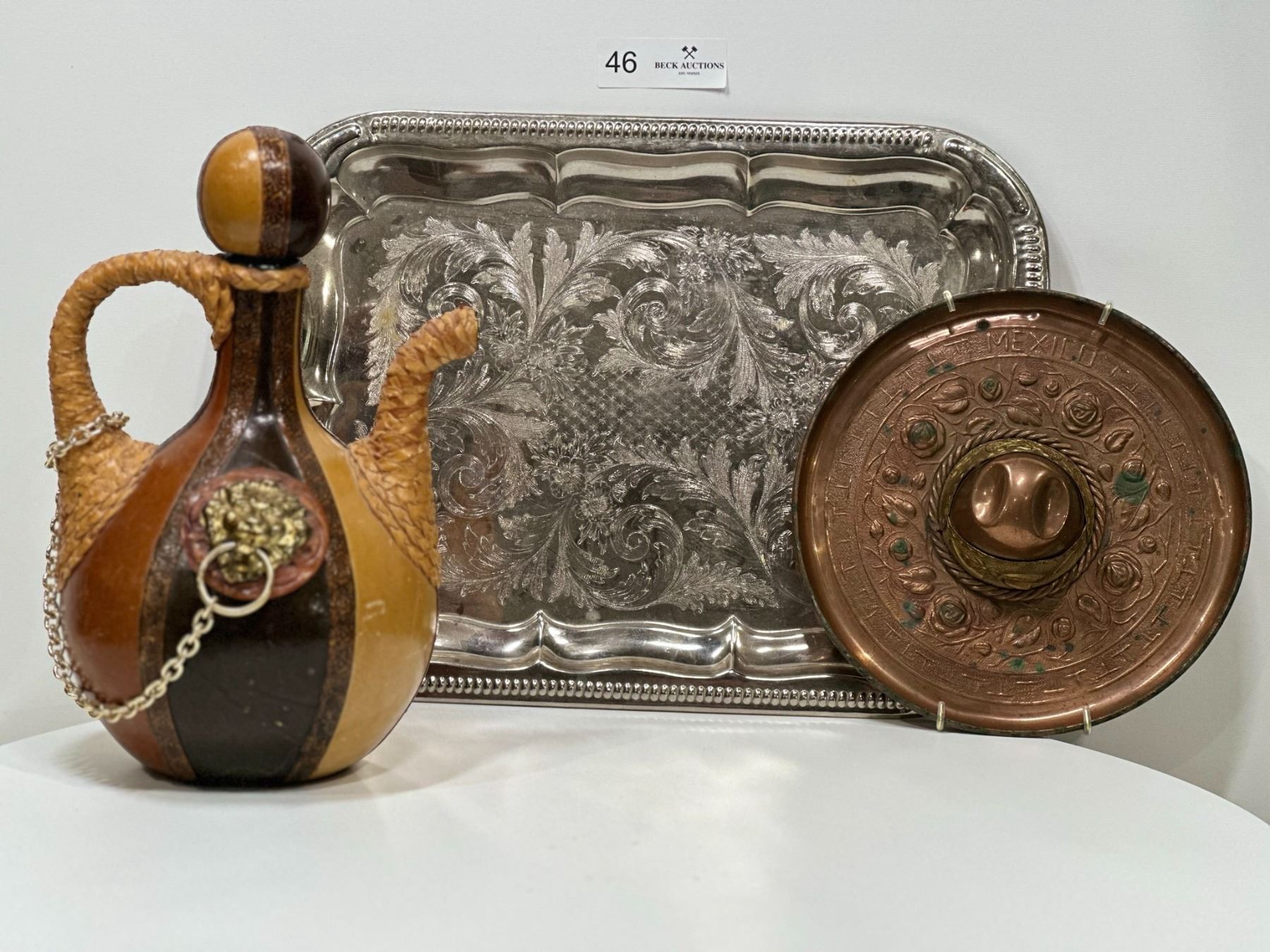 Includes: Serving dish (not silver), sombrero wall piece, and leather wrapped glass liquor decanter.