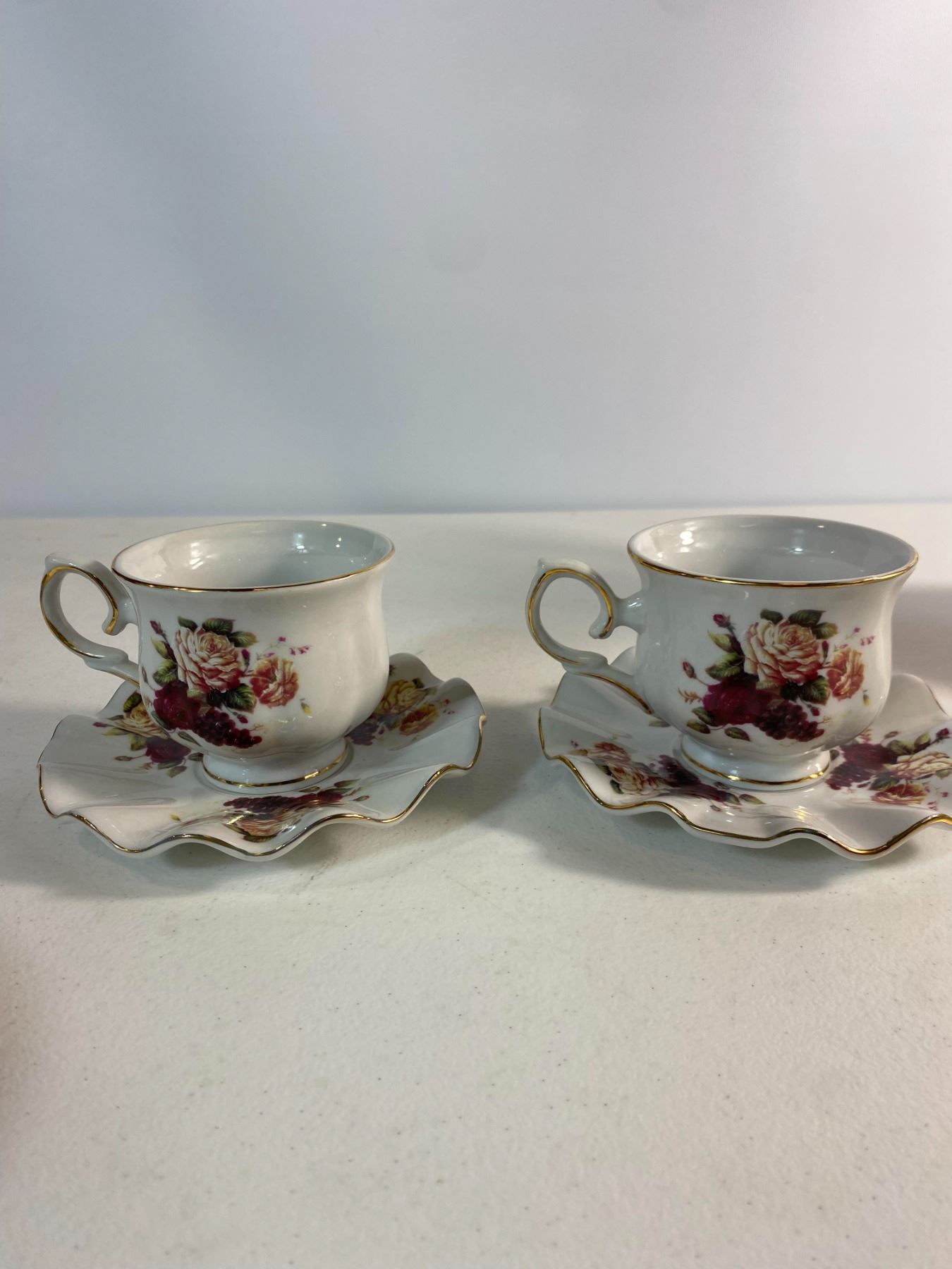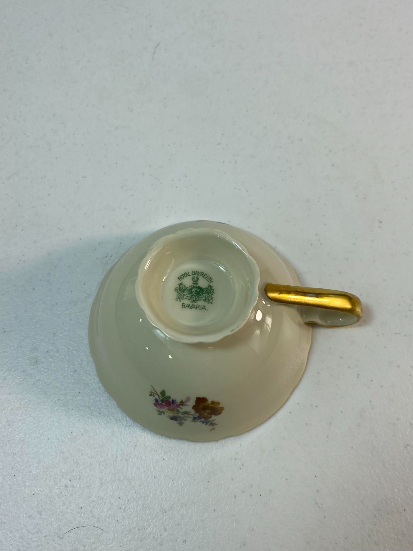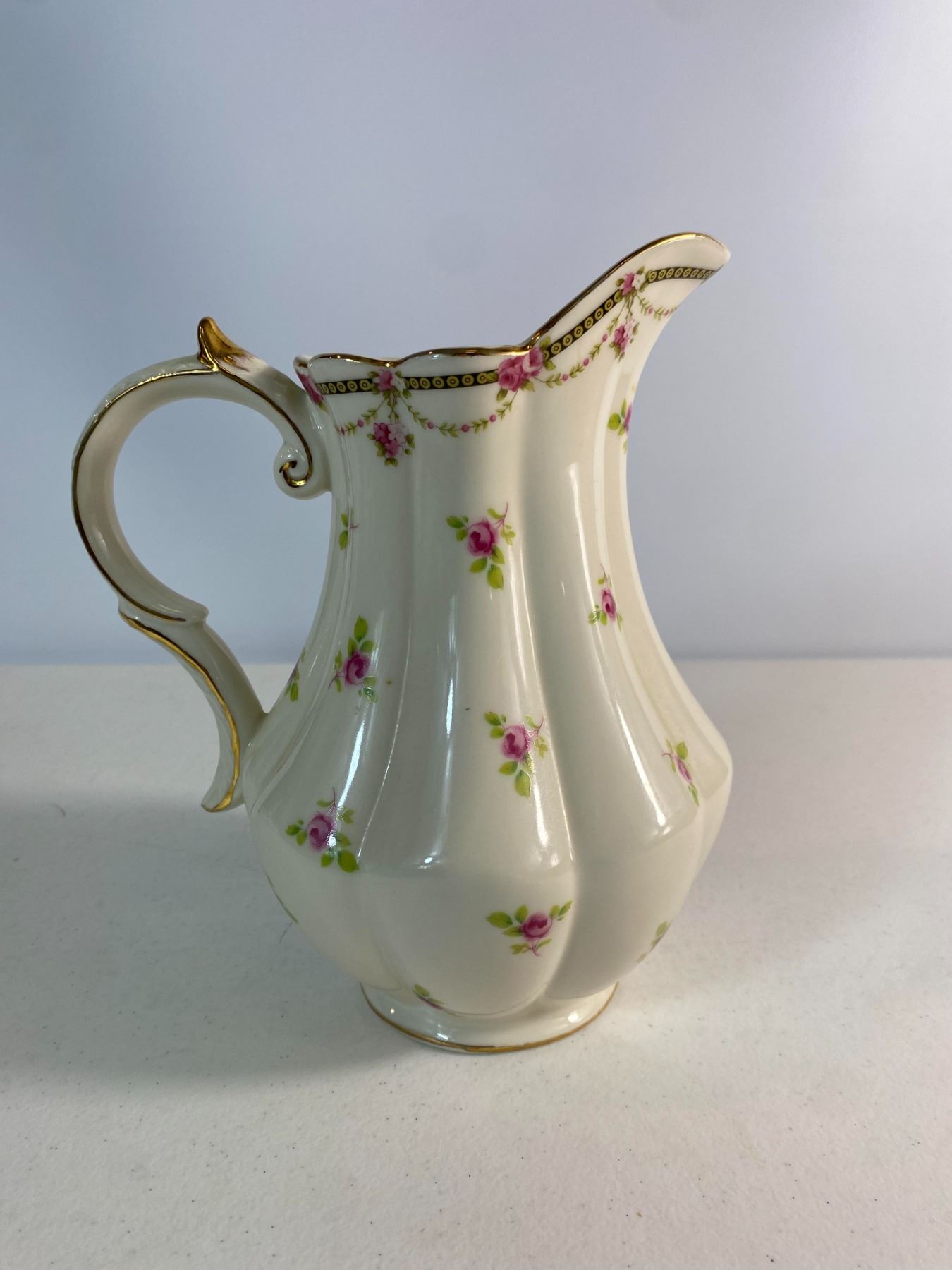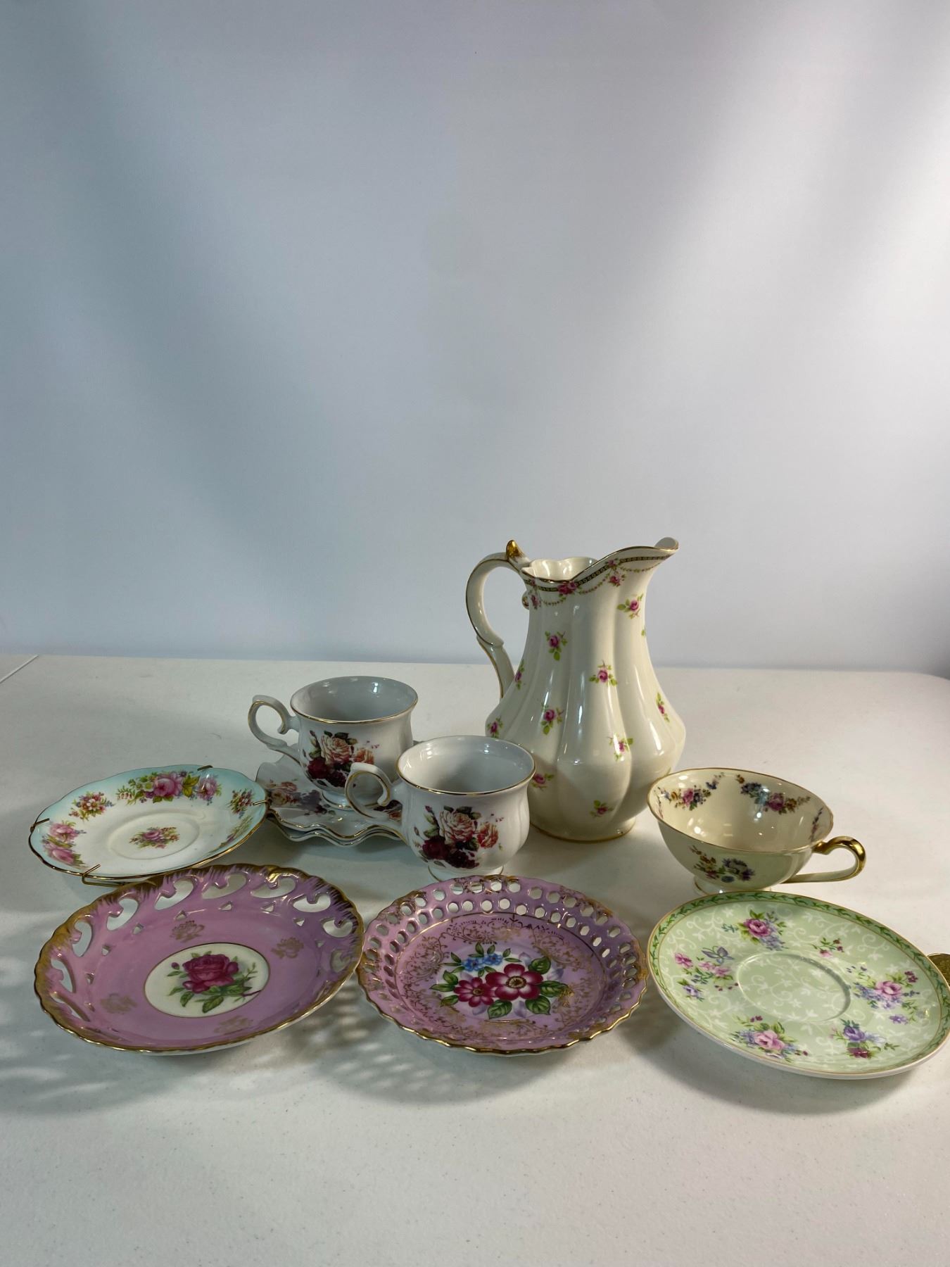 Selection of vintage floral porcelain including a tall cream pitcher, decorative saucers, and cups with pastel tones and gold trim. Mixed makers. Lovely display grouping with minor wear typical of age.